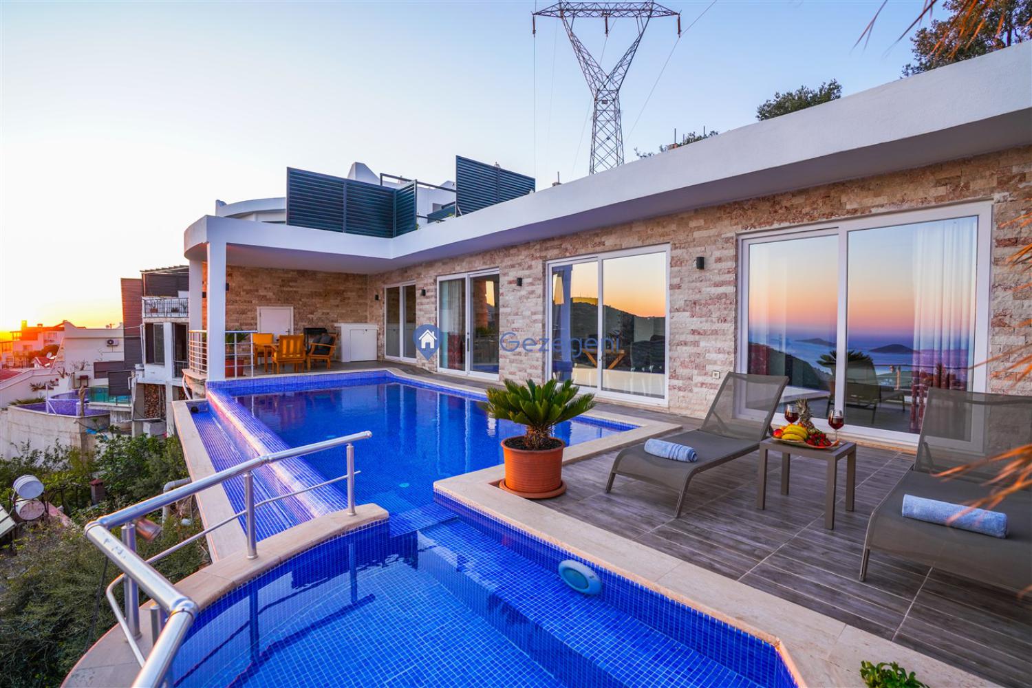 Kalkan merkeze yakın konumda bulunan lüks tasarıma sahip 4 odalı ve deniz manzaralı kiralık tatil villası
