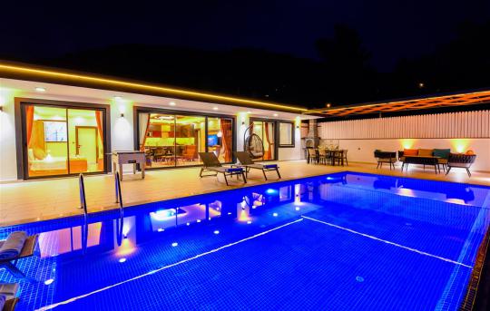 Kalkan'ın Üzümlü mevkiinde bulunan 2 yatak odalı 4 kişilik konaklama kapasitesine sahip jakuzili ve havuzu korunaklı kiralık villa