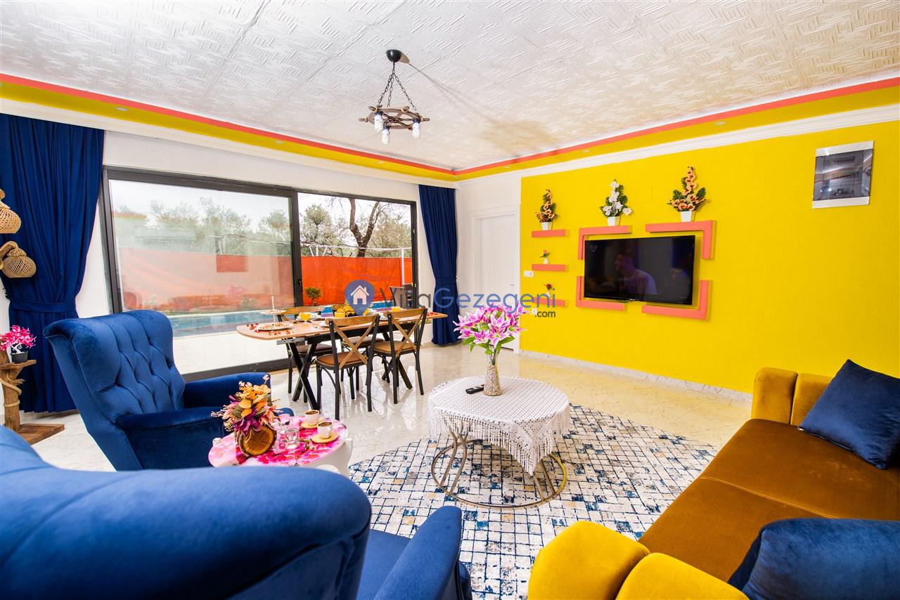 Kalkan Üzümlü bölgesinde yer alan 2 yatak odalı, markete ve restauranta yakın, havuzu korunaklı, jakuzili, doğa içerisinde muhafazakar kiralık aile ve balayı villası.
