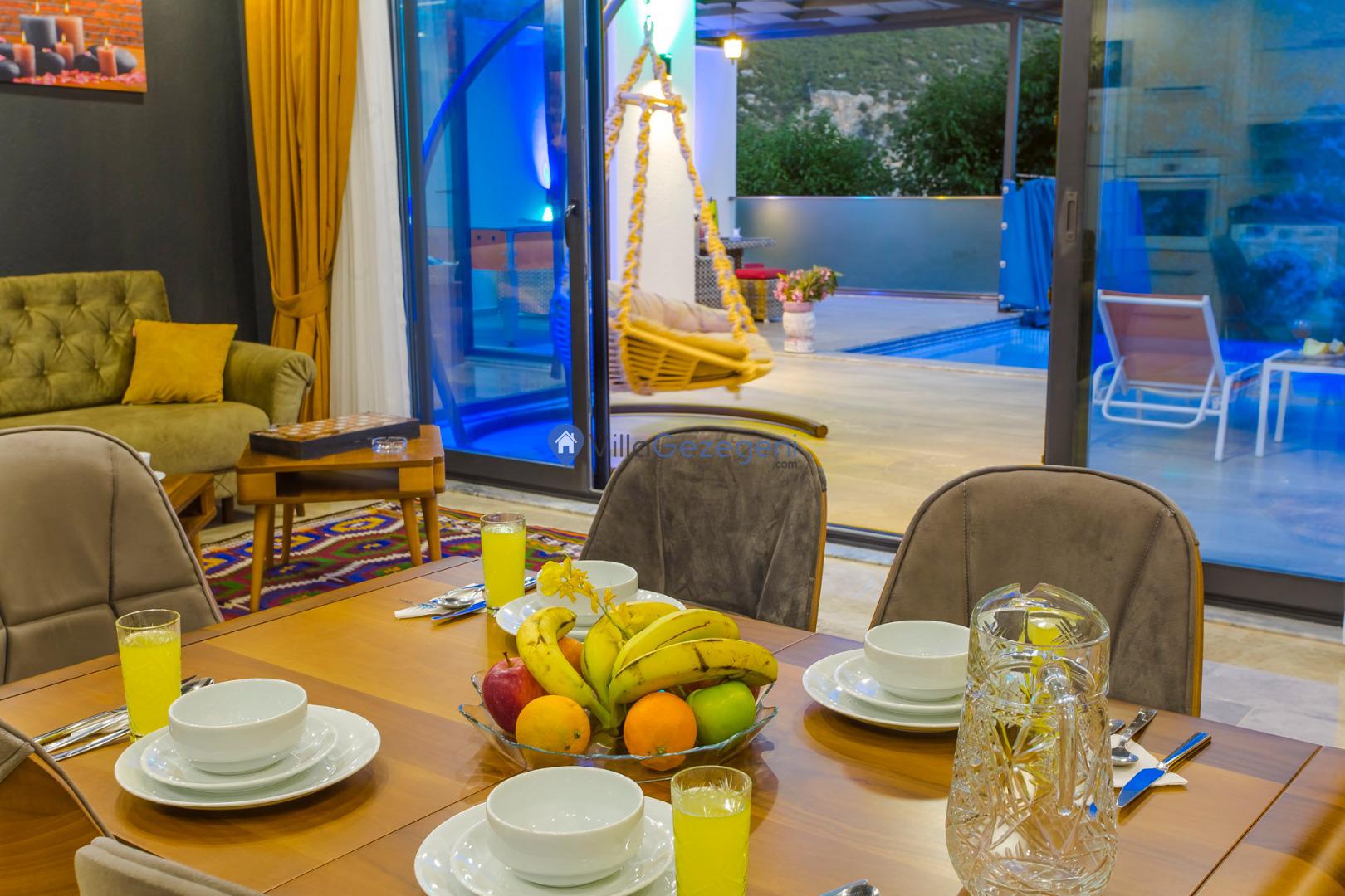 Yemek Masası ve bahçe mobilyaları kullanımınız için hazır bulunmaktadır sevdikleriniz ile beraber yemekler yiyip sohbetin dibine vurabilirsiniz. Villanın bahçesindeki salıncak ile keyifli vakitler geçirebilirsiniz.