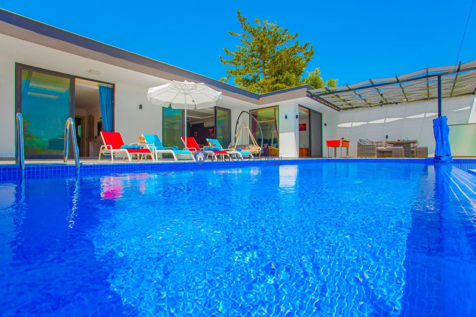Villamızın genel konsept ve özelliklerinden tekrar bahsedecek olursak; villamızın 1 adet müstakil özel havuzu bulunmaktadır. Ortalama bir bahçeye sahip olan villamız rahatlığı ön planda tutan 1 adet yatak odası, 1 yatak,1 banyo, hareket alanı geniş bir mutfak ve 2 kişinin geniş aralıklarla rahatlıkla oturabileceği koltuklara sahip salonu bulunmaktadır.