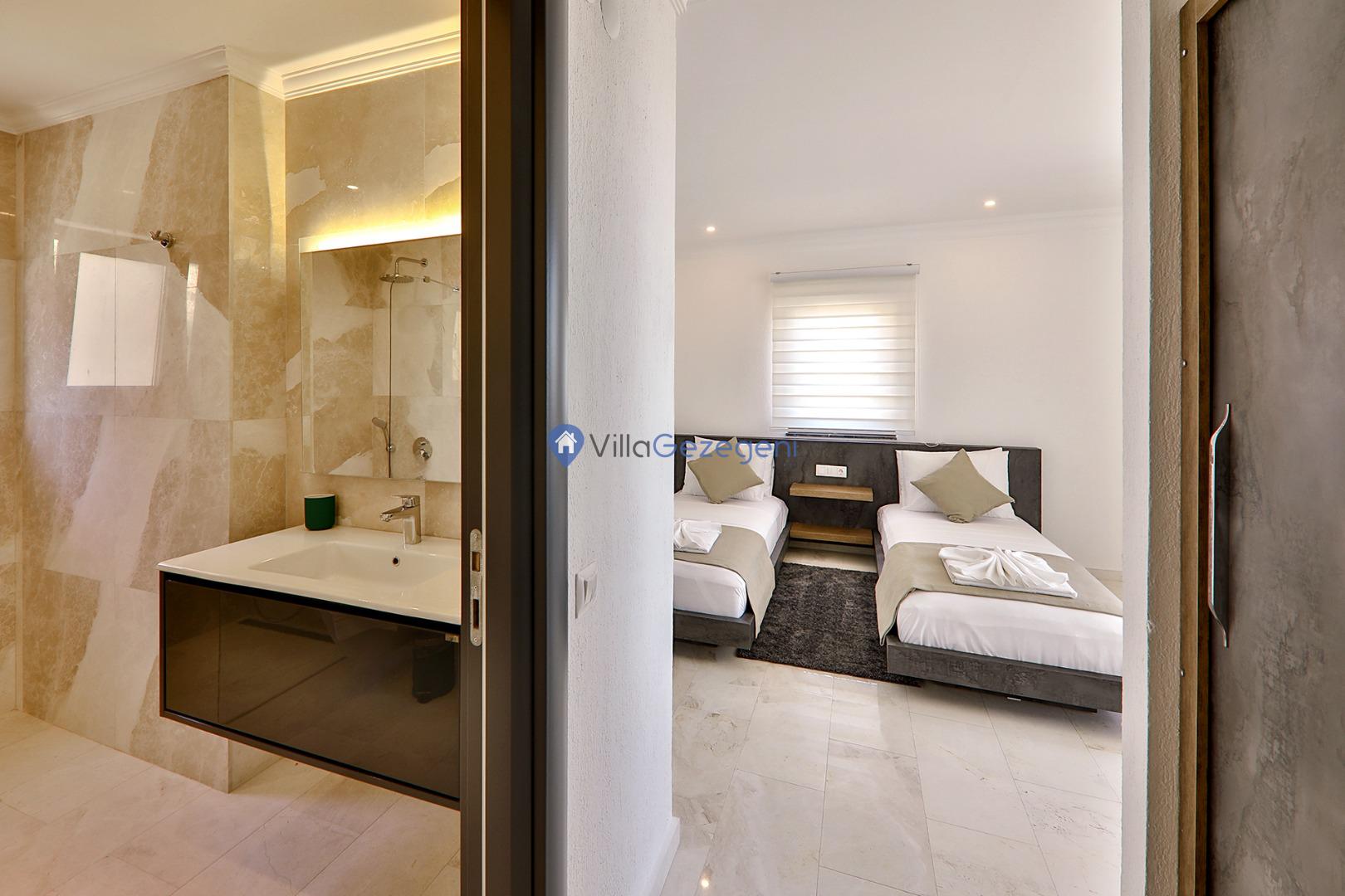 Kalkan Kızıltaş bölgesinde yer alan 3 yatak odalı 6 kişilik deniz manzaralı Geniş Aile kiralık villası.