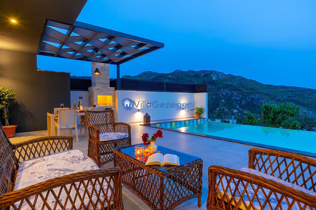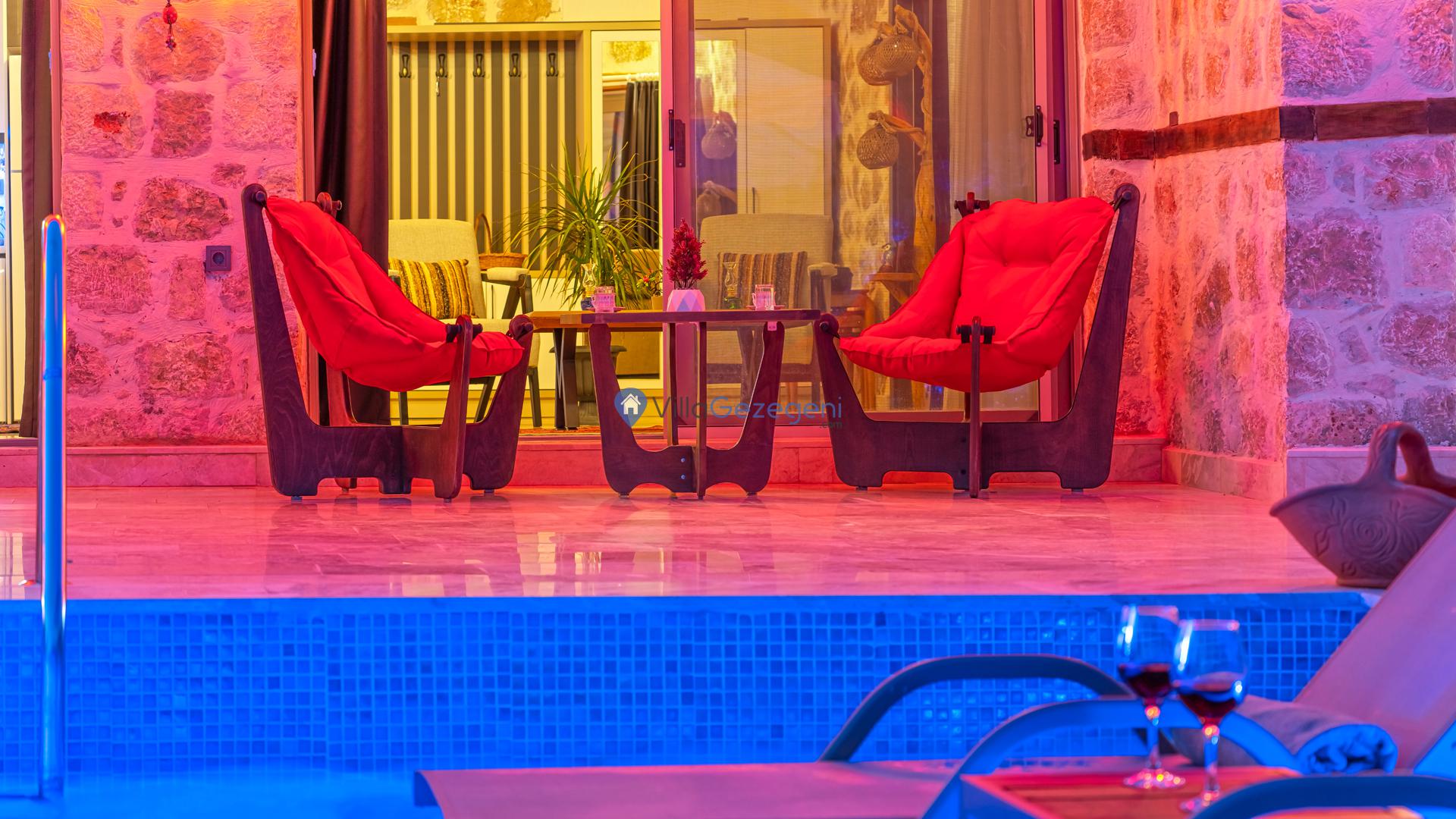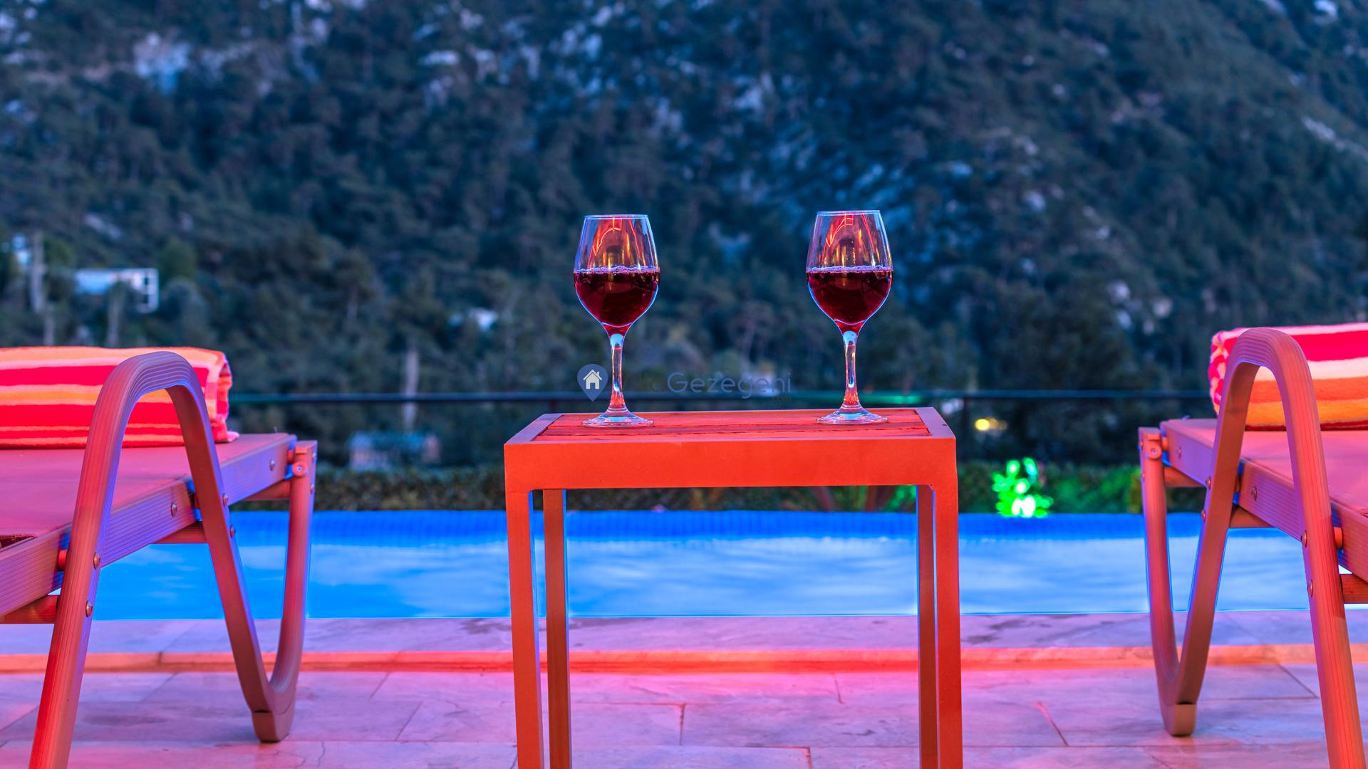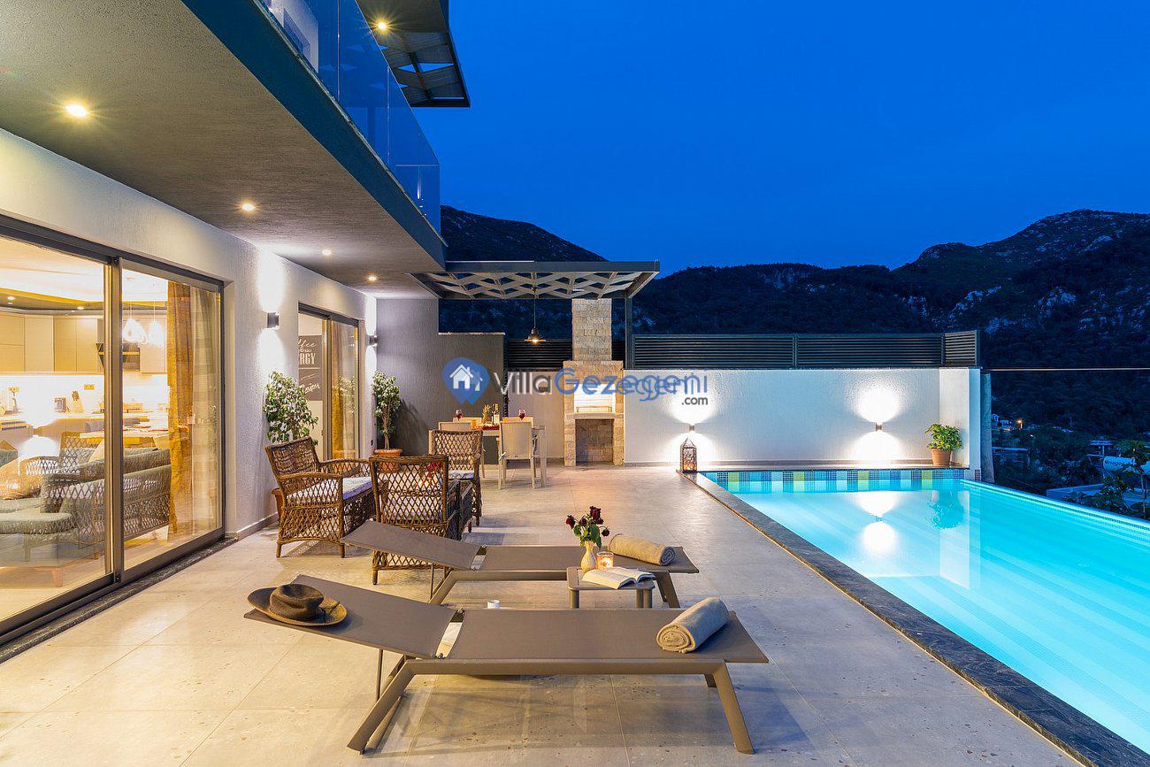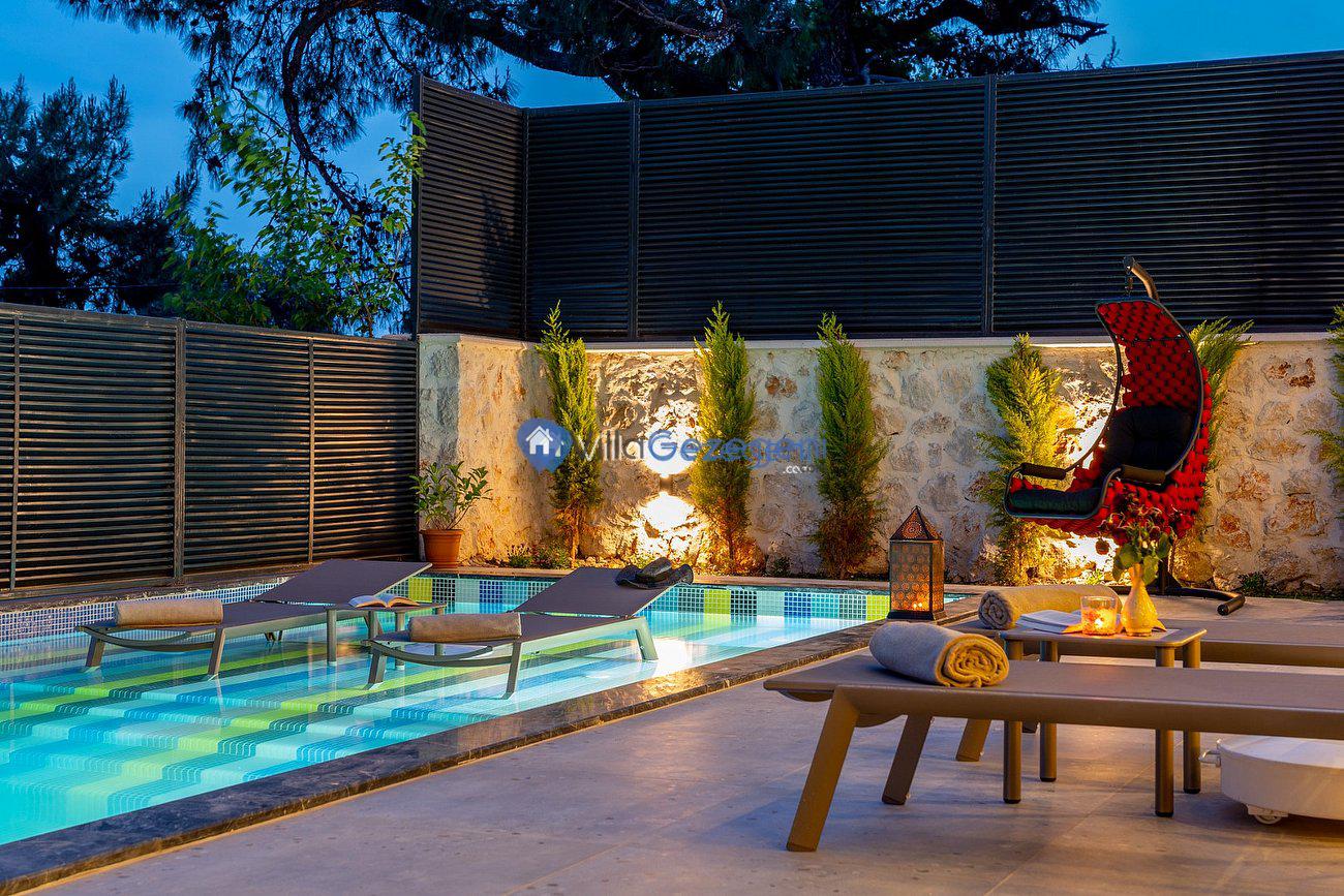 Bu villanın havuz terası, doğayla iç içe, tamamen korunaklı yapısıyla mahremiyet arayan misafirler için huzurlu ve konforlu bir alan sunar. Dışarıdan görünmeyecek şekilde tasarlanmış bu özel teras, hem güvenli hem de özgürce vakit geçirebileceğiniz bir ortam sağlar.
