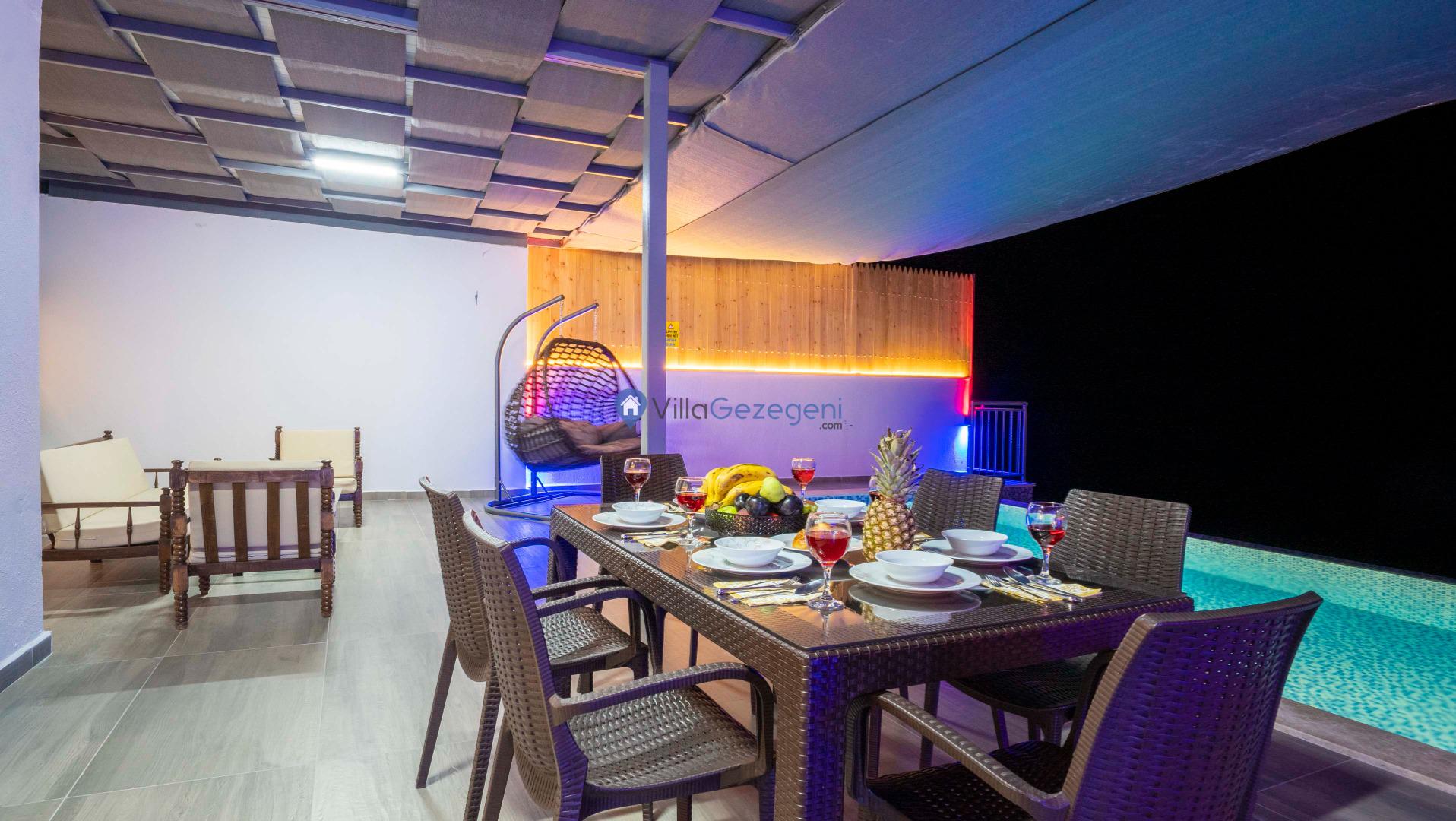 Yemek Masası ve bahçe mobilyaları kullanımınız için hazır bulunmaktadır sevdikleriniz ile beraber yemekler yiyip sohbetin dibine vurabilirsiniz. Villanın bahçesindeki salıncak ile keyifli vakitler geçirebilirsiniz.