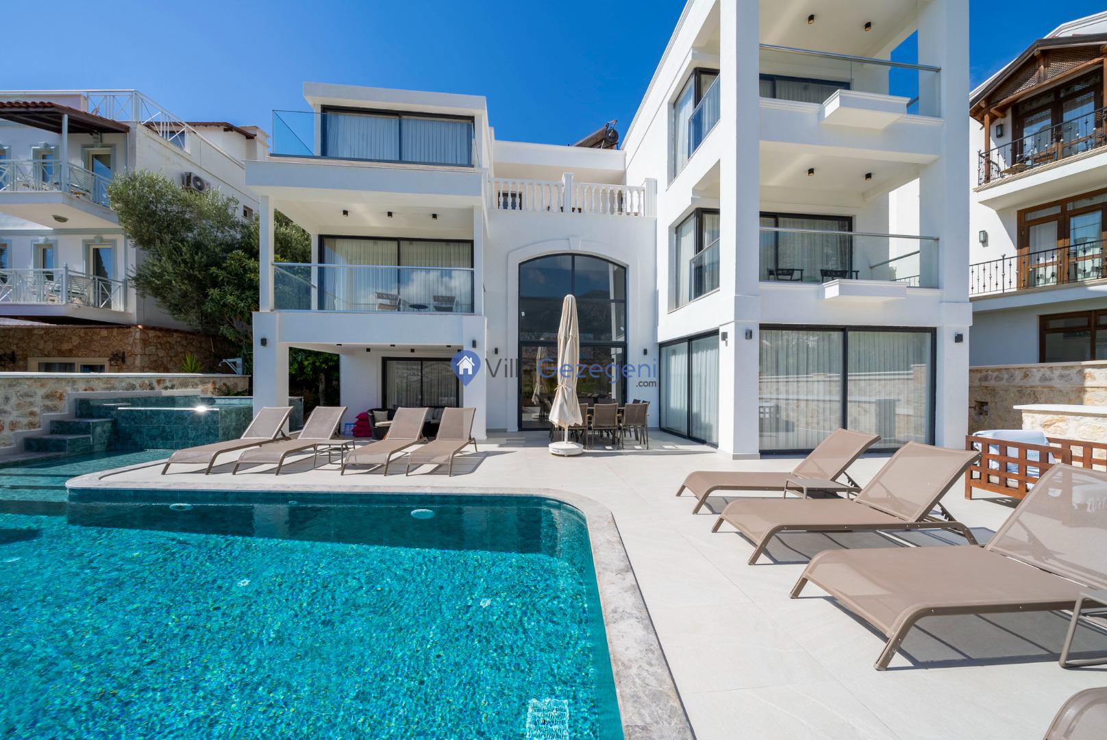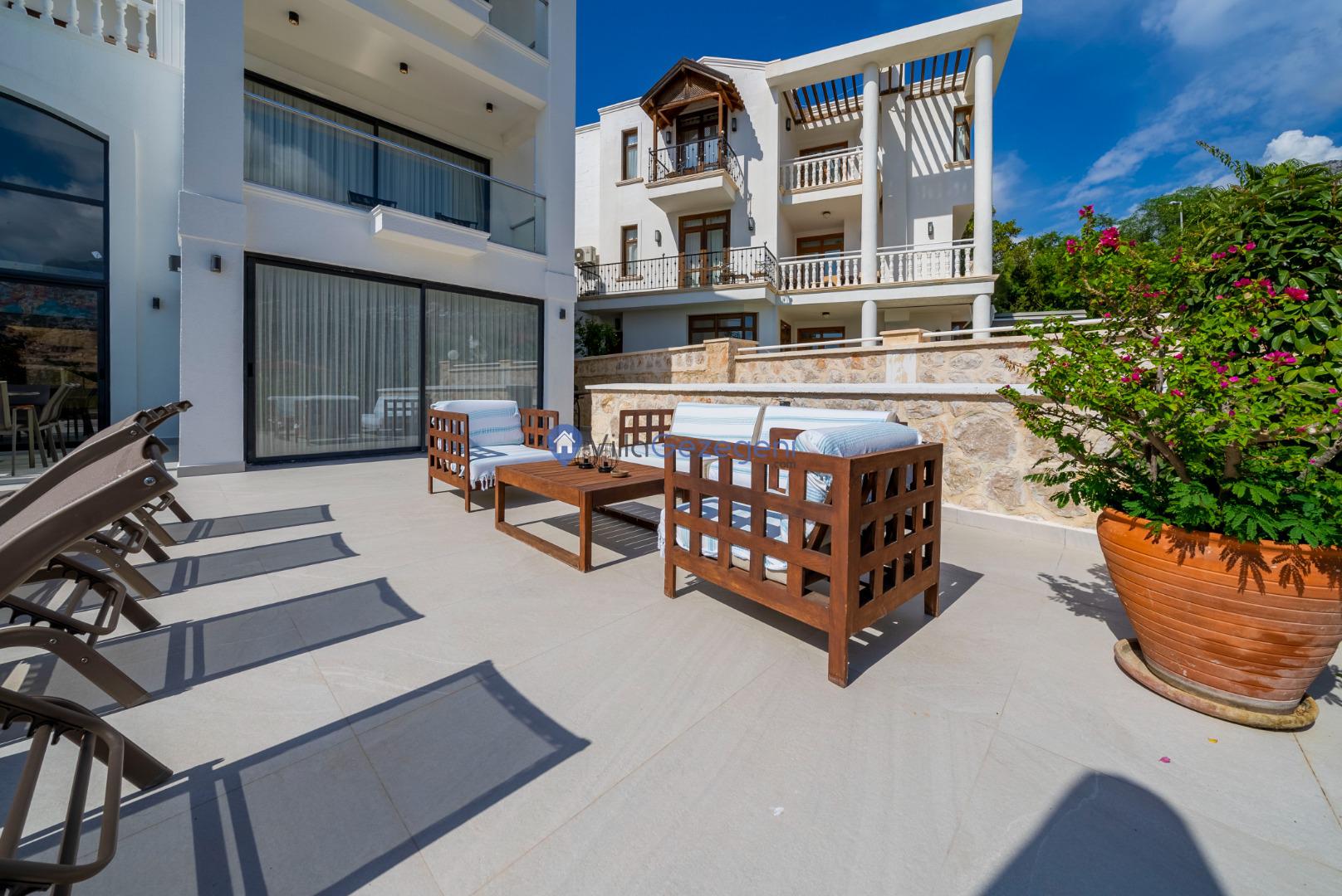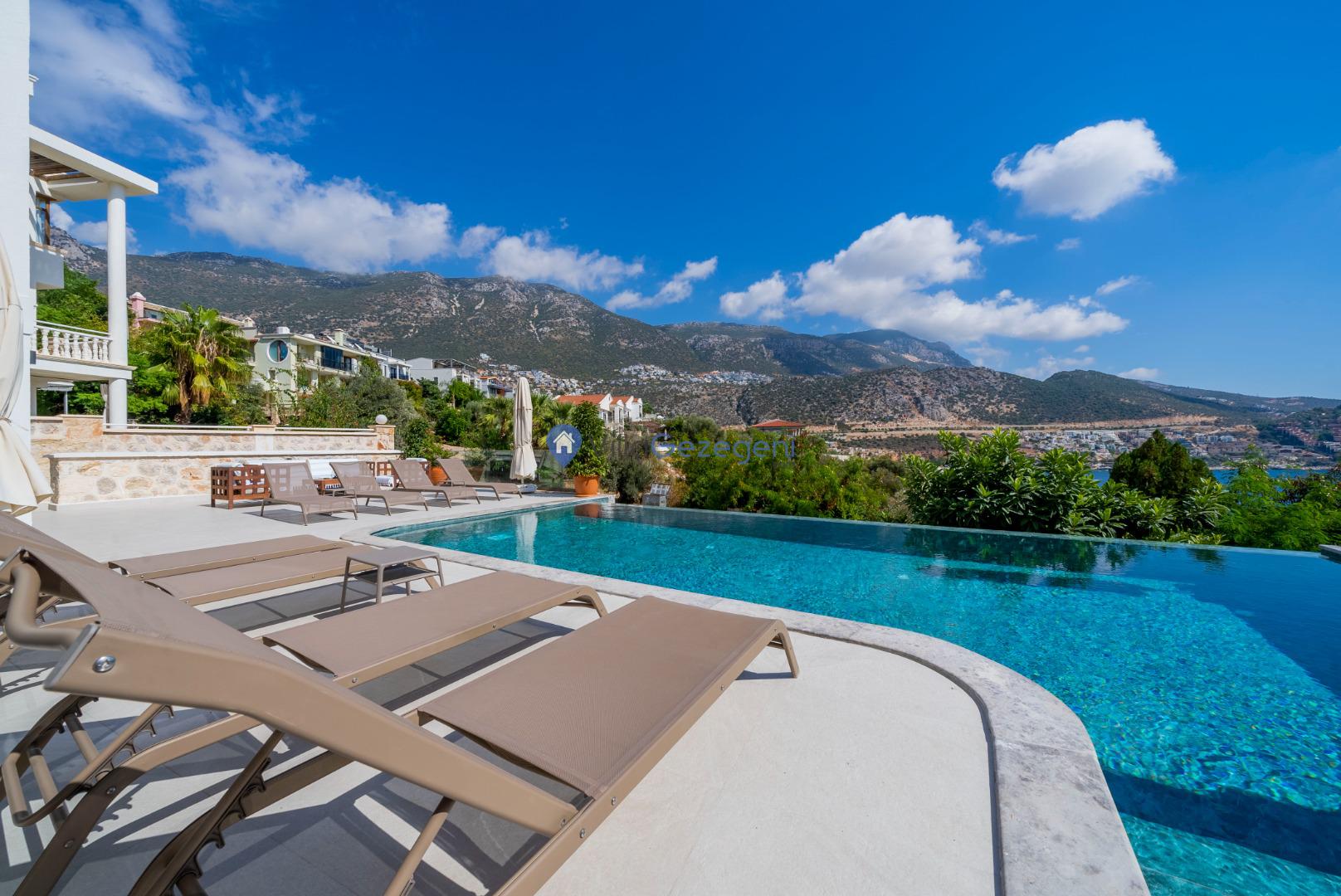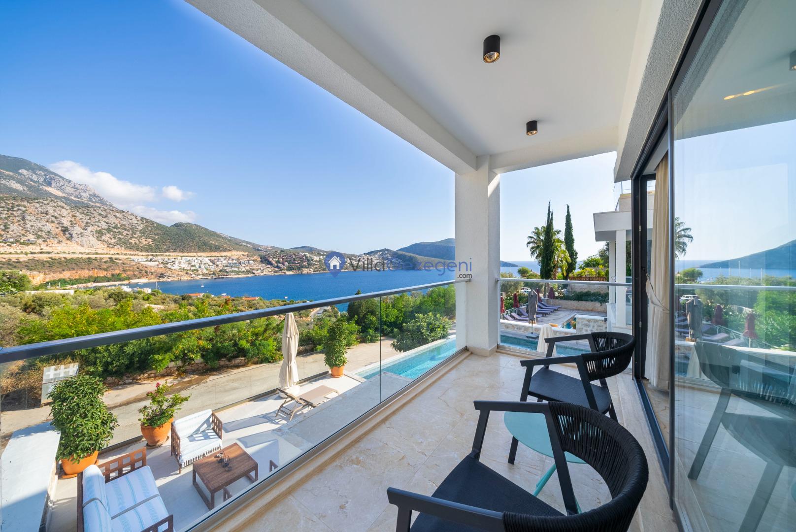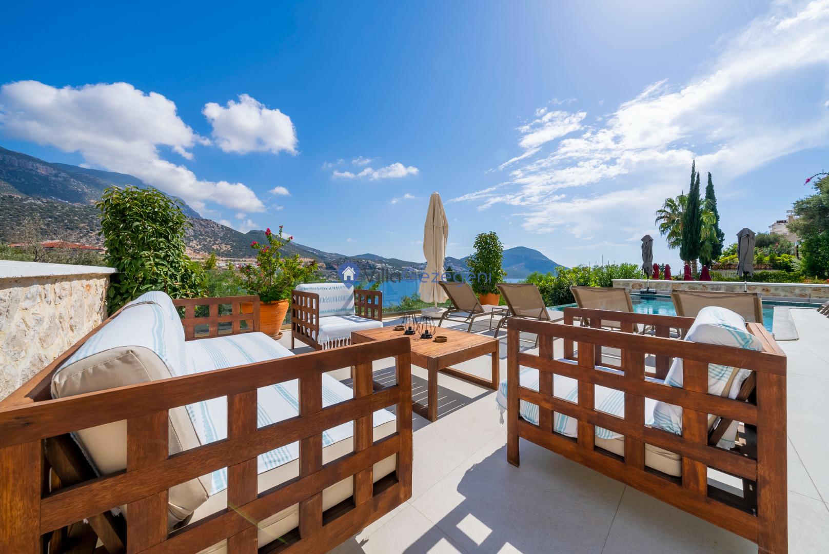 Kaş/Kalkan/Merkez Mevkiinde yer alan 5 yatak odalı 10 kişi kapasiteli deniz manzaralı geniş aile ve arkadaş grupları için uygun kiralık tatil villası.