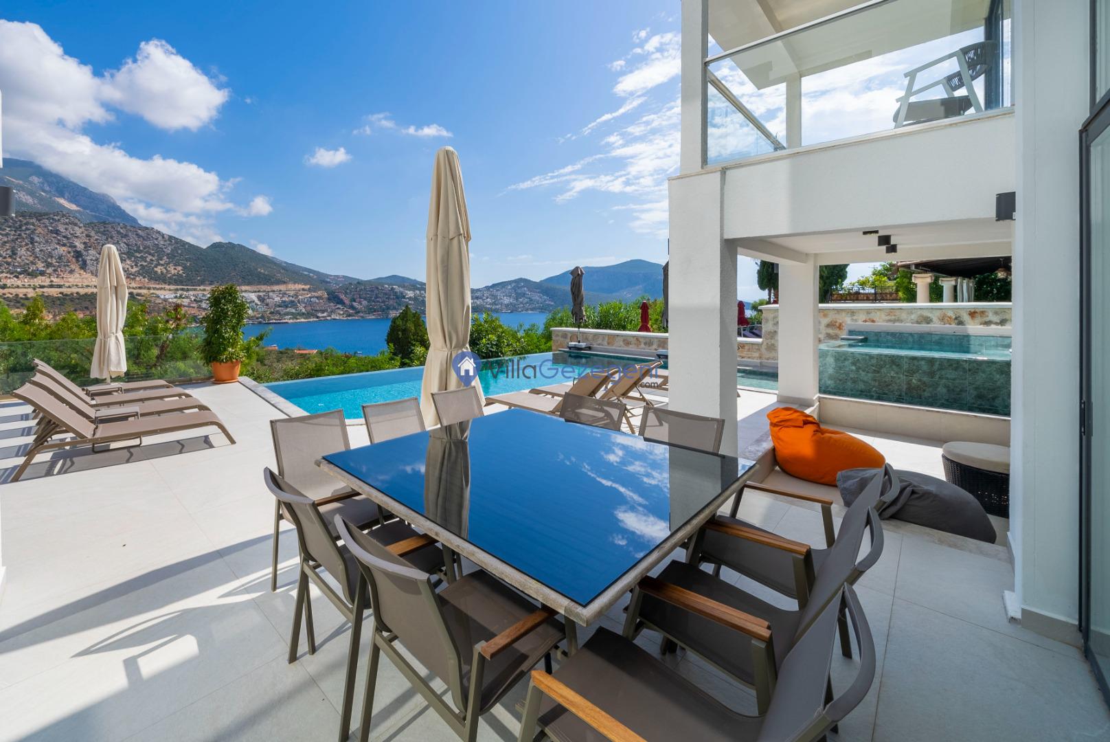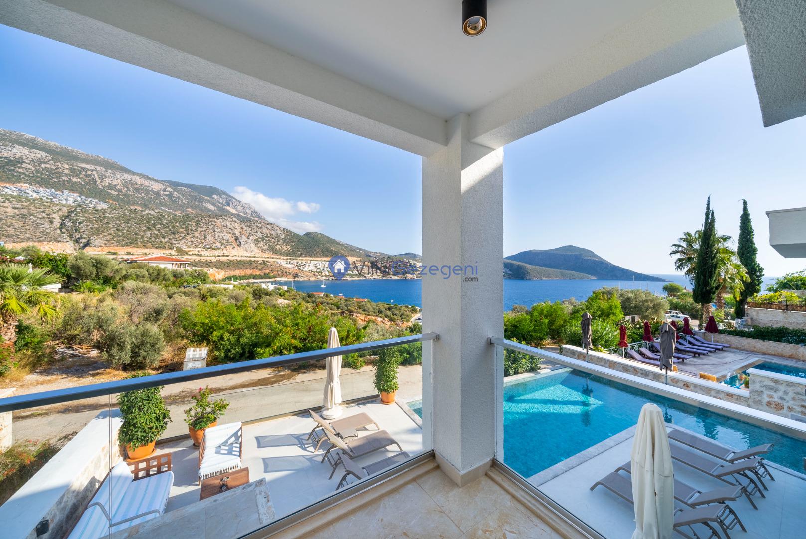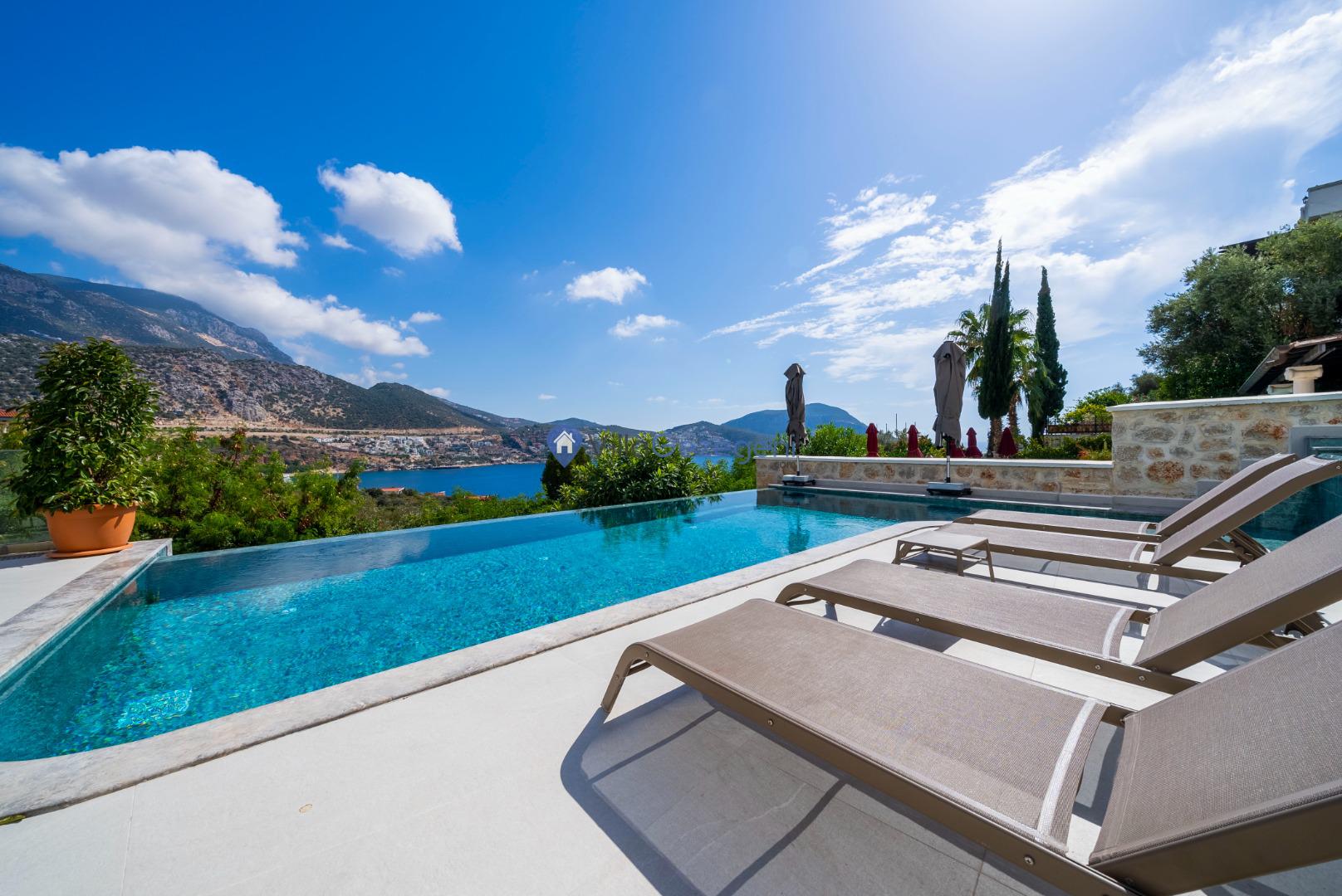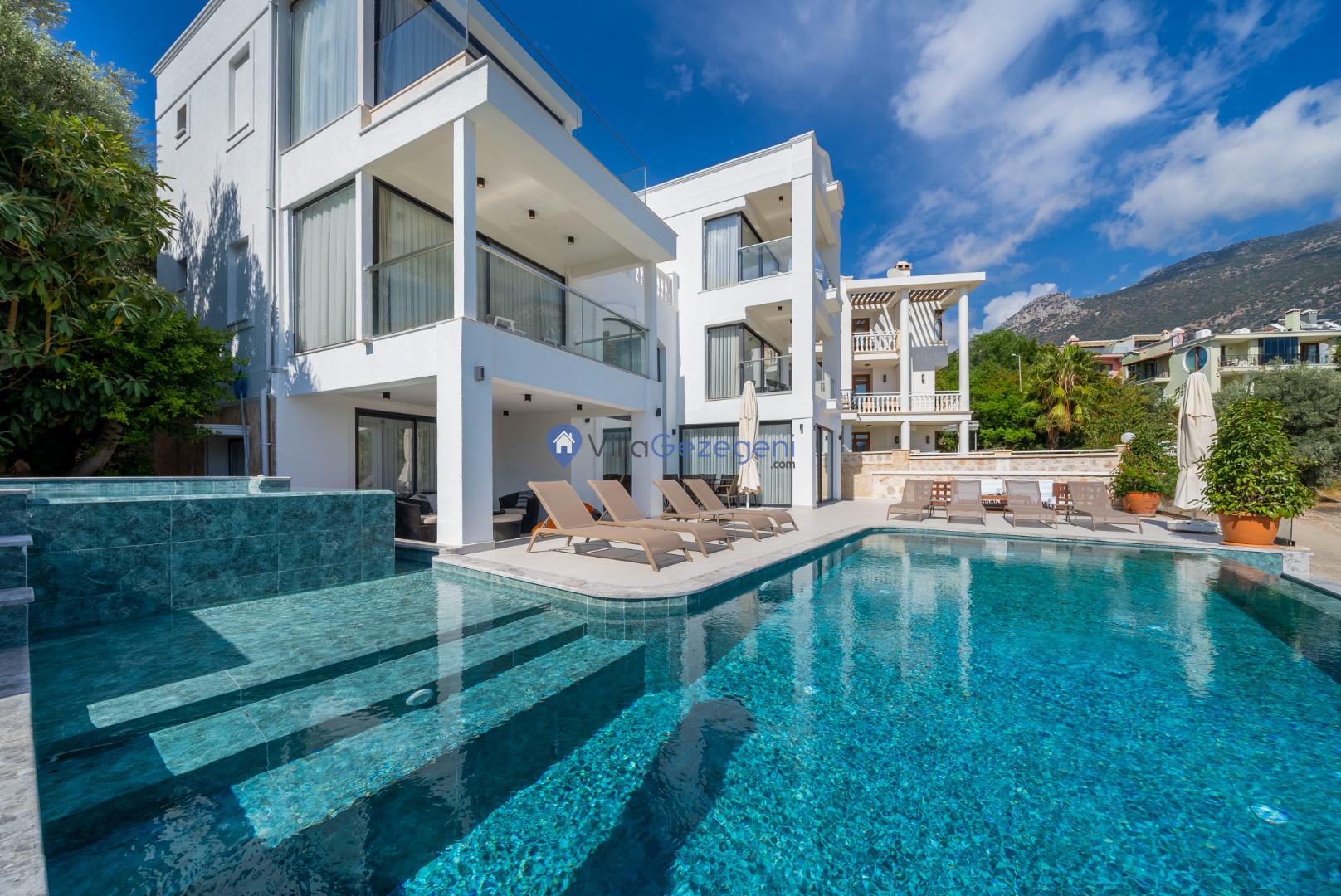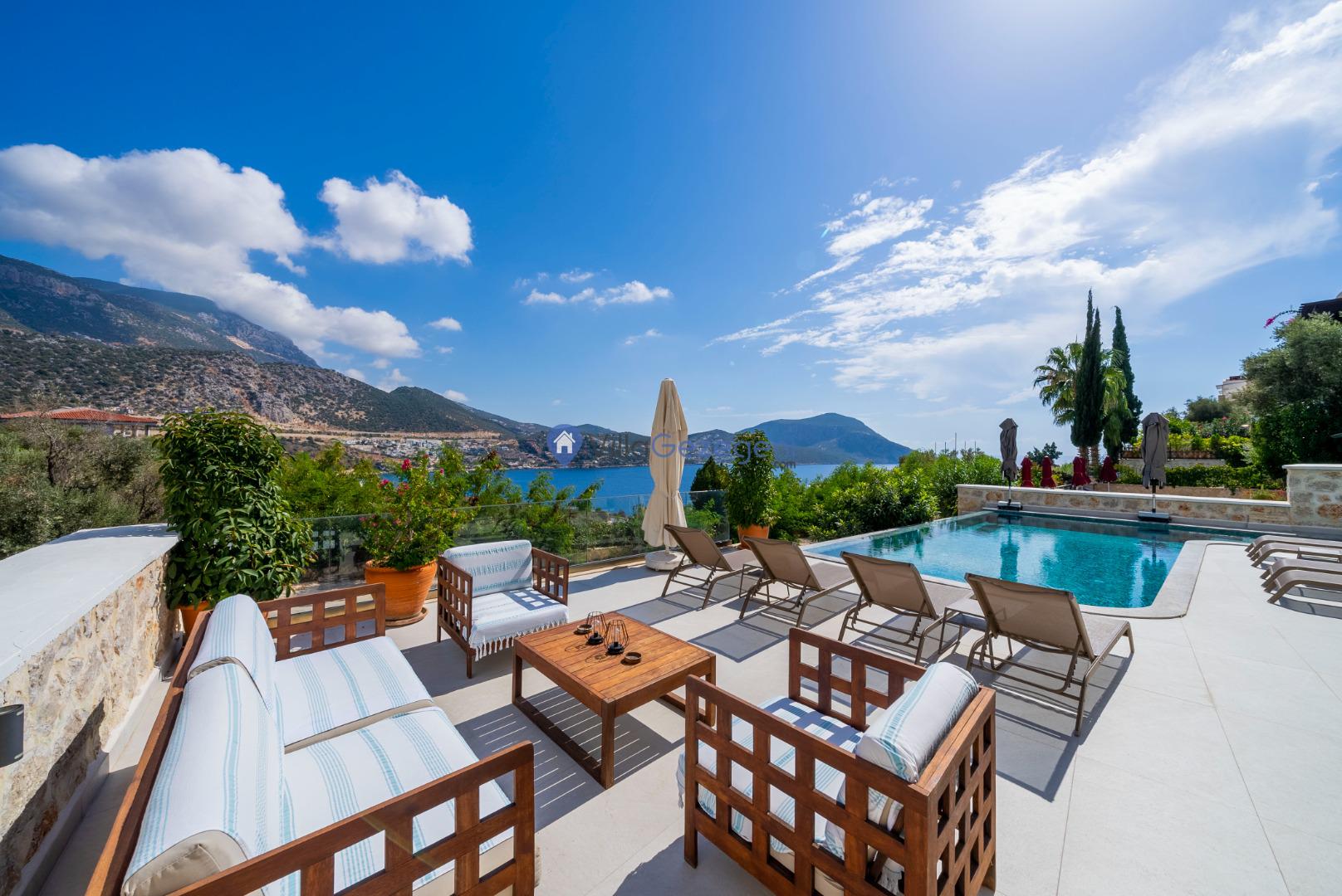 Kaş/Kalkan/Merkez Mevkiinde yer alan 5 yatak odalı 10 kişi kapasiteli deniz manzaralı geniş aile ve arkadaş grupları için uygun kiralık tatil villası.