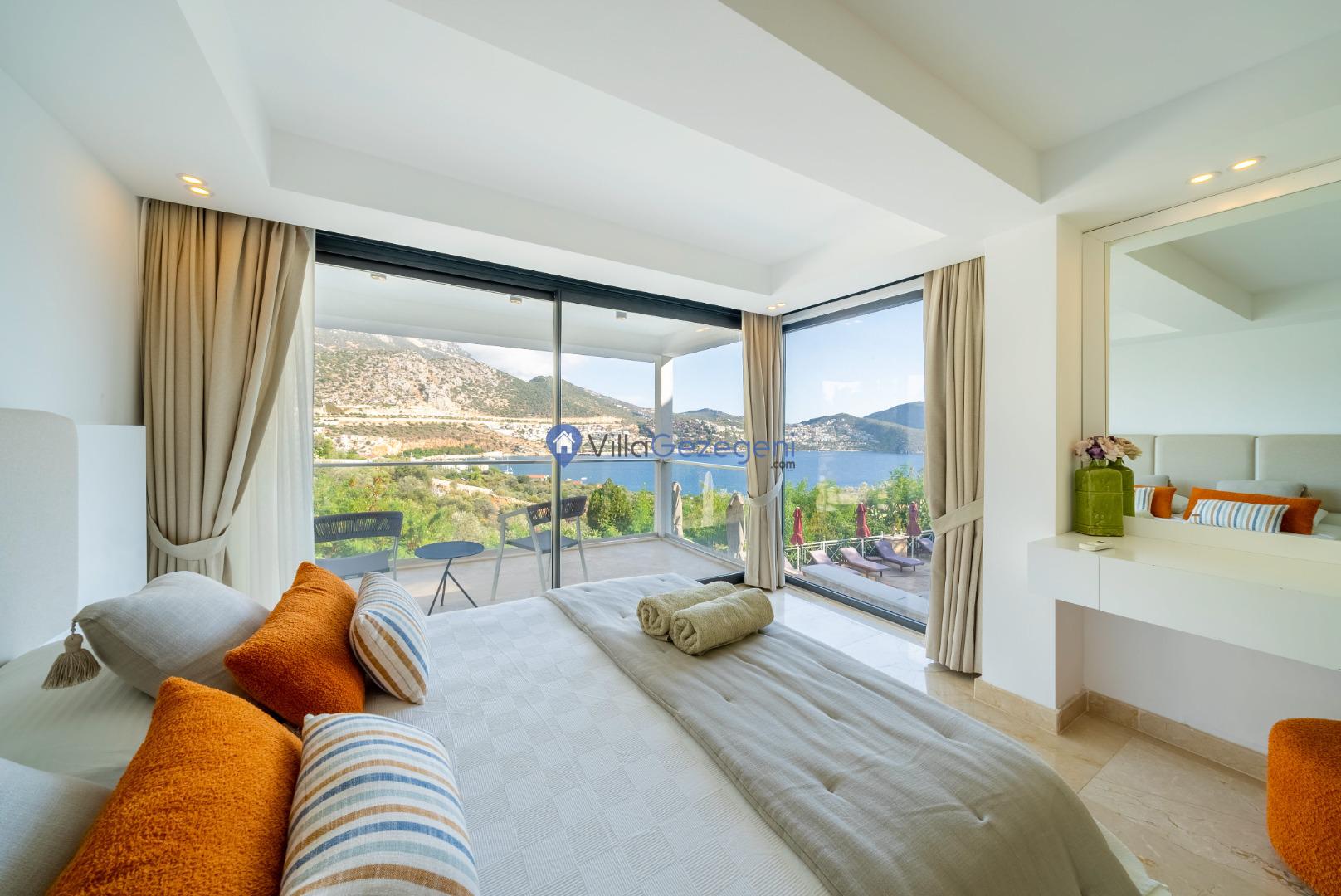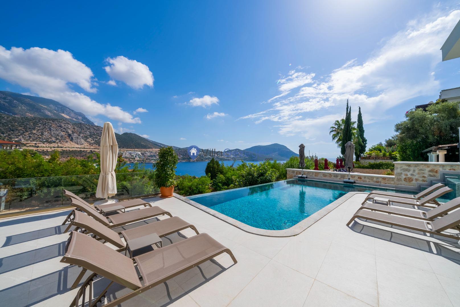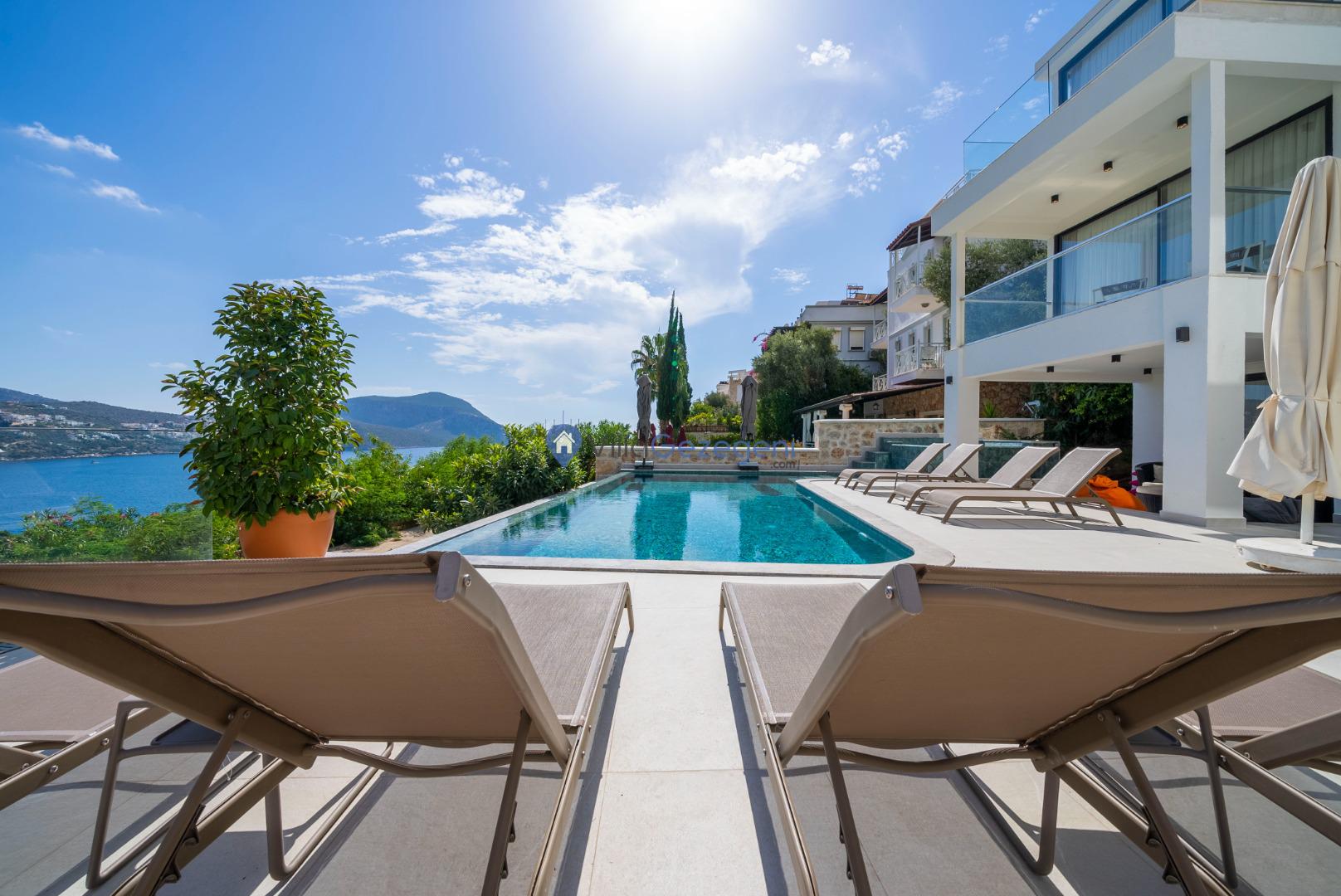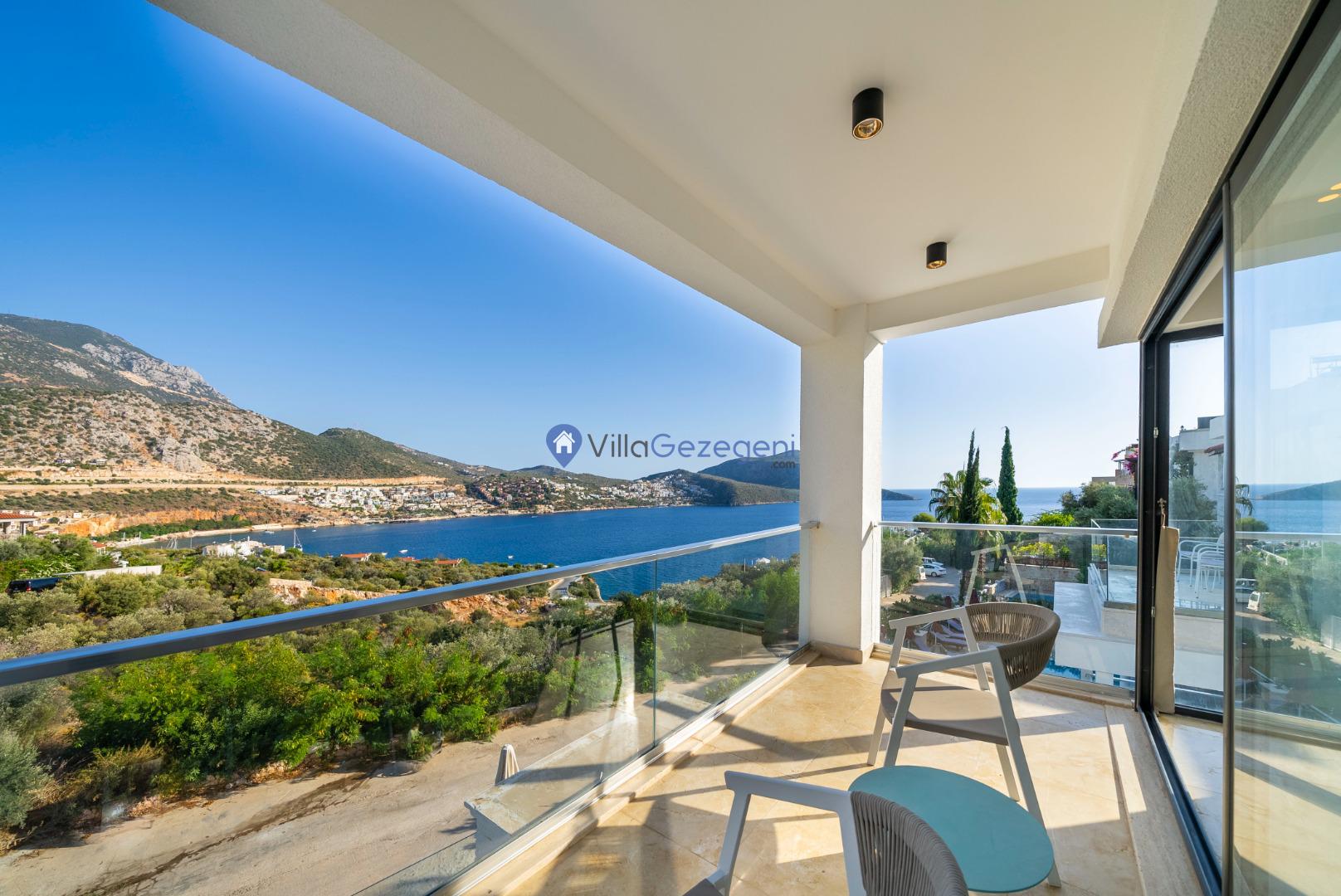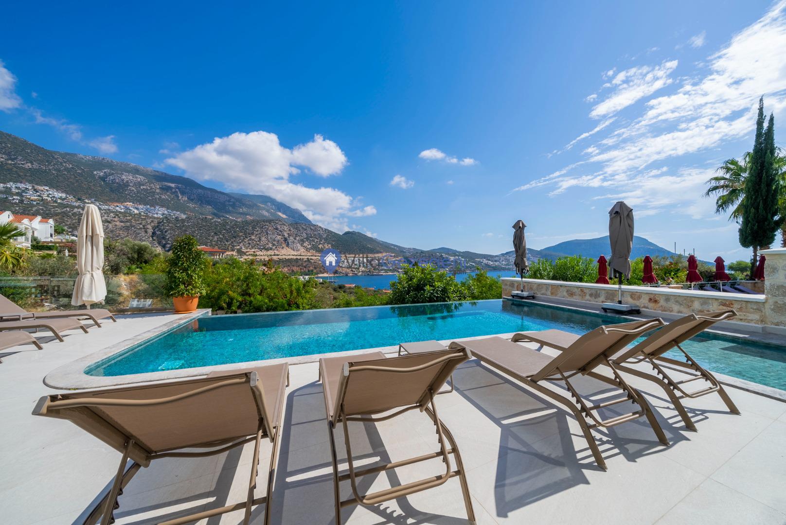 Kaş/Kalkan/Merkez Mevkiinde yer alan 5 yatak odalı 10 kişi kapasiteli deniz manzaralı geniş aile ve arkadaş grupları için uygun kiralık tatil villası.