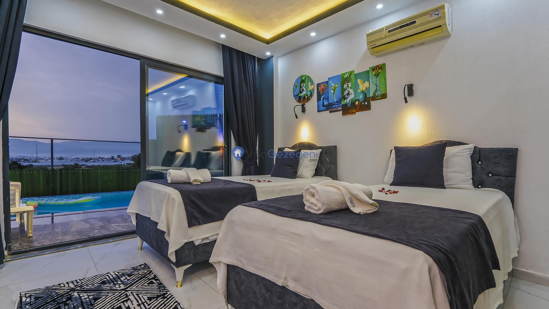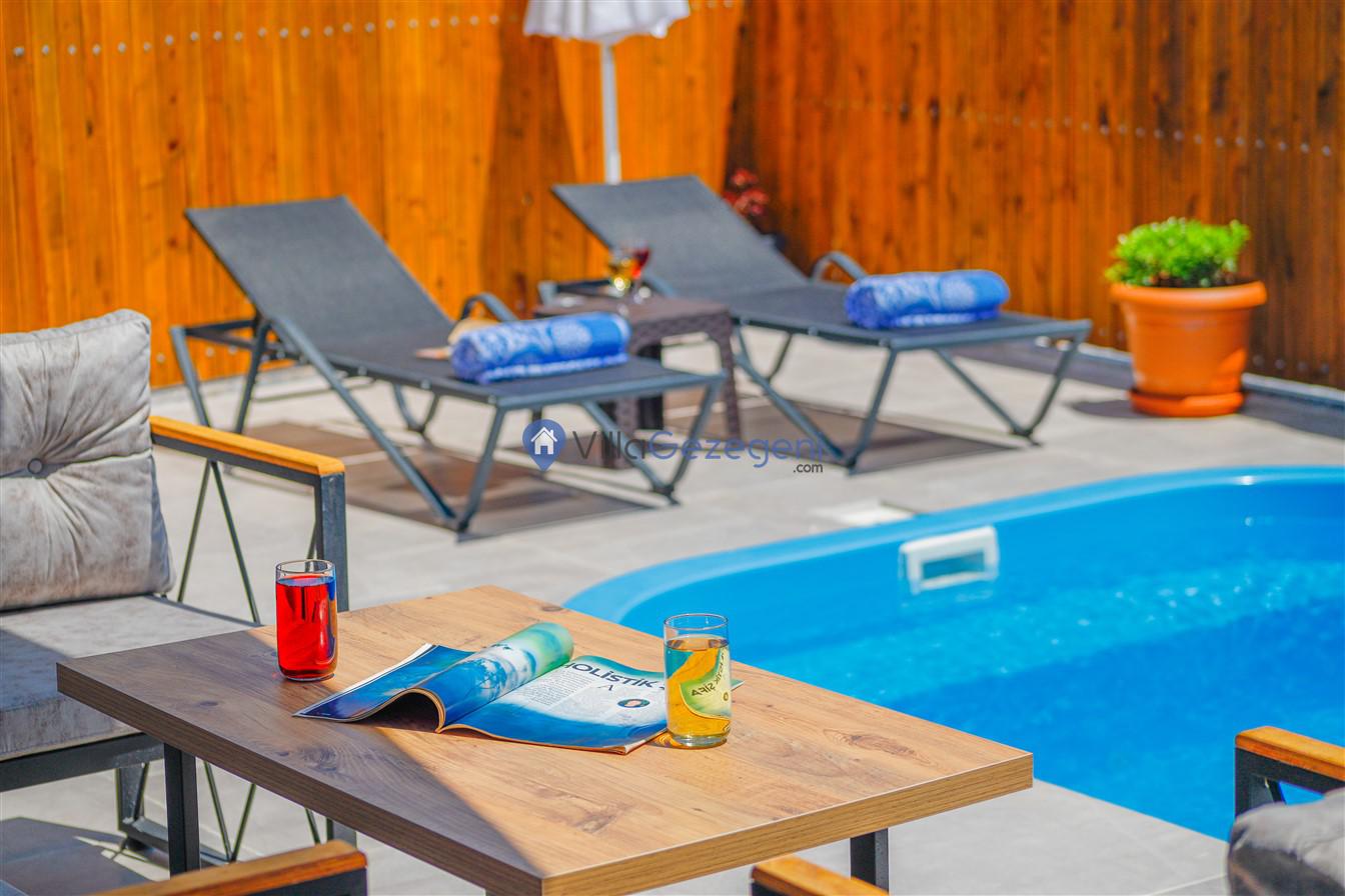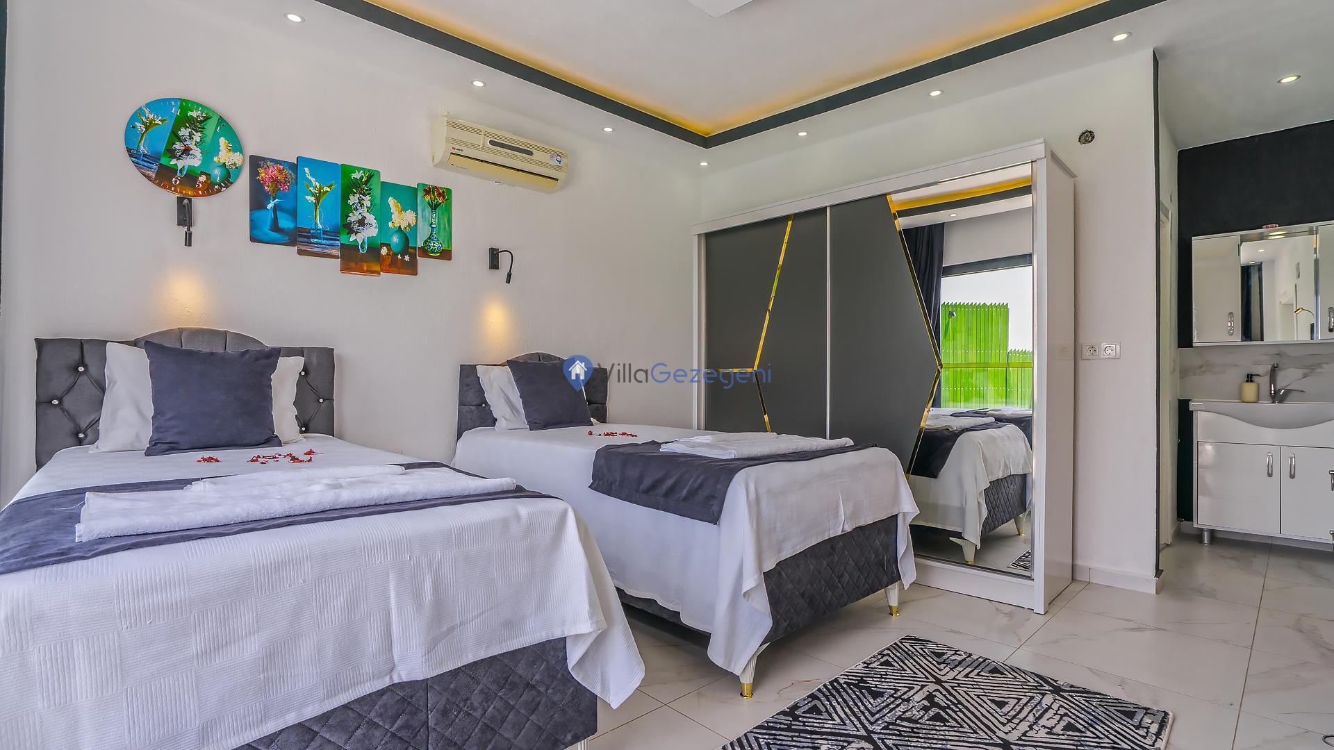 Villamızın genel konsept ve özelliklerinden tekrar bahsedecek olursak; villamızın 1 adet müstakil özel havuzu bulunmaktadır. Ortalama bir bahçeye sahip olan villamız rahatlığı ön planda tutan 2 adet yatak odası, 3 yatak, 2 banyo, hareket alanı geniş bir mutfak ve 4 kişinin geniş aralıklarla rahatlıkla oturabileceği koltuklara sahip salonu bulunmaktadır.
