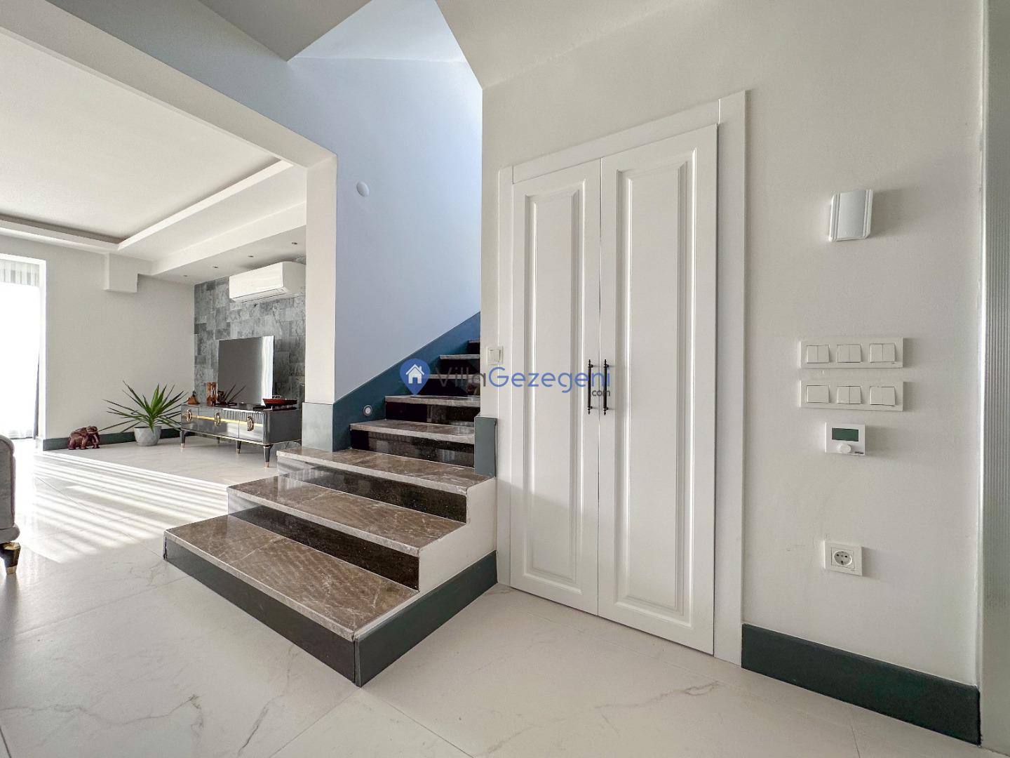 Villanın geniş ve ferah salonu, şık mobilyalar ve rahat oturma düzenlemeleriyle dikkat çekerken, tam donanımlı mutfak, yemek pişirme sürecini hem kolay hem de keyifli hale getirir. Mutfakta bulunan modern aletler ve geniş tezgah alanları, her türlü yemek hazırlığı için idealdir.
