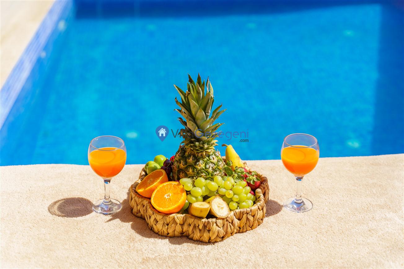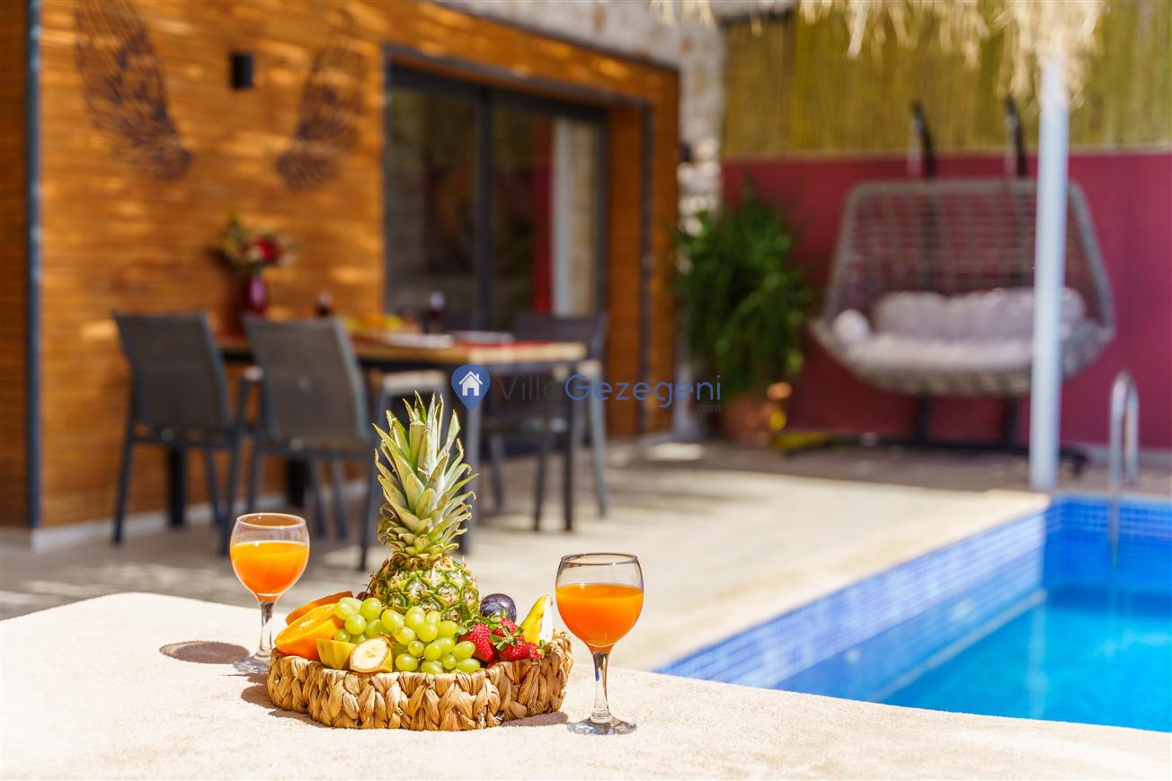 Villamızın genel konsept ve özelliklerinden tekrar bahsedecek olursak; villamızın 1 adet müstakil özel havuzu bulunmaktadır. Ortalama bir bahçeye sahip olan villamız rahatlığı ön planda tutan 1 adet yatak odası, 1 yatak, 1 banyo, hareket alanı geniş bir mutfak ve 2 kişinin geniş aralıklarla rahatlıkla oturabileceği koltuklara sahip salonu bulunmaktadır.