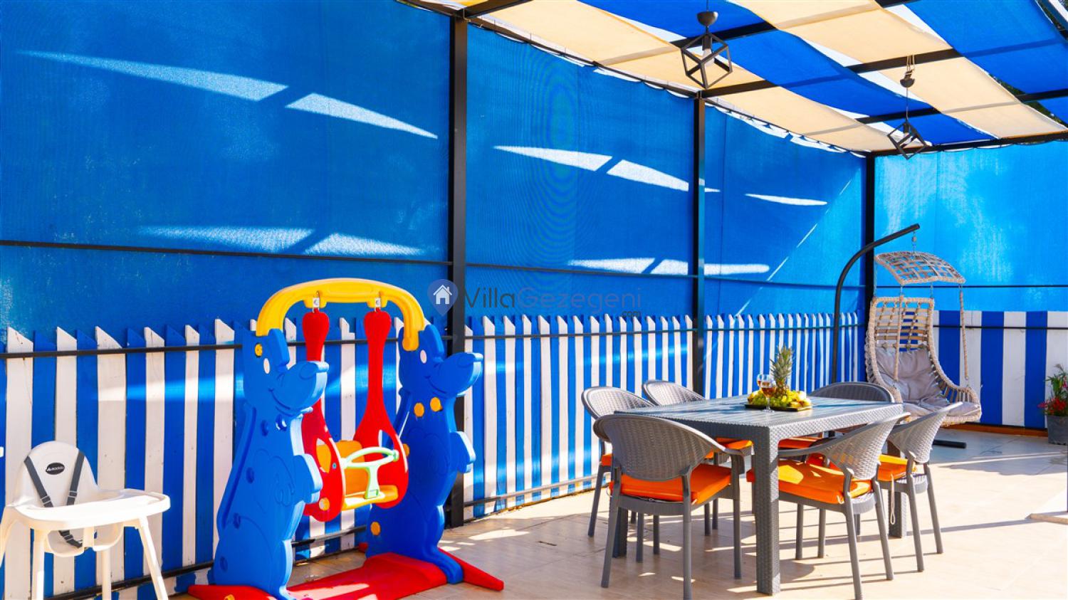 Yemek Masası ve bahçe mobilyaları kullanımınız için hazır bulunmaktadır sevdikleriniz ile beraber yemekler yiyip sohbetin dibine vurabilirsiniz. Villanın bahçesindeki salıncak ile keyifli vakitler geçirebilirsiniz.