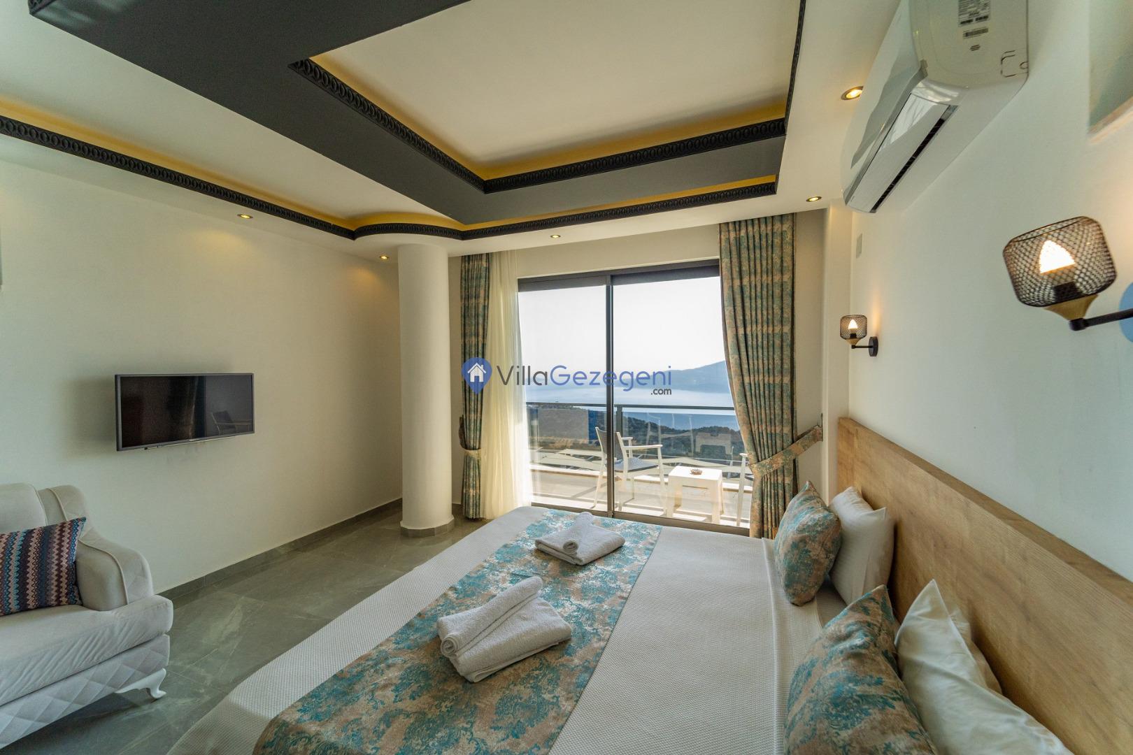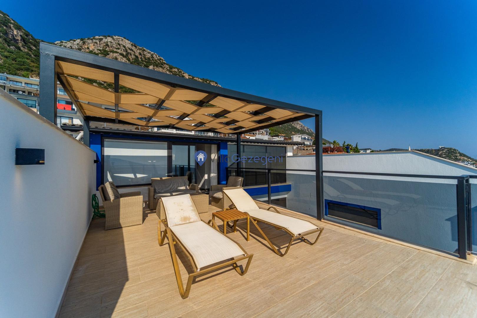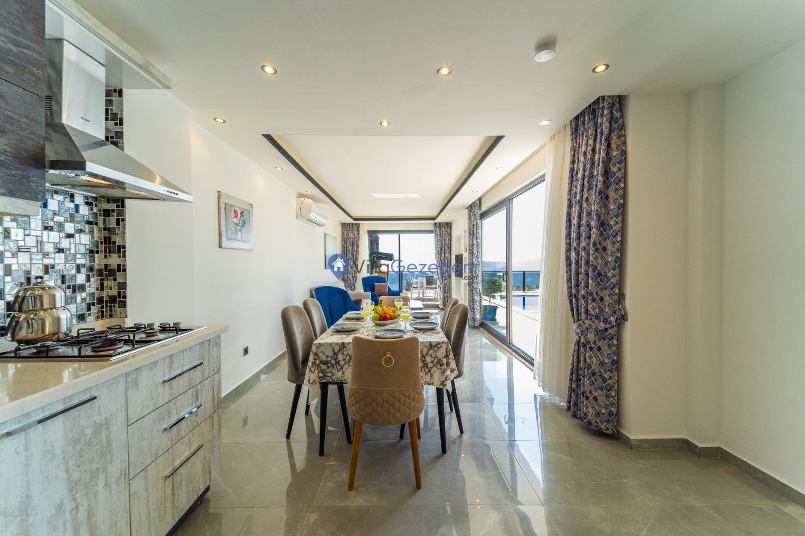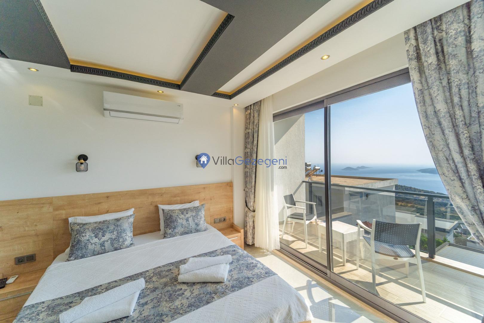 Kalkan Kördere Bölgesinde yer alan 3 yatak odalı 7 kişi kapasiteli deniz manzaralı şehir merkezine yakın kiralık tatil villası.