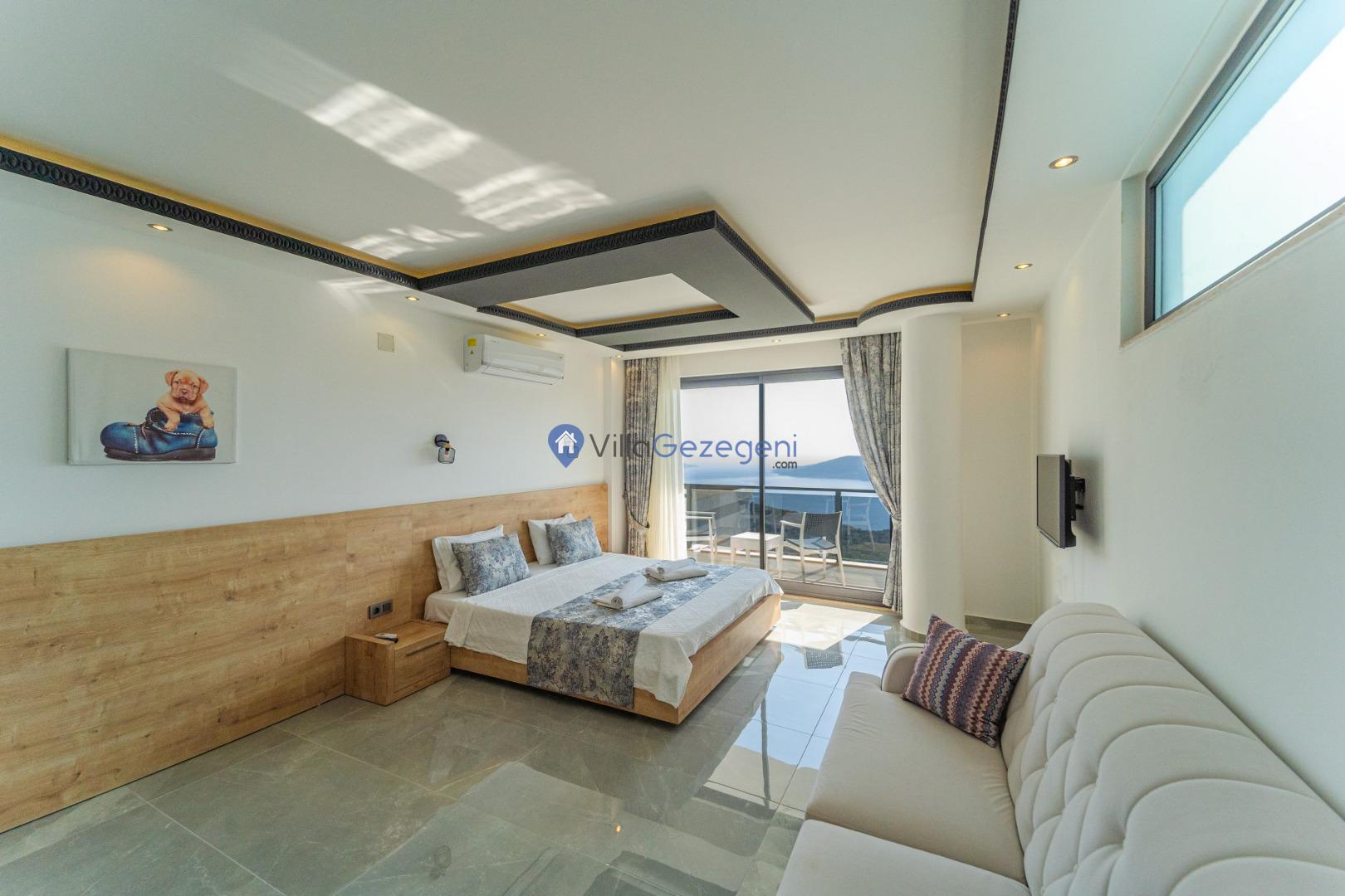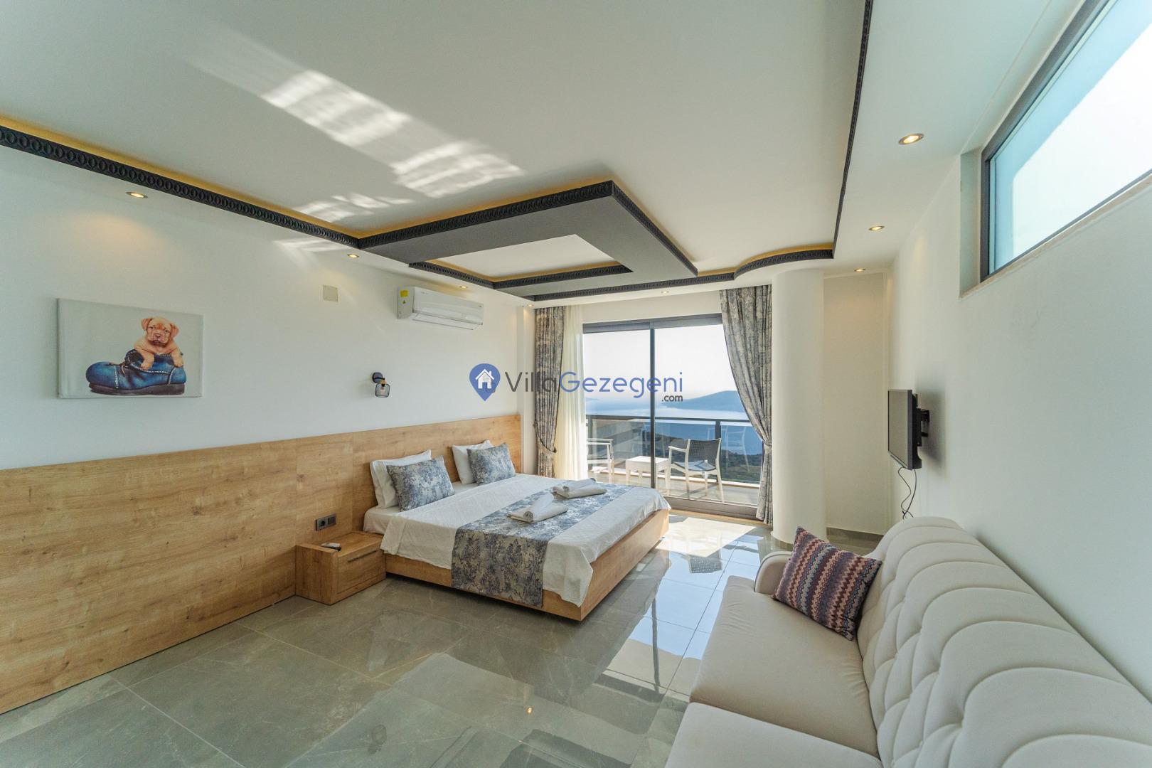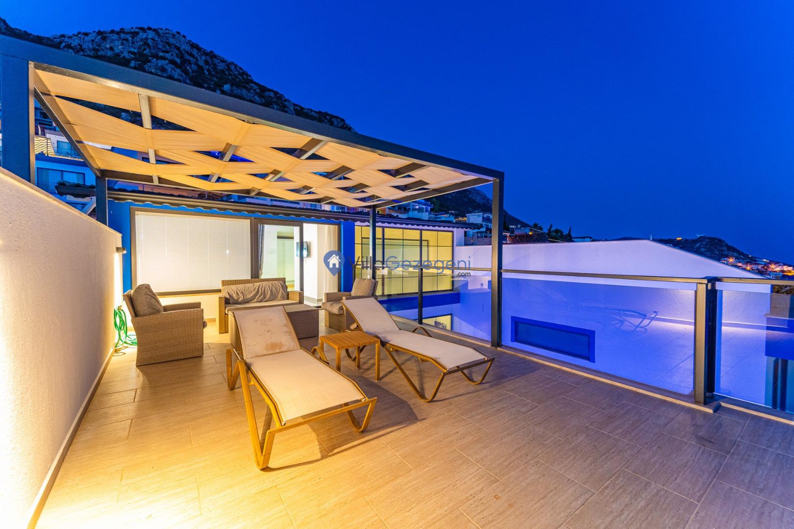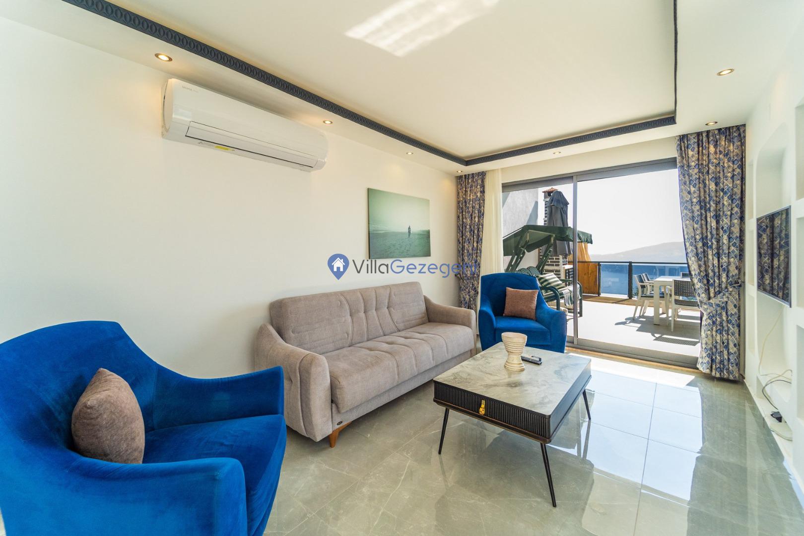 Kalkan Kördere Bölgesinde yer alan 3 yatak odalı 7 kişi kapasiteli deniz manzaralı şehir merkezine yakın kiralık tatil villası.