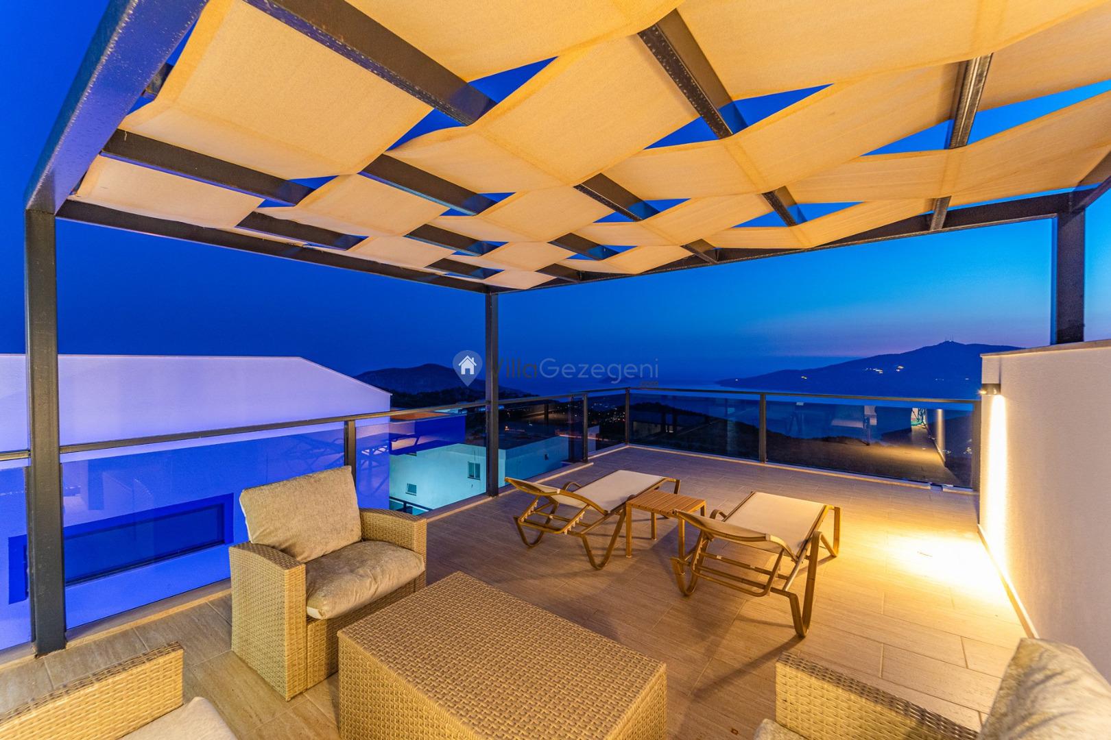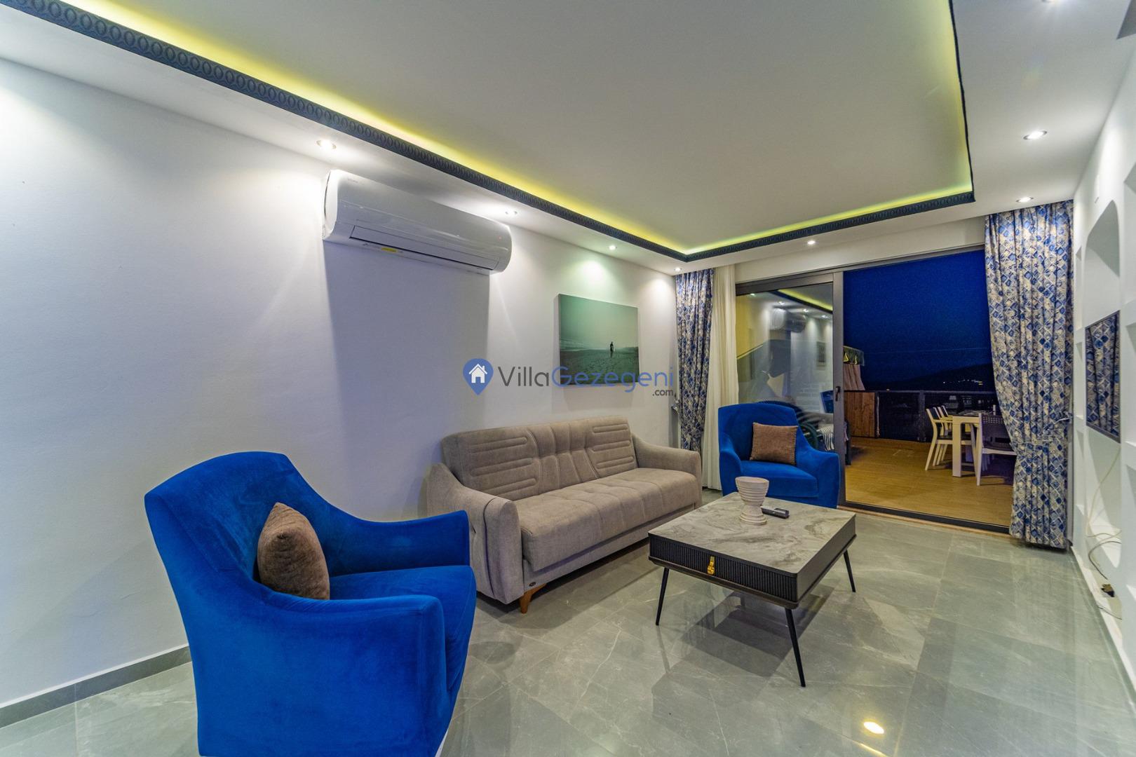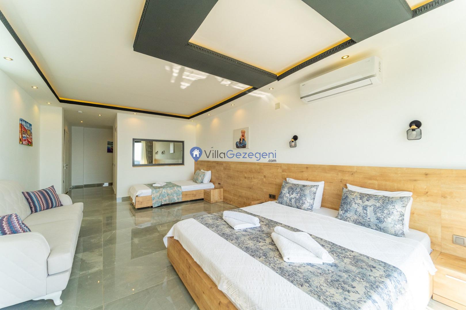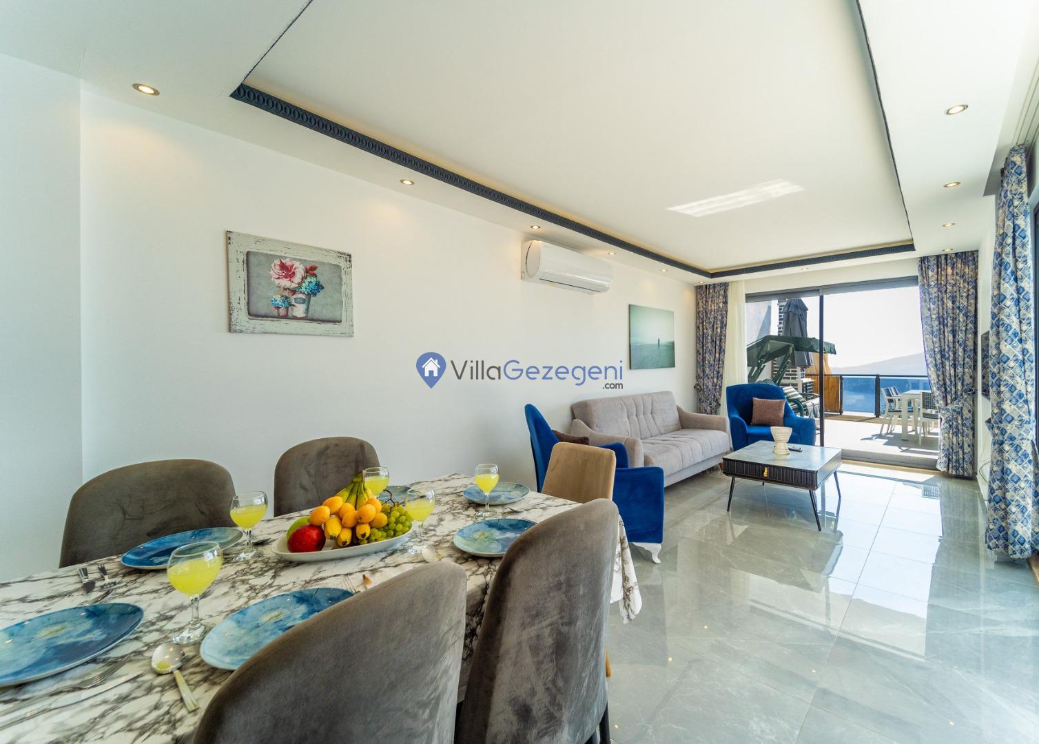 Kalkan Kördere Bölgesinde yer alan 3 yatak odalı 7 kişi kapasiteli deniz manzaralı şehir merkezine yakın kiralık tatil villası.