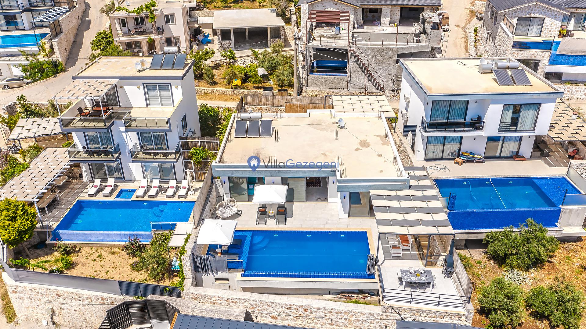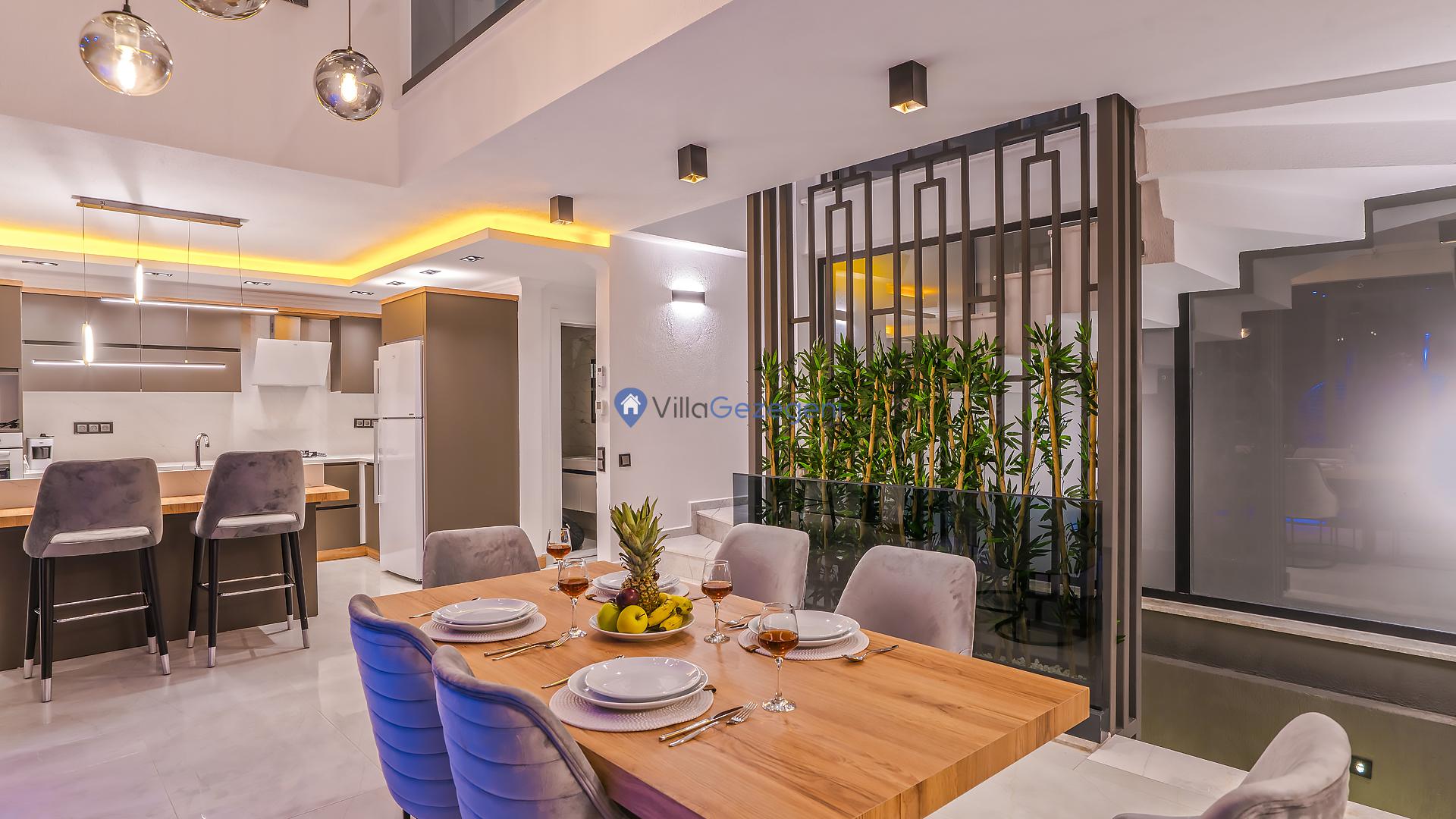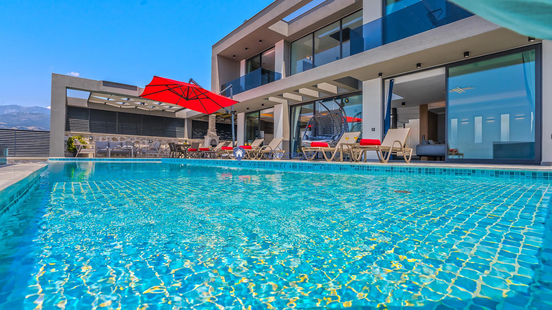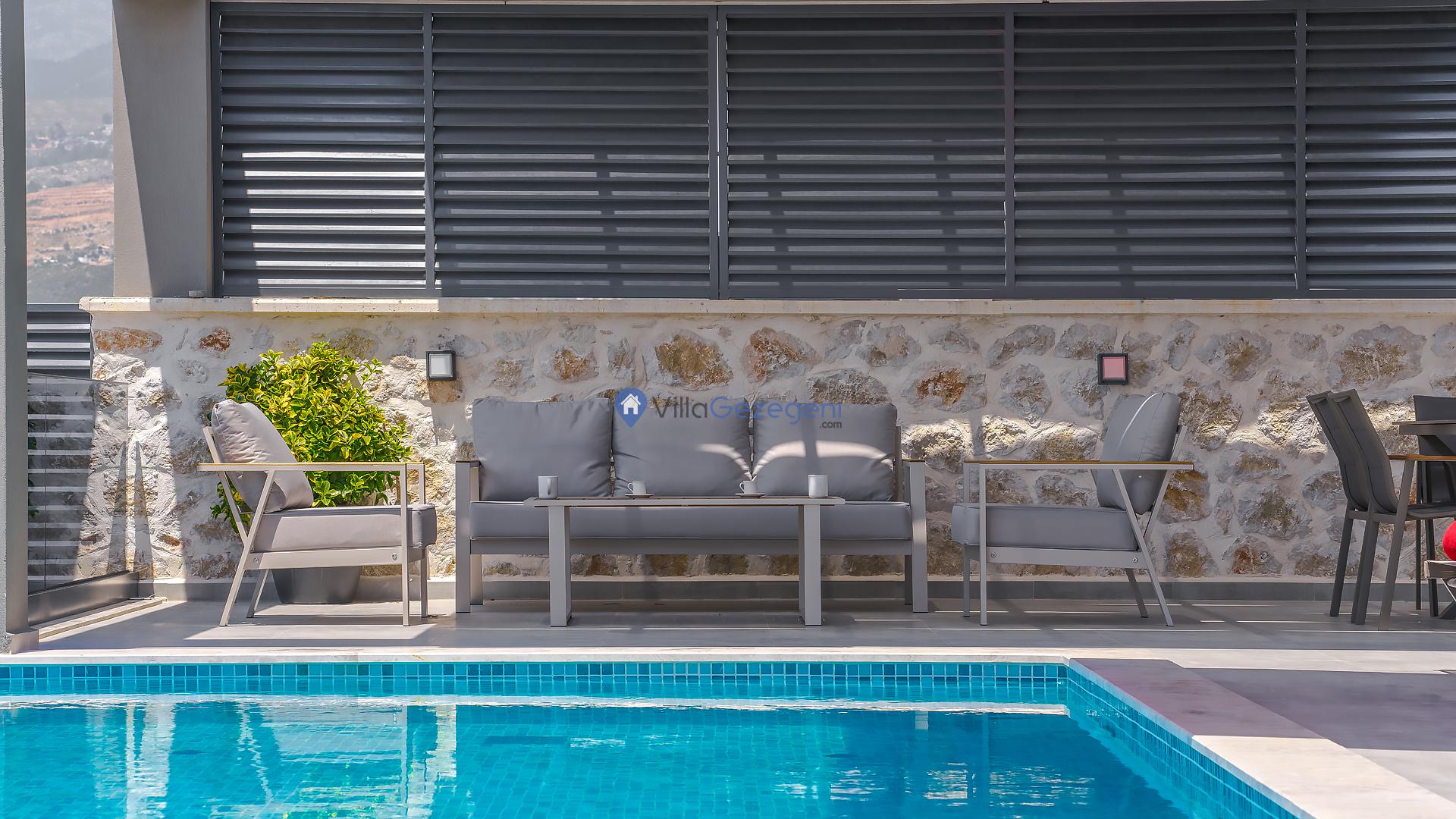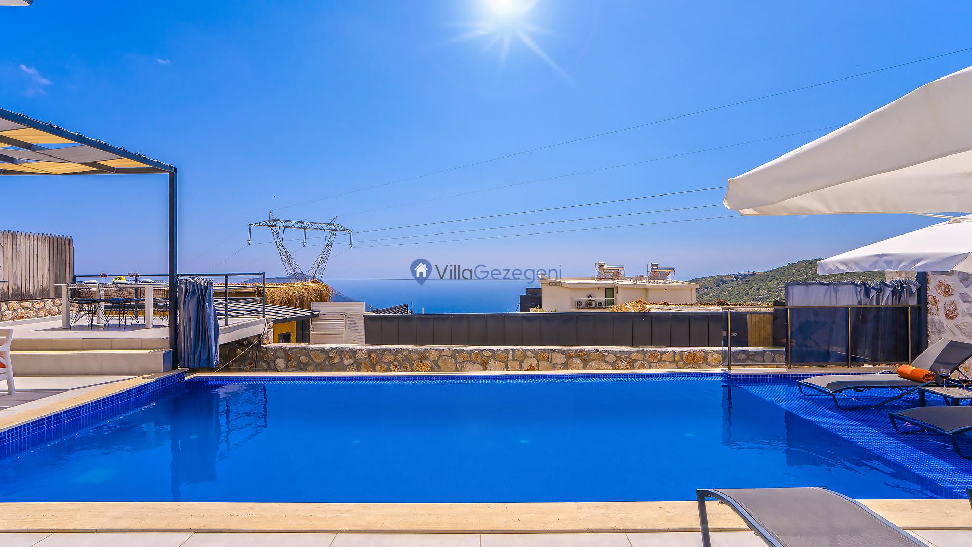Kalkan merkeze yakın konumda bulunan lüks tasarıma sahip 3 yatak odalı ve deniz manzaralı kiralık tatil villası