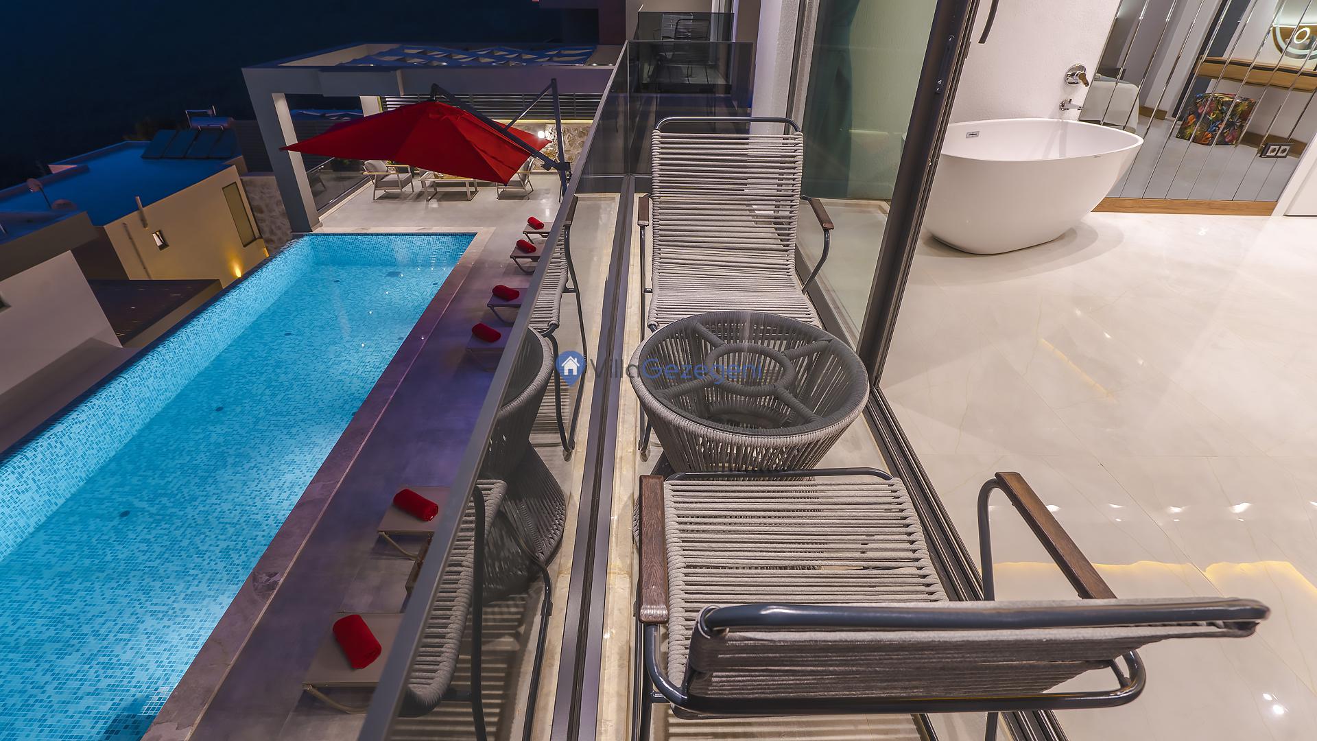 Villanın geniş açık hava alanında, keyifli anlar geçirebileceğiniz bir dizi özellik bulunmaktadır. Geniş bir balkon, havuz terası, şezlonglar, yemek masası, bahçe mobilyaları, güneş şemsiyesi ve mangal gibi donanımlar, konforlu bir dış mekan yaşamı sunar. Balkon ve havuz terası, etkileyici doğa manzarası eşliğinde dinlenmek veya özel anlarınızı paylaşmak için ideal alanlar sunar. Şezlonglar sayesinde güneşin tadını çıkarabilir ve özel bir güneşlenme deneyimi yaşayabilirsiniz.