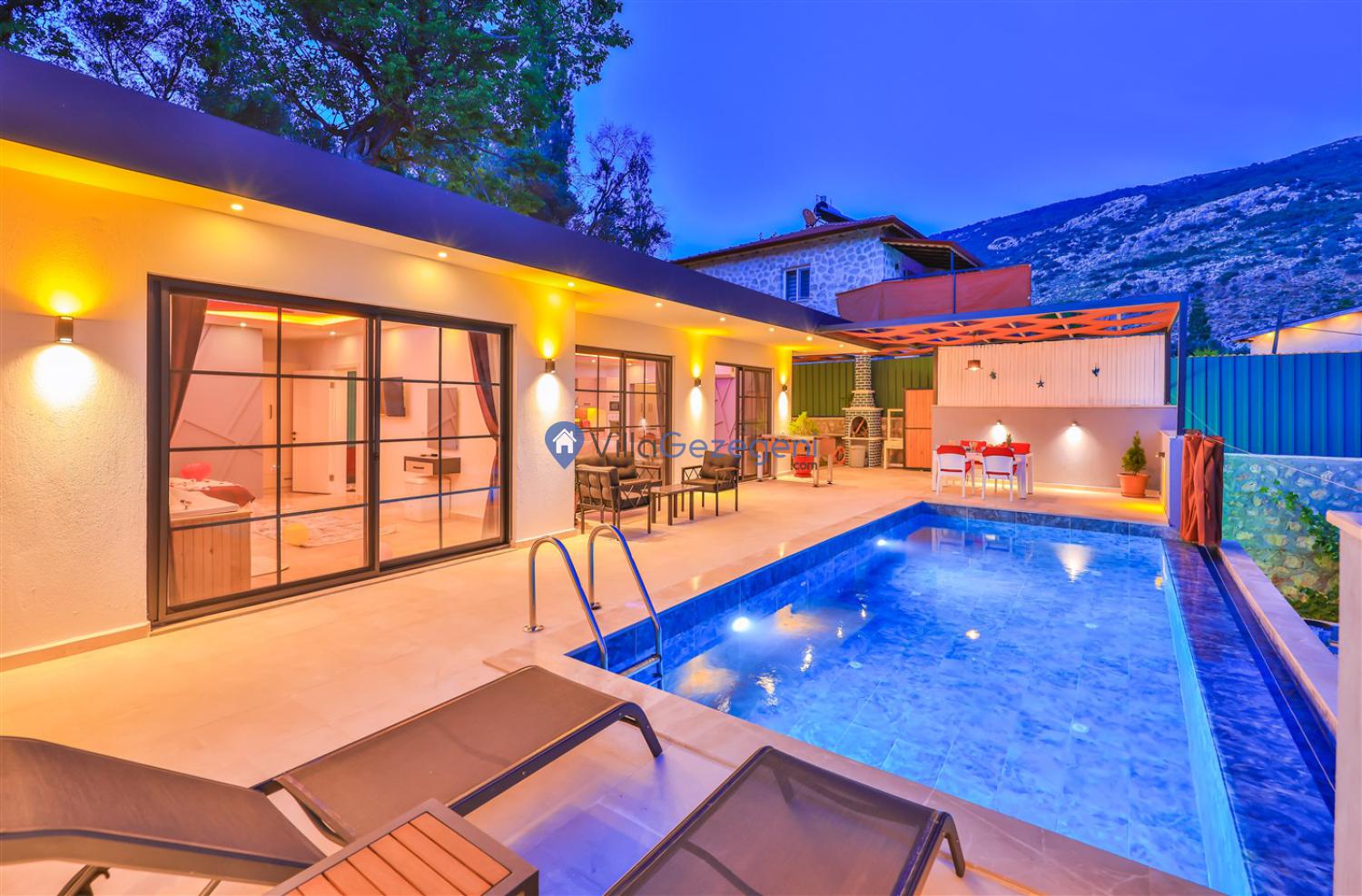Kalkan İslamlar mevkinde inşa edilmiş 6 kişi konaklama kapasiteli,jakuzili kiralık villa.