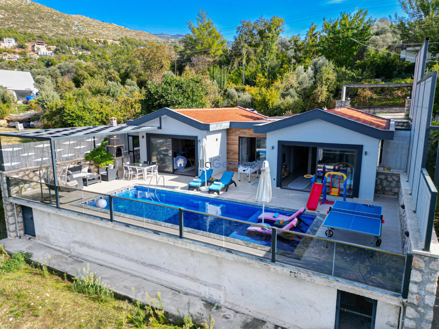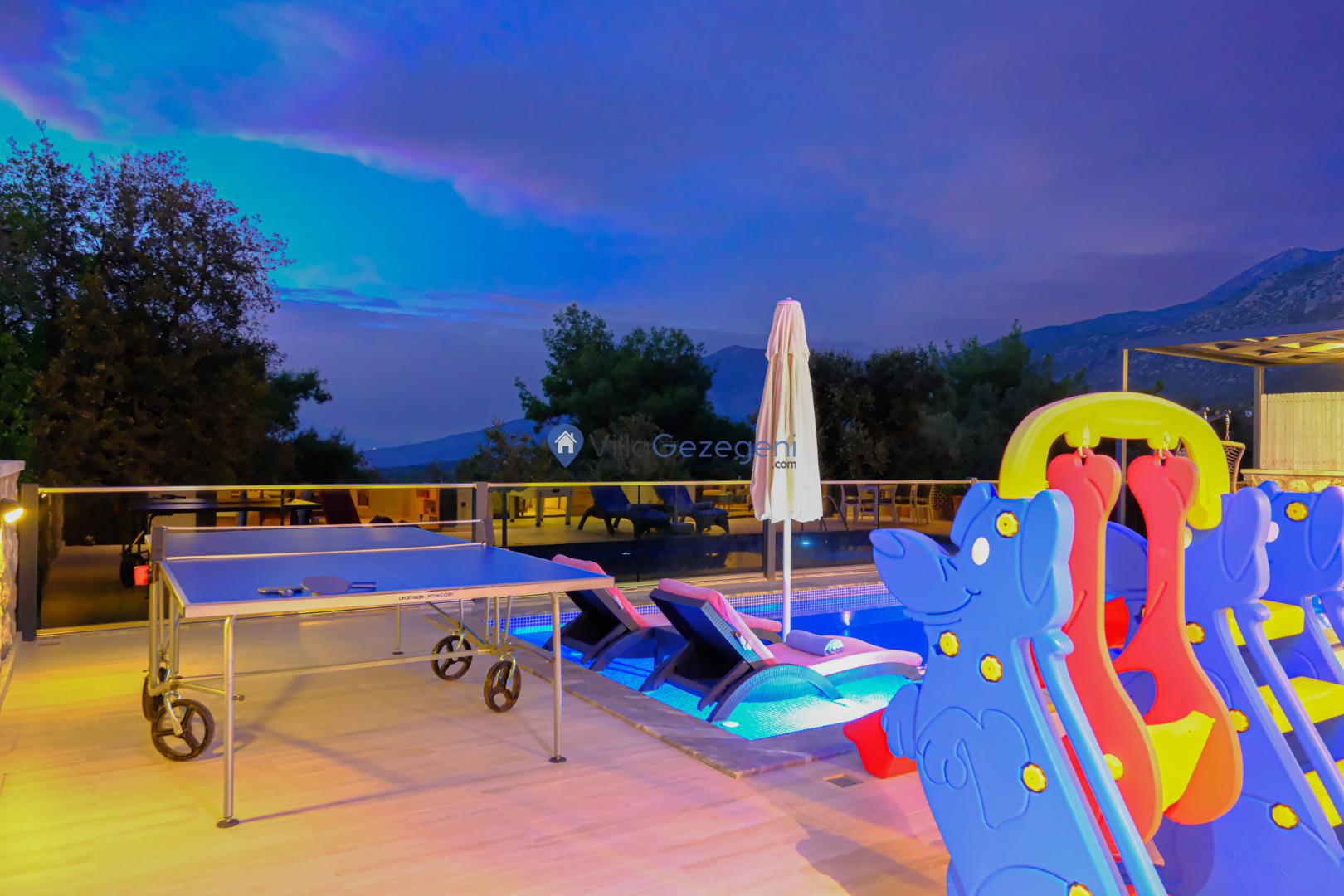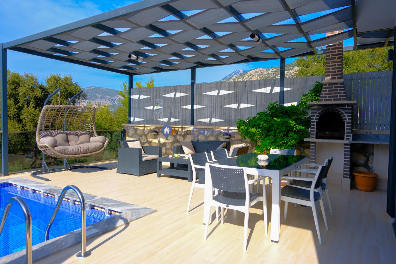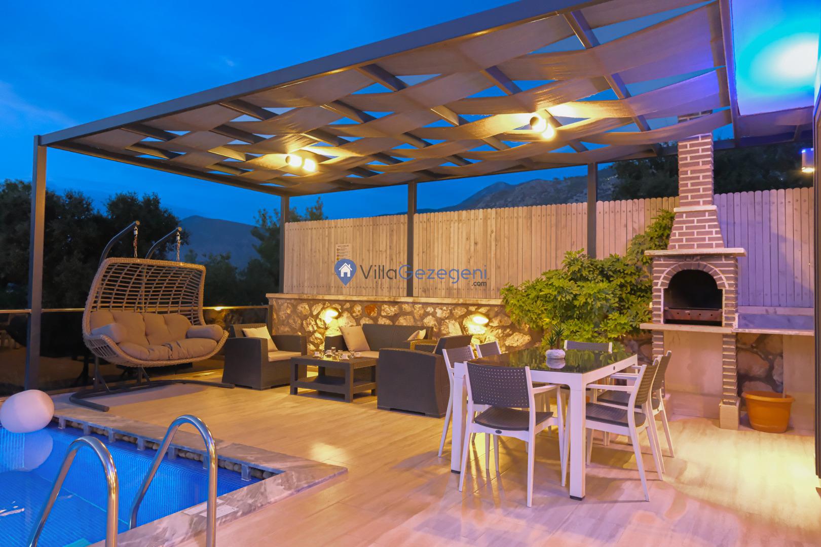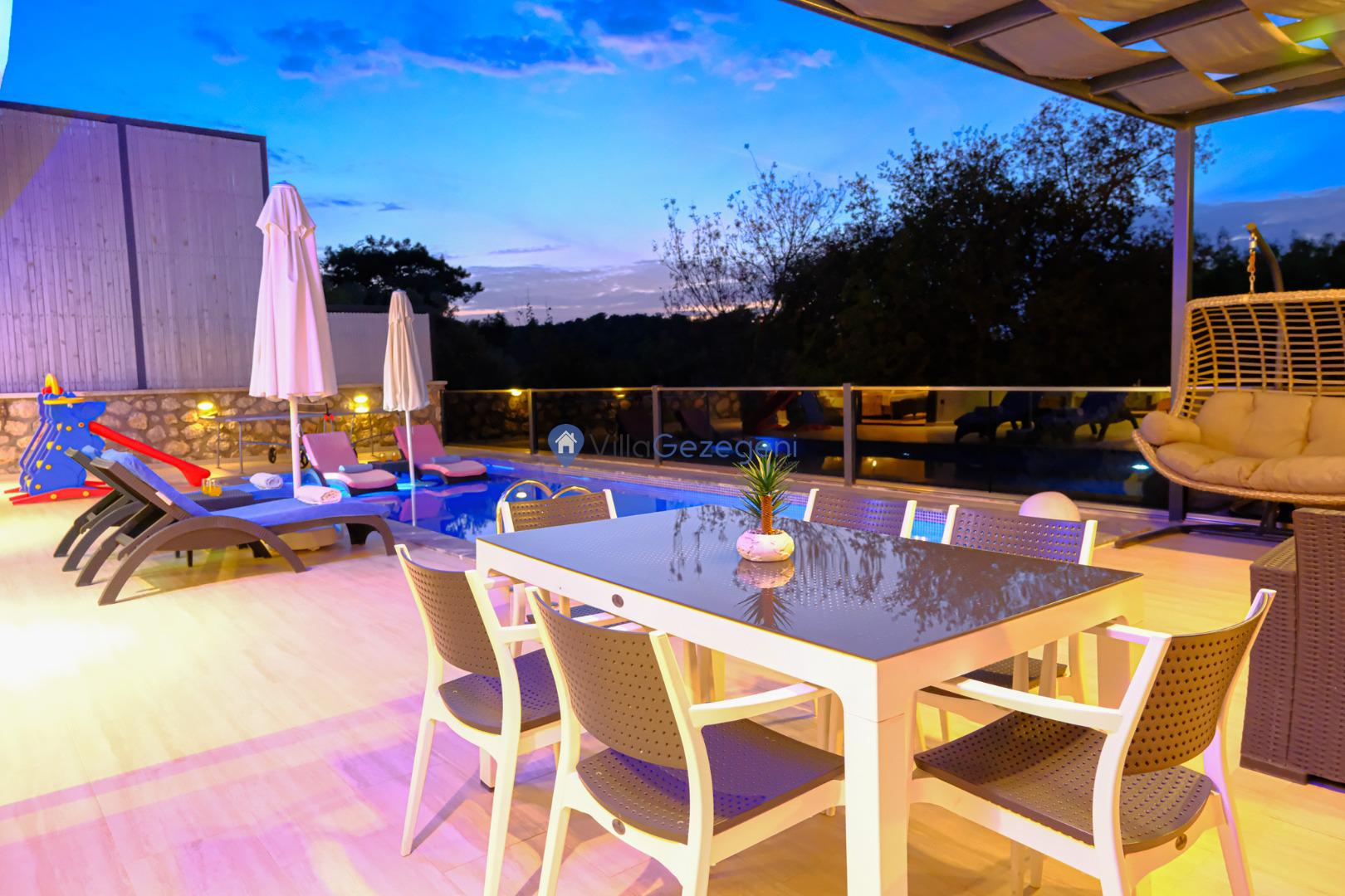 Villa Kaan'ın bahçesi, açık hava etkinlikleri ve rahatlama için çeşitli olanaklarla zenginleştirilmiştir. Villanın geniş ve davetkar balkonu, misafirlerin doğanın ve çevrenin keyfini çıkarmaları için mükemmel bir yer sunar. Açık hava yemekleri için ideal olan barbekü alanı, lezzetli ızgara yemeklerini hazırlamak ve dostlarla keyifli sohbetler için tasarlanmıştır. Özel havuzun etrafındaki geniş teras alanı, güneşlenmek ve serinlemek için şezlonglarla donatılmıştır, bu da güneşli günlerde mükemmel bir dinlenme ortamı sağlar. Ayrıca, bahçede bulunan yemek masası ve rahat bahçe mobilyaları, dışarıda yemek yeme ve doğanın keyfini çıkarma deneyimini zenginleştirir.