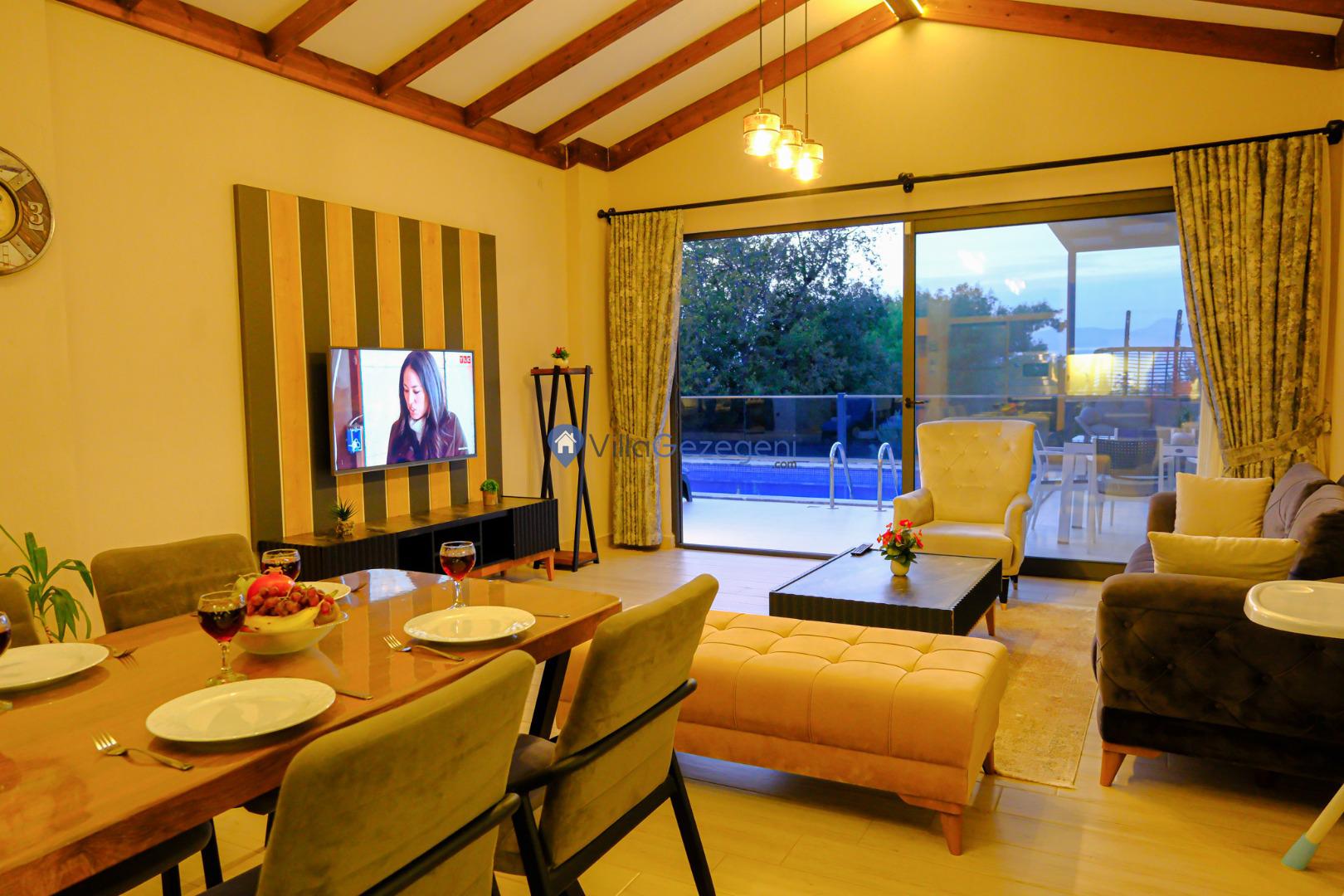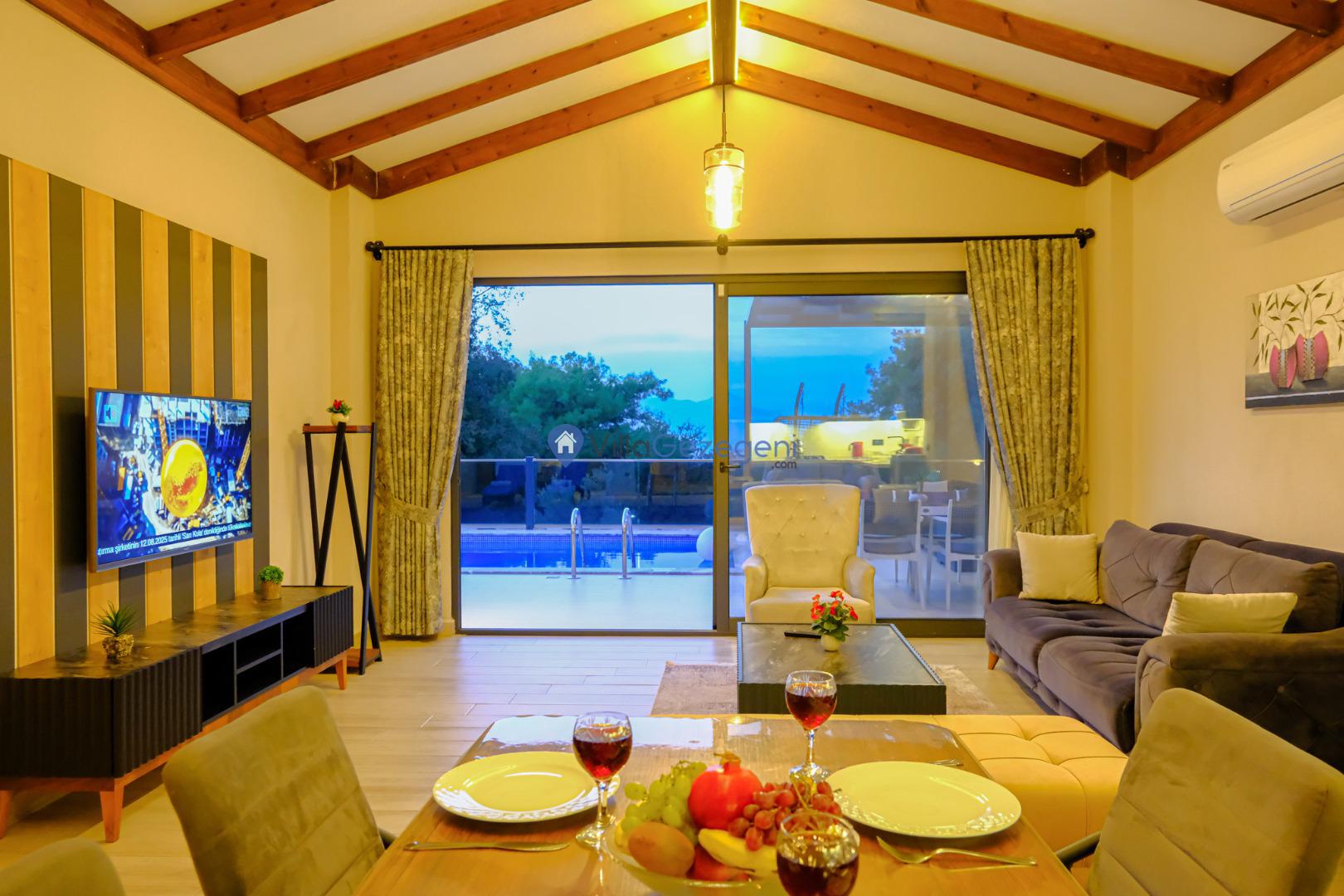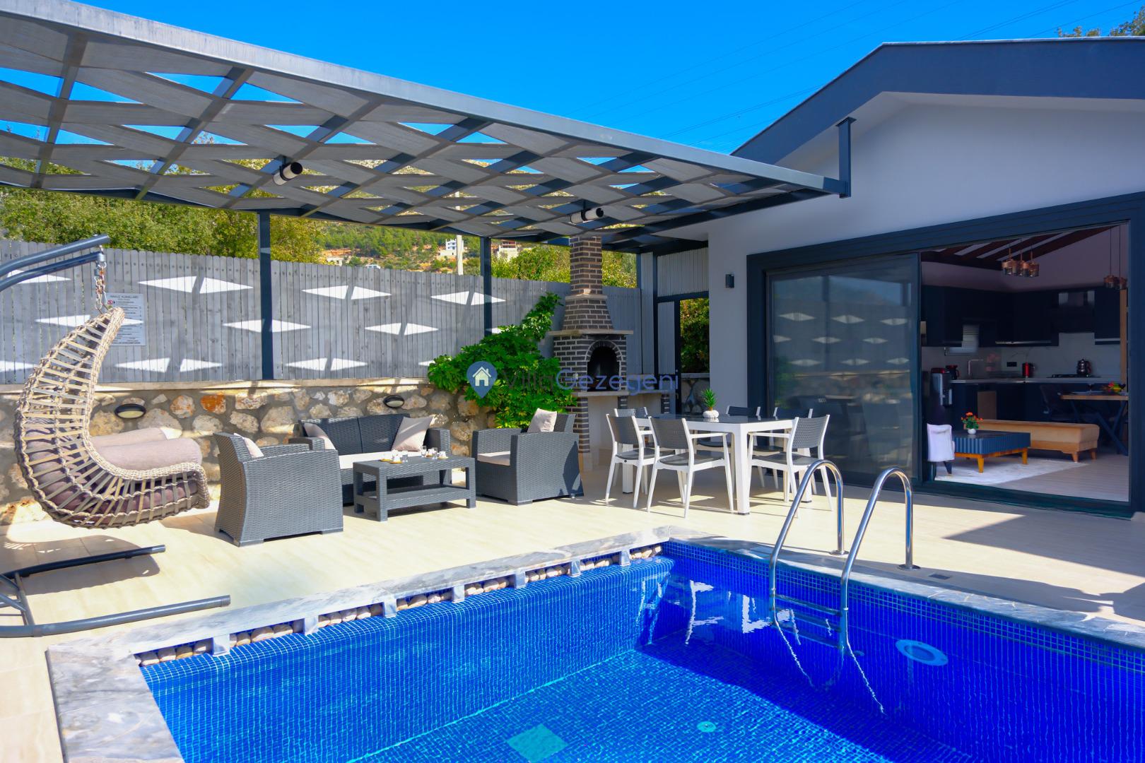 Kaş kalkan Üzümlü bölgesinde yer alan 2 yatak odalı 4 kişi kapasiteli doğa içerisinde havuzu korunaklı tatil villası.