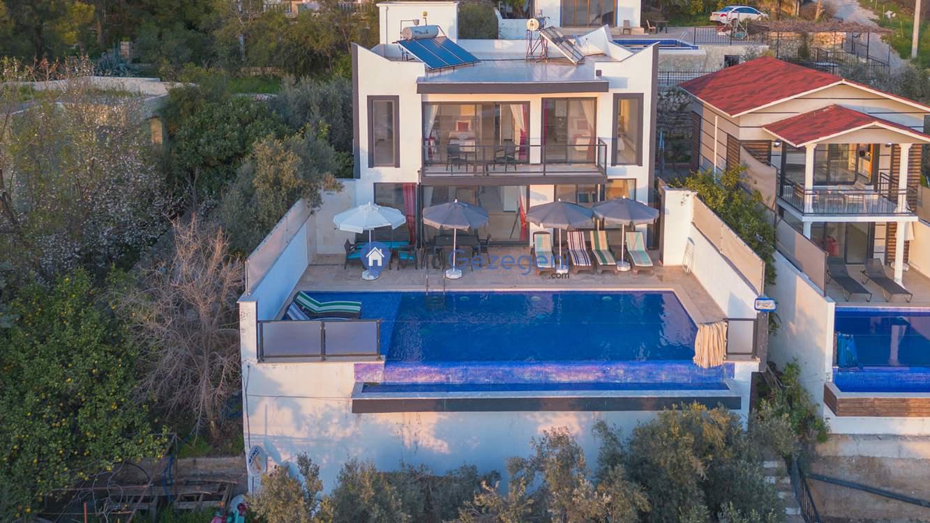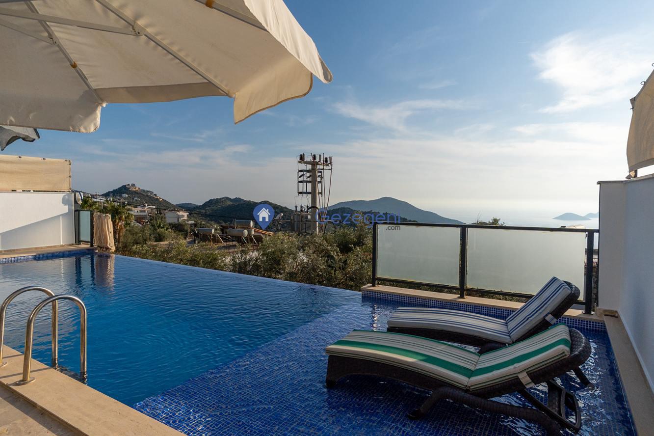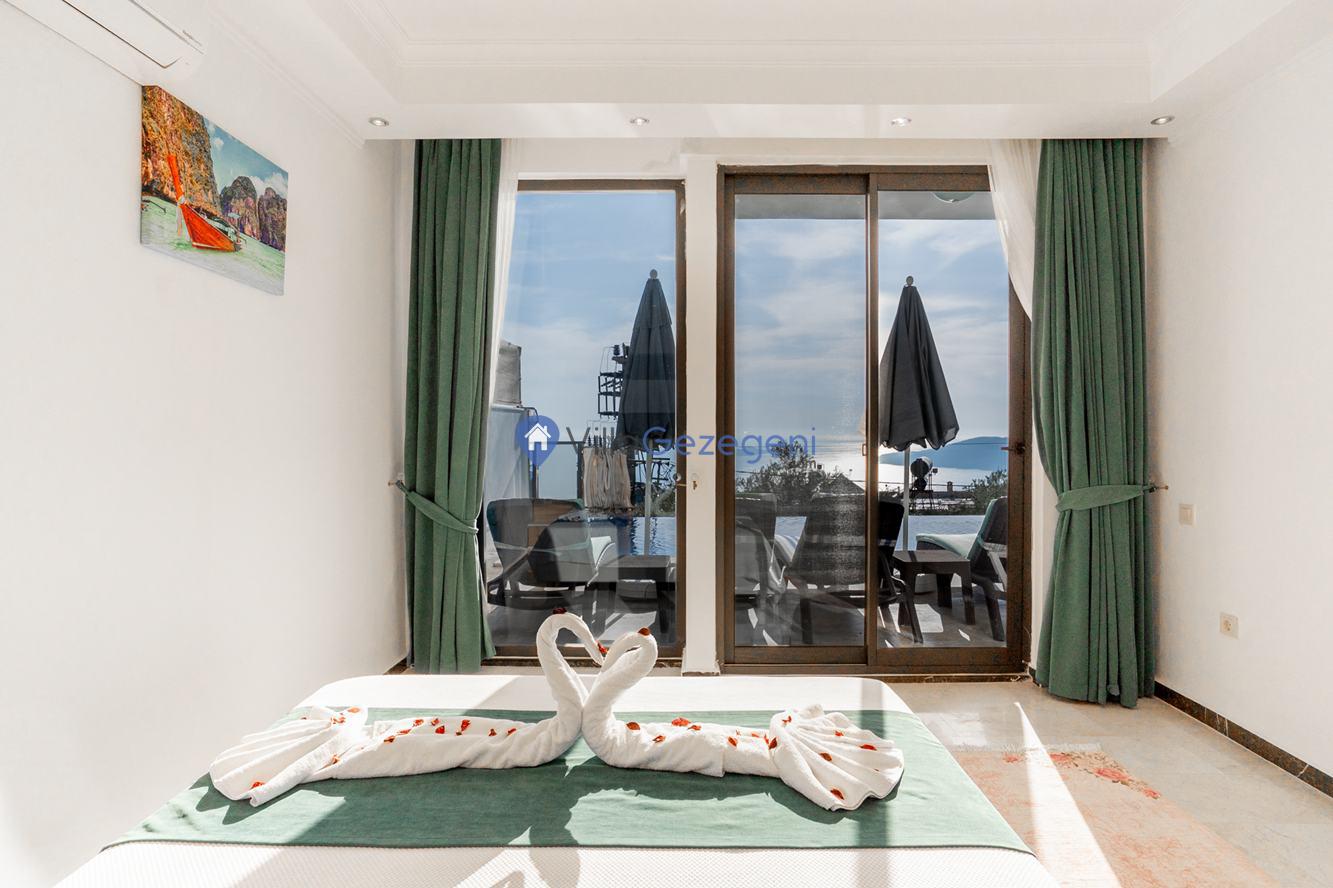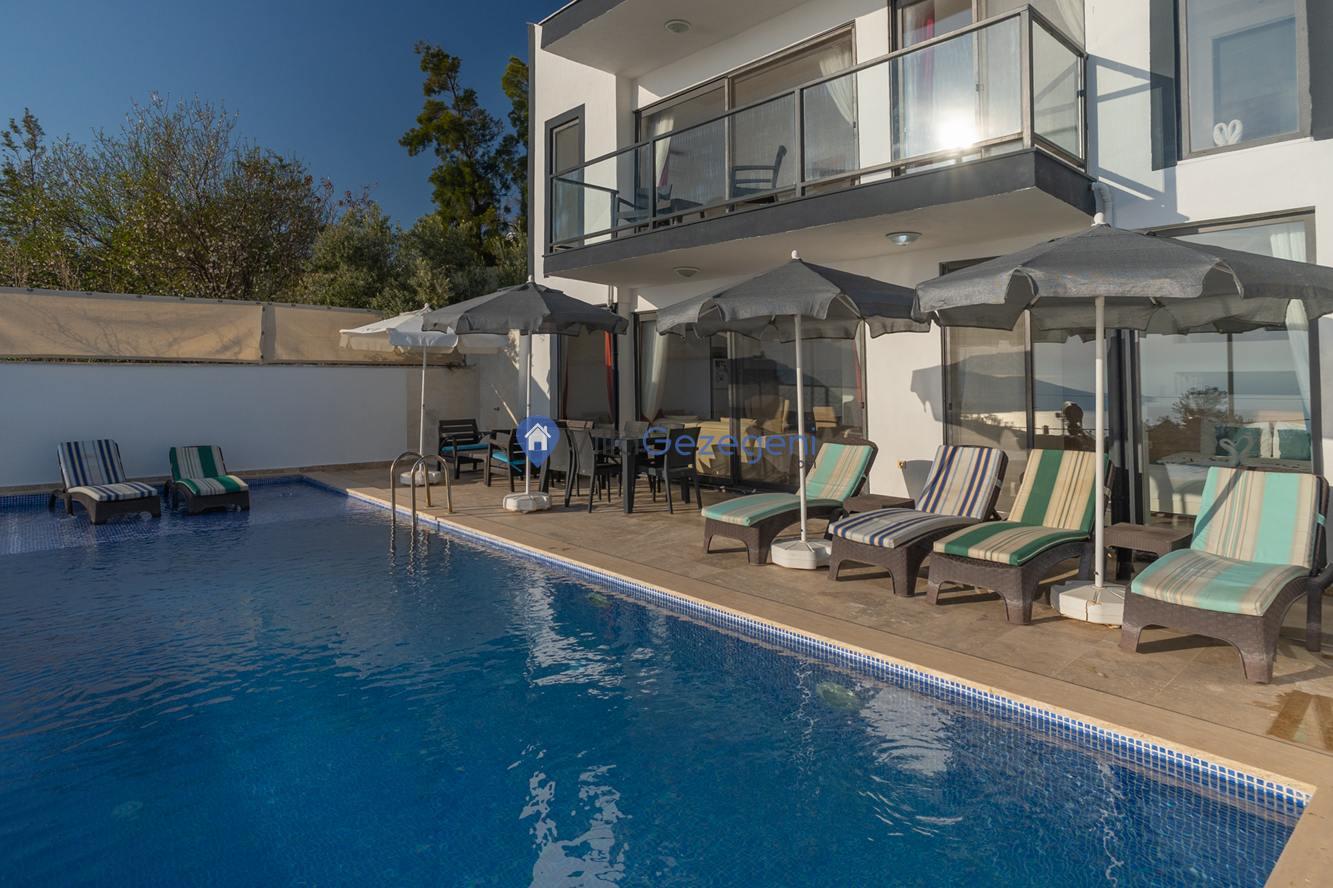 Kaş/Kalkan/Kördere Bölgesinde yer alan 3 yatak odalı 6 kişi kapasiteli havuzu korunaklı deniz manzaralı kiralık tatil villası.