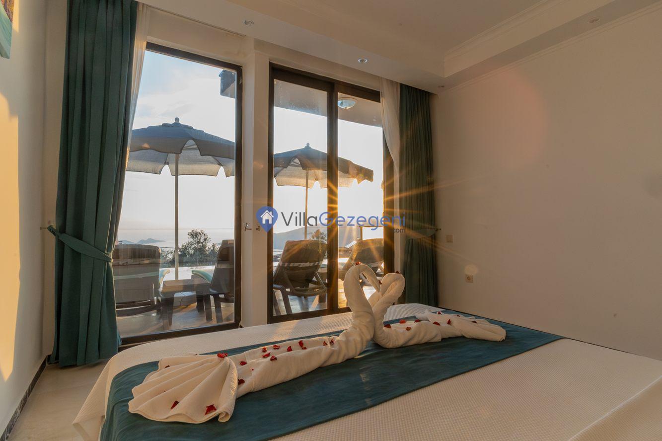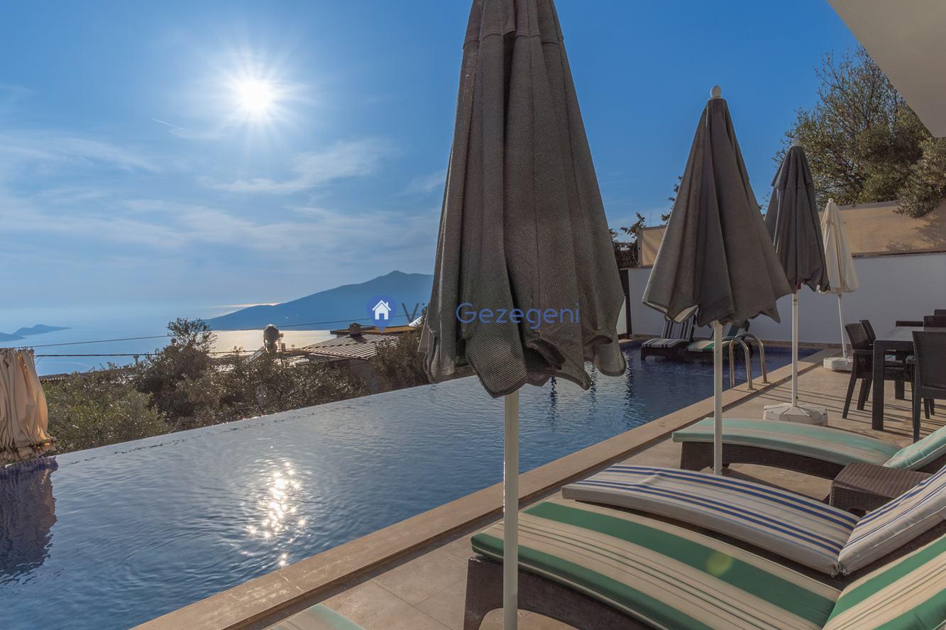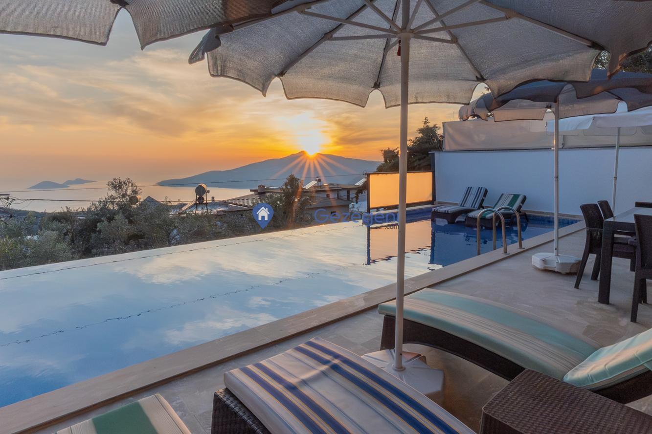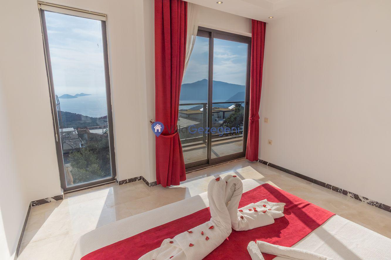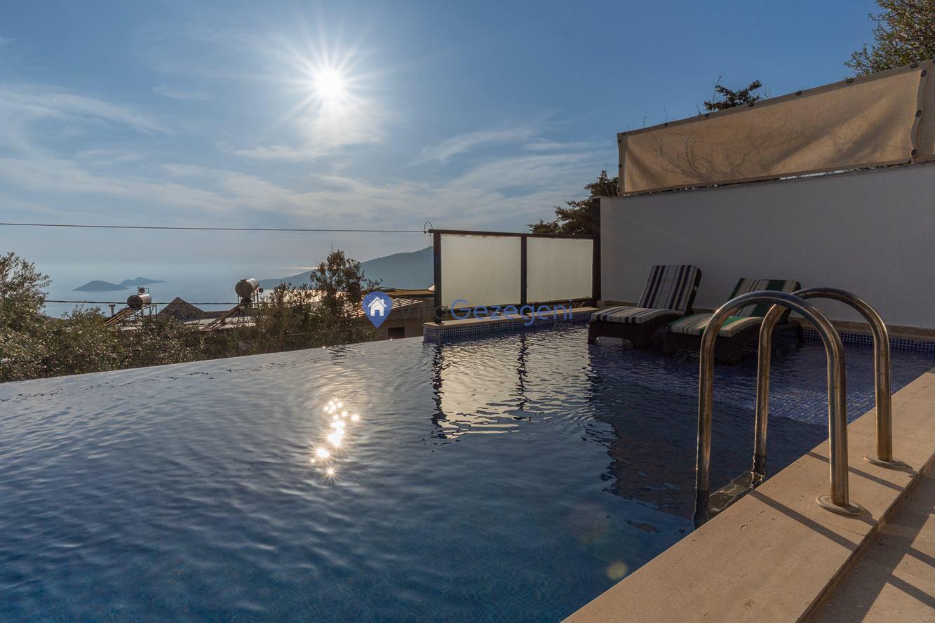 Kaş/Kalkan/Kördere Bölgesinde yer alan 3 yatak odalı 6 kişi kapasiteli havuzu korunaklı deniz manzaralı kiralık tatil villası.