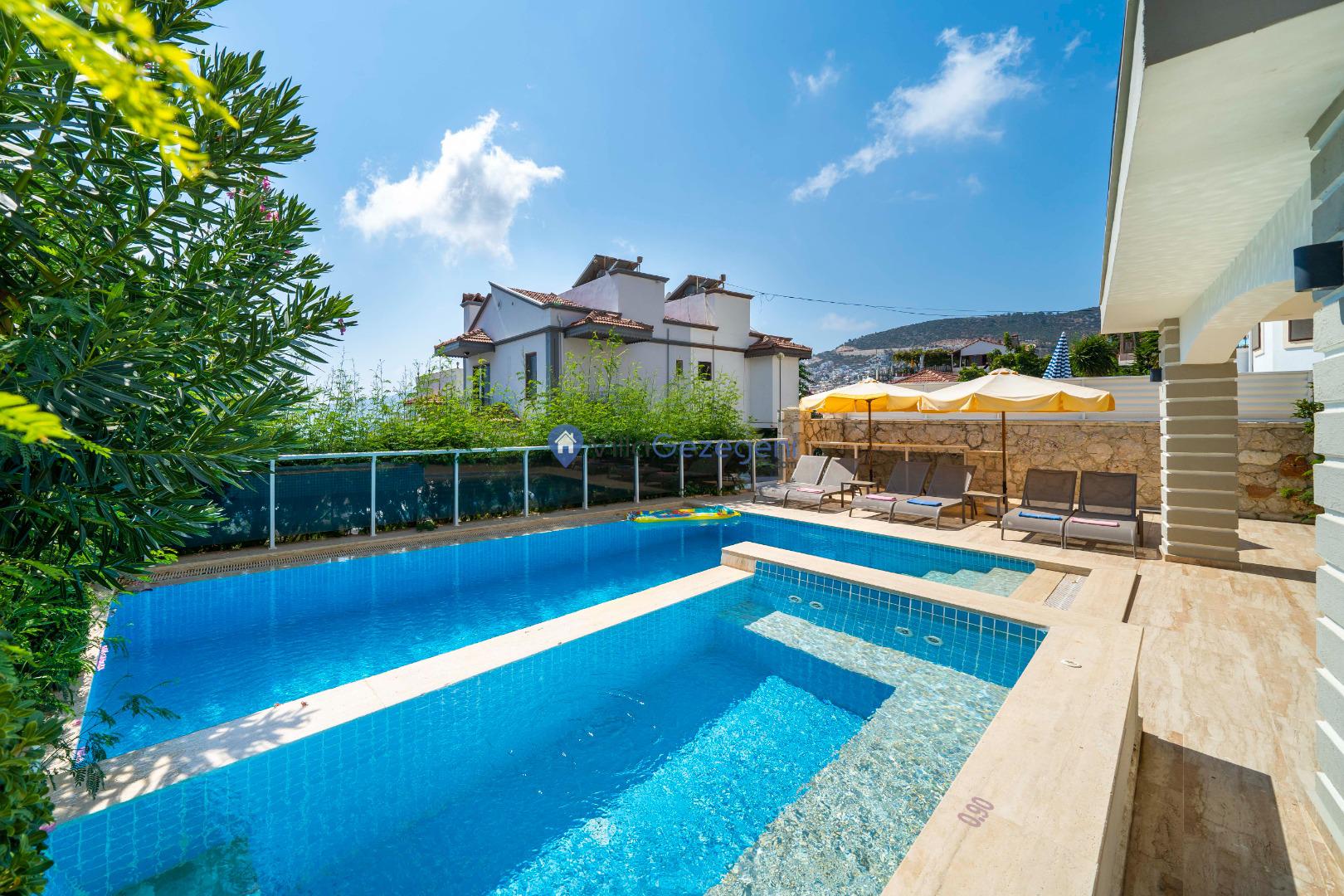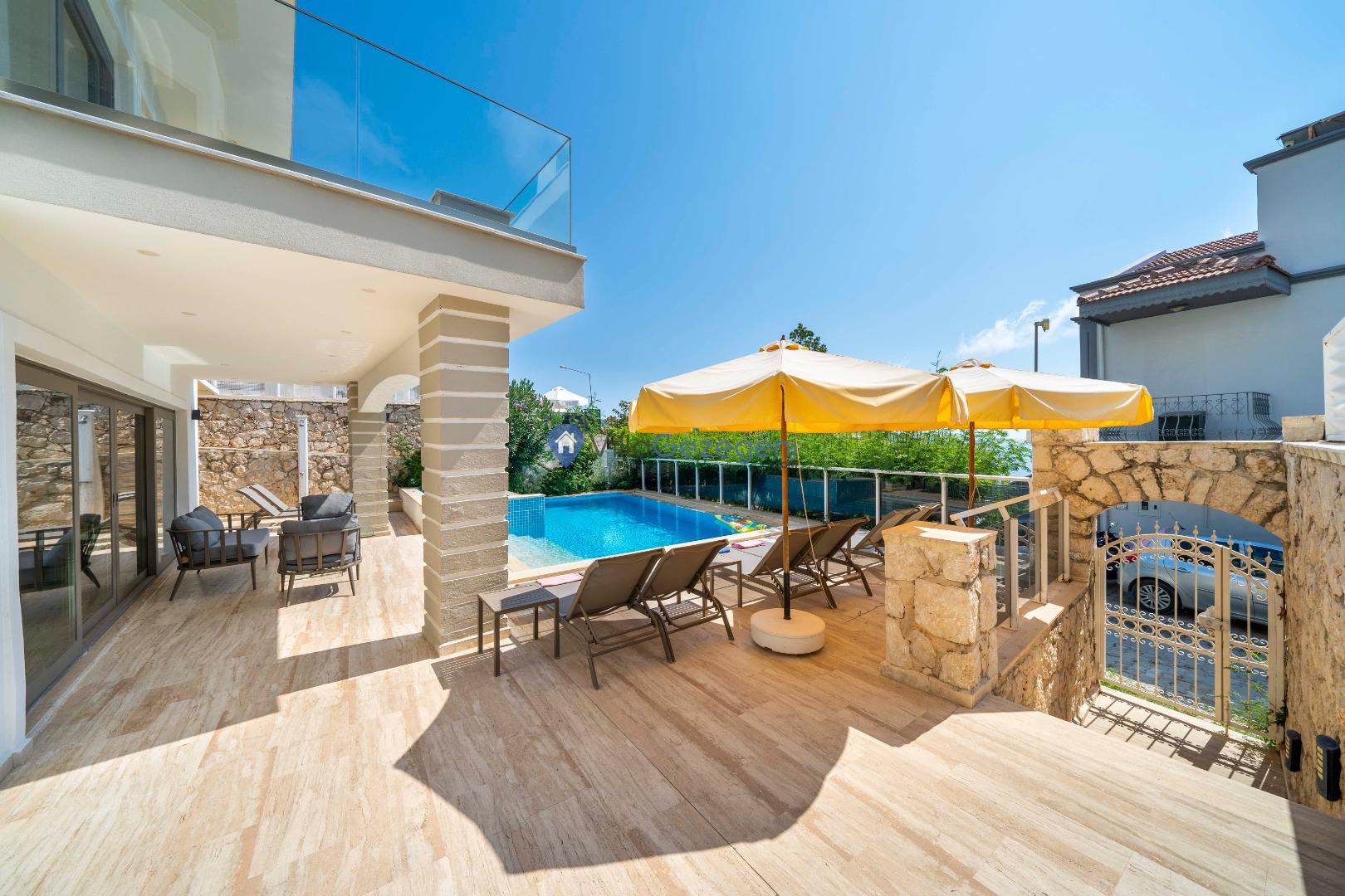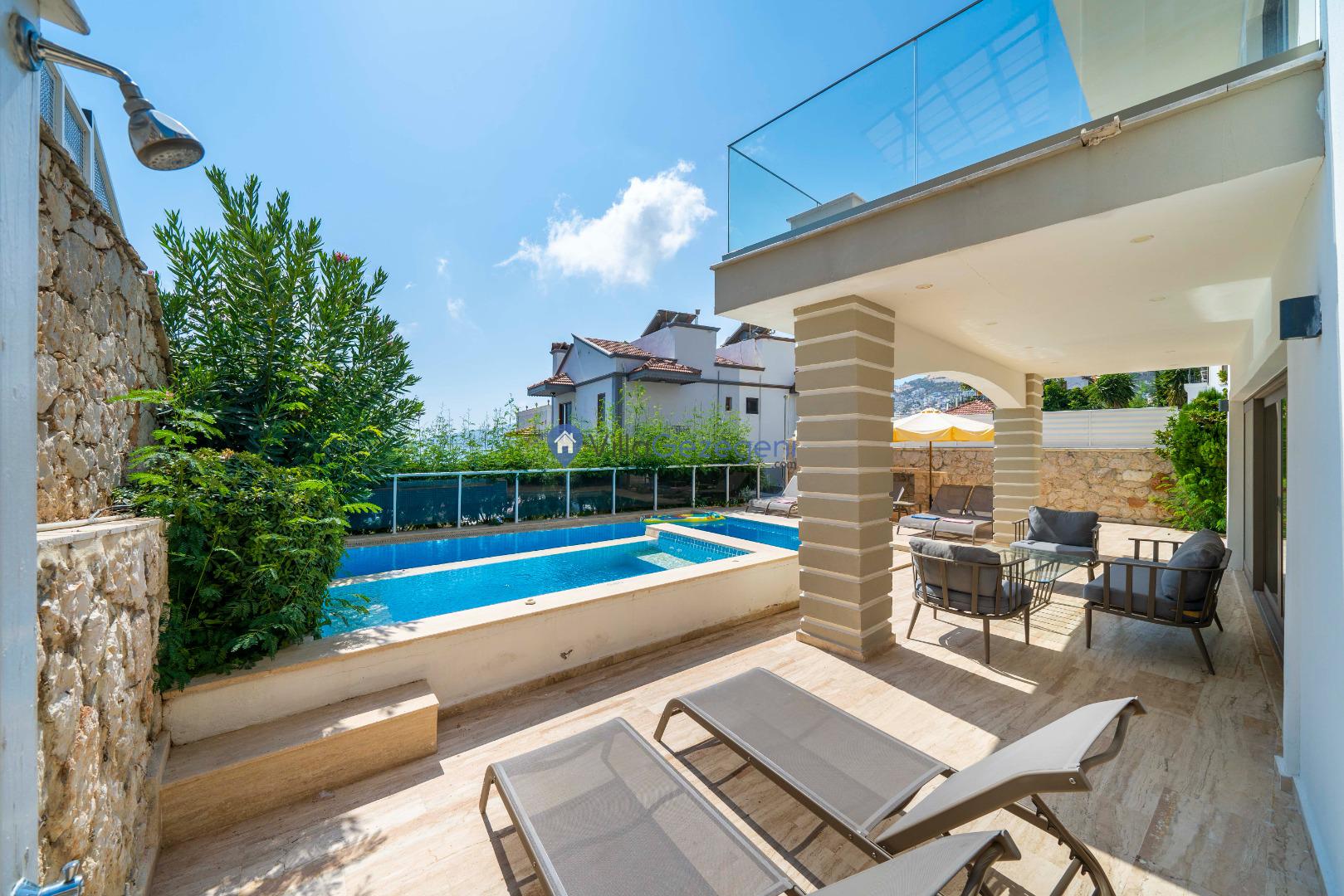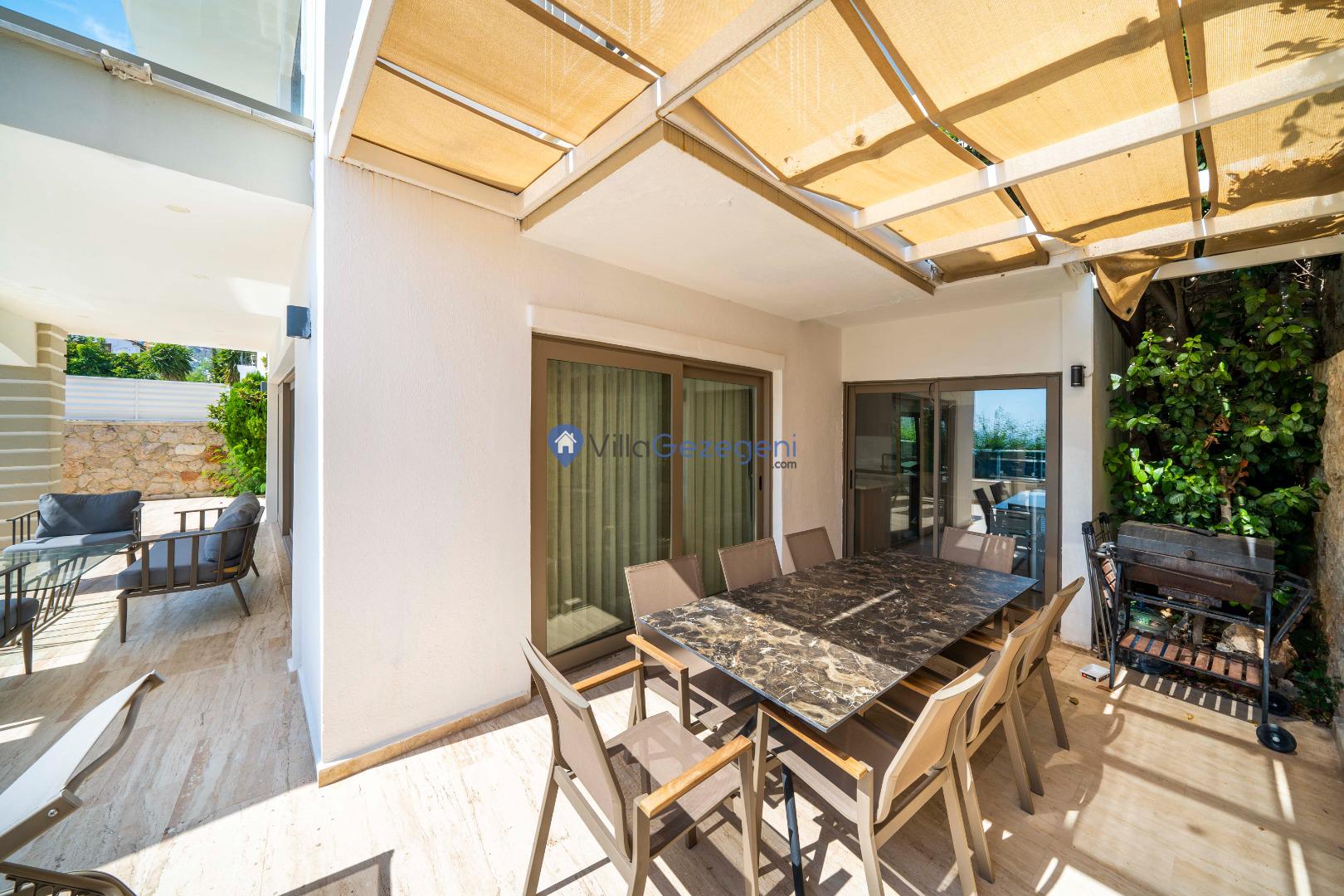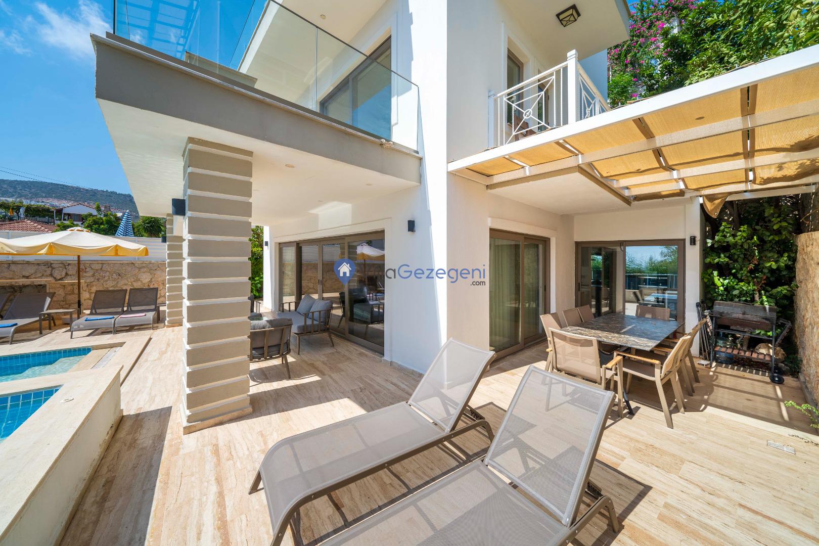 Geniş terası, özel yüzme havuzu ve açık hava oturma alanları sayesinde dış mekânda keyifli vakit geçirme imkânı sunar. Yemek masası, rahat bahçe mobilyaları ve barbekü alanı havuz terasında misafirlerin kullanımına sunulmuştur. Merkezi konumu sayesinde Kalkan’ın restoranlarına, plajına ve alışveriş noktalarına kolayca ulaşabilir, hem dinlendirici hem de hareketli bir tatil deneyimi yaşayabilirsiniz.
