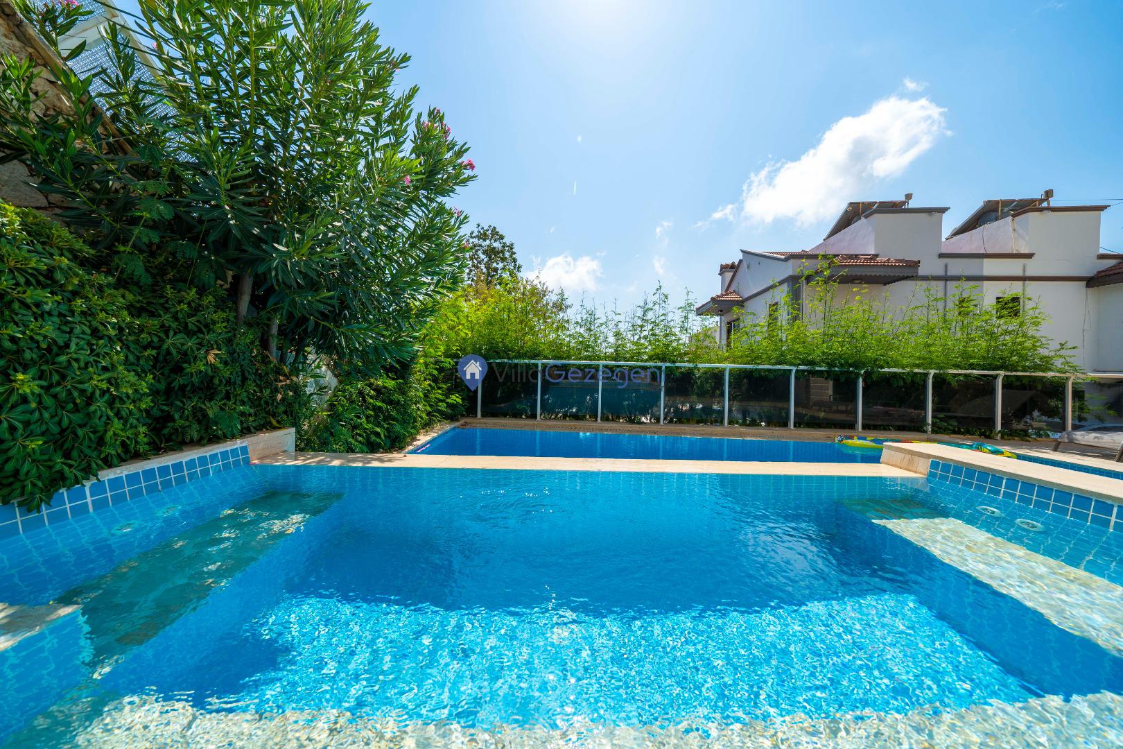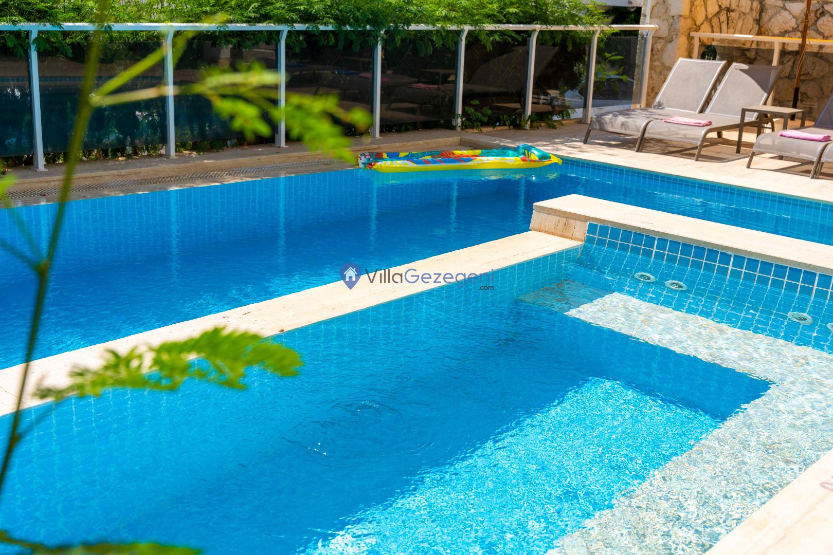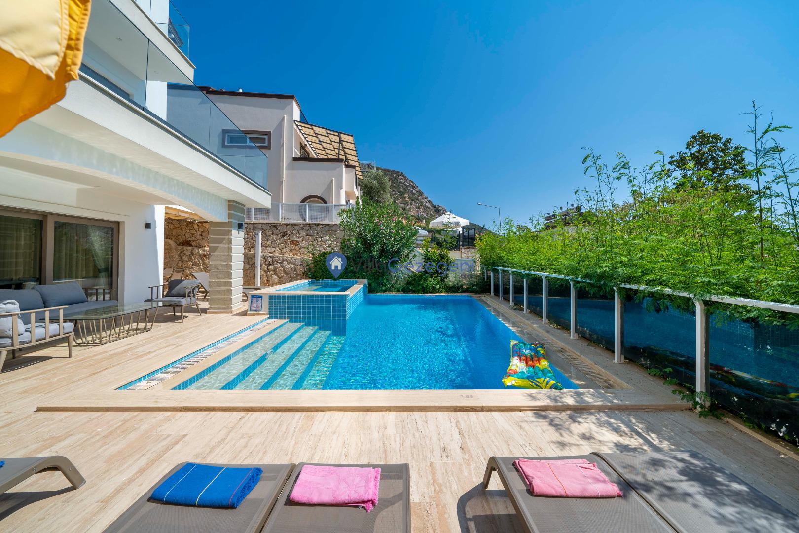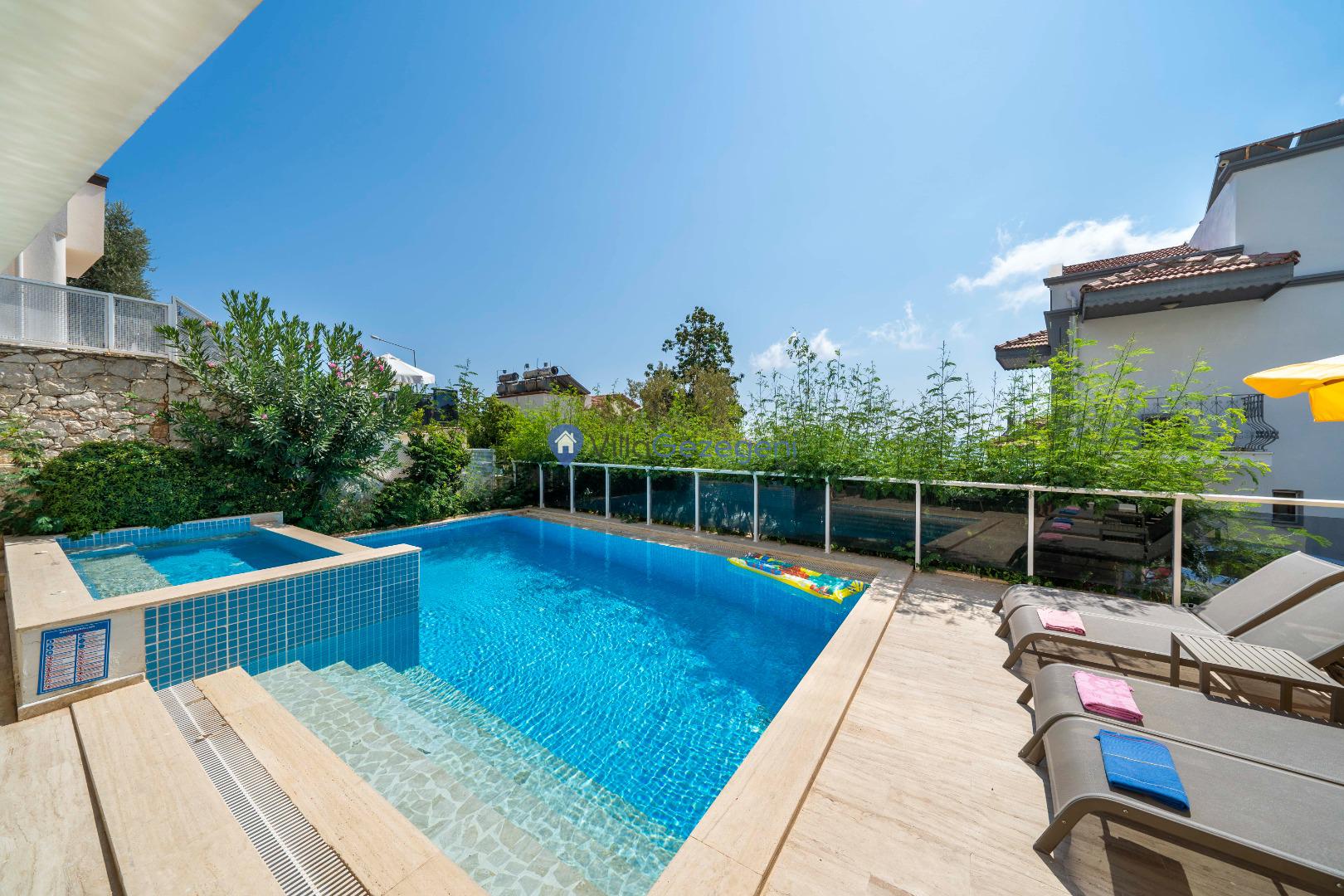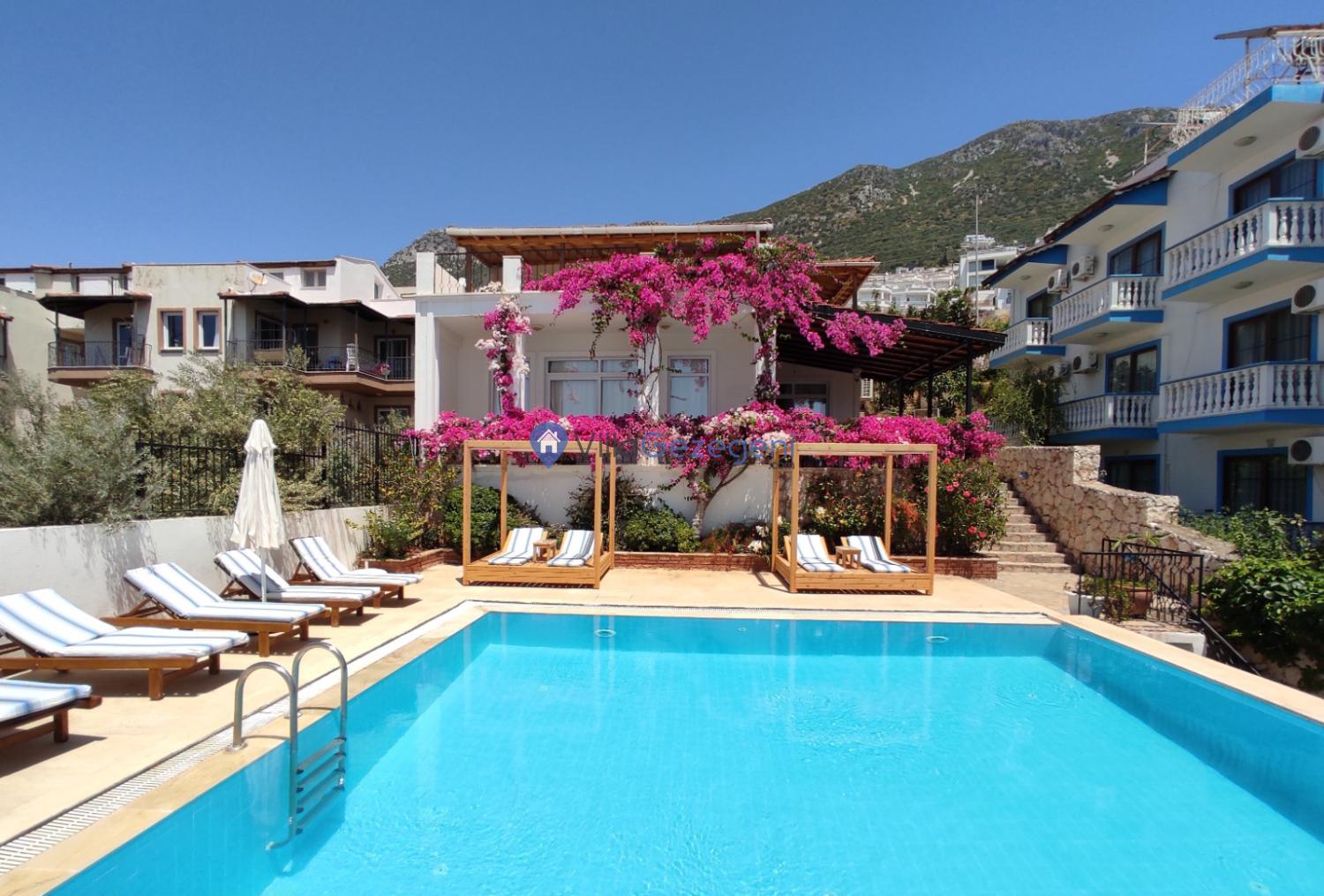 Geniş terası, özel yüzme havuzu ve açık hava oturma alanları sayesinde dış mekânda keyifli vakit geçirme imkânı sunar. Yemek masası, rahat bahçe mobilyaları ve barbekü alanı havuz terasında misafirlerin kullanımına sunulmuştur. Merkezi konumu sayesinde Kalkan’ın restoranlarına, plajına ve alışveriş noktalarına kolayca ulaşabilir, hem dinlendirici hem de hareketli bir tatil deneyimi yaşayabilirsiniz.