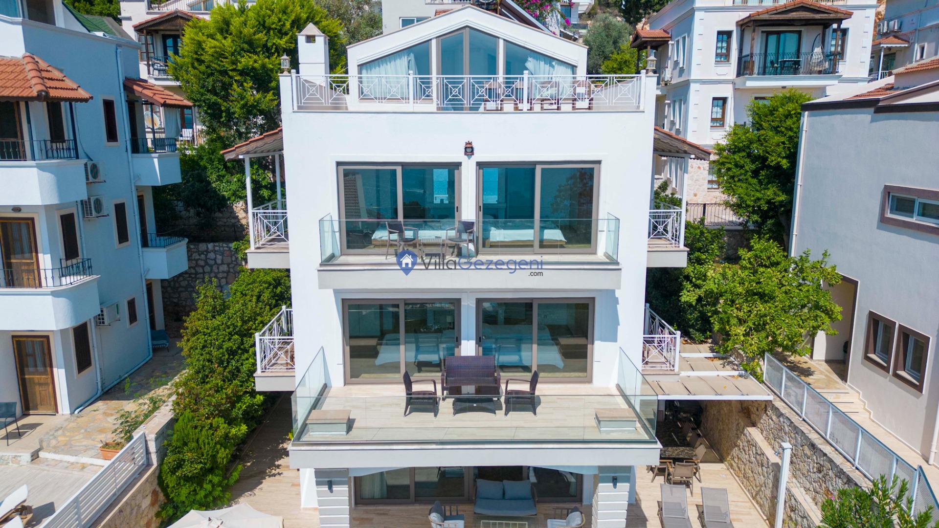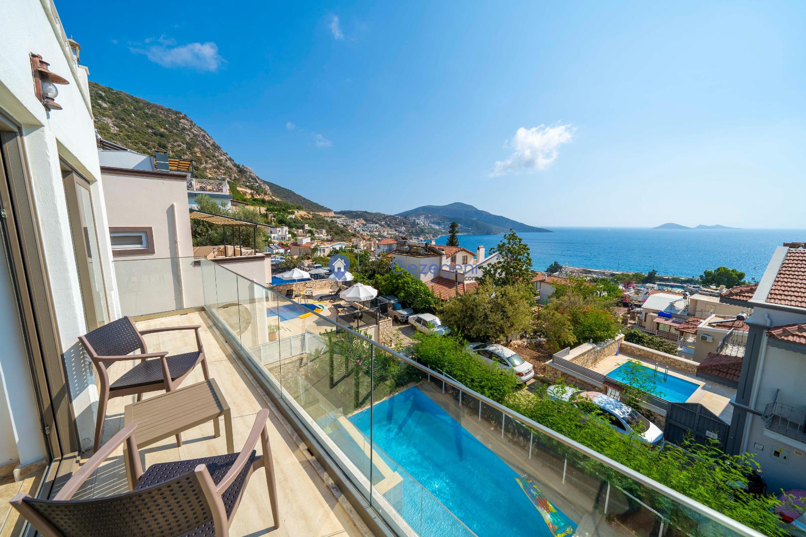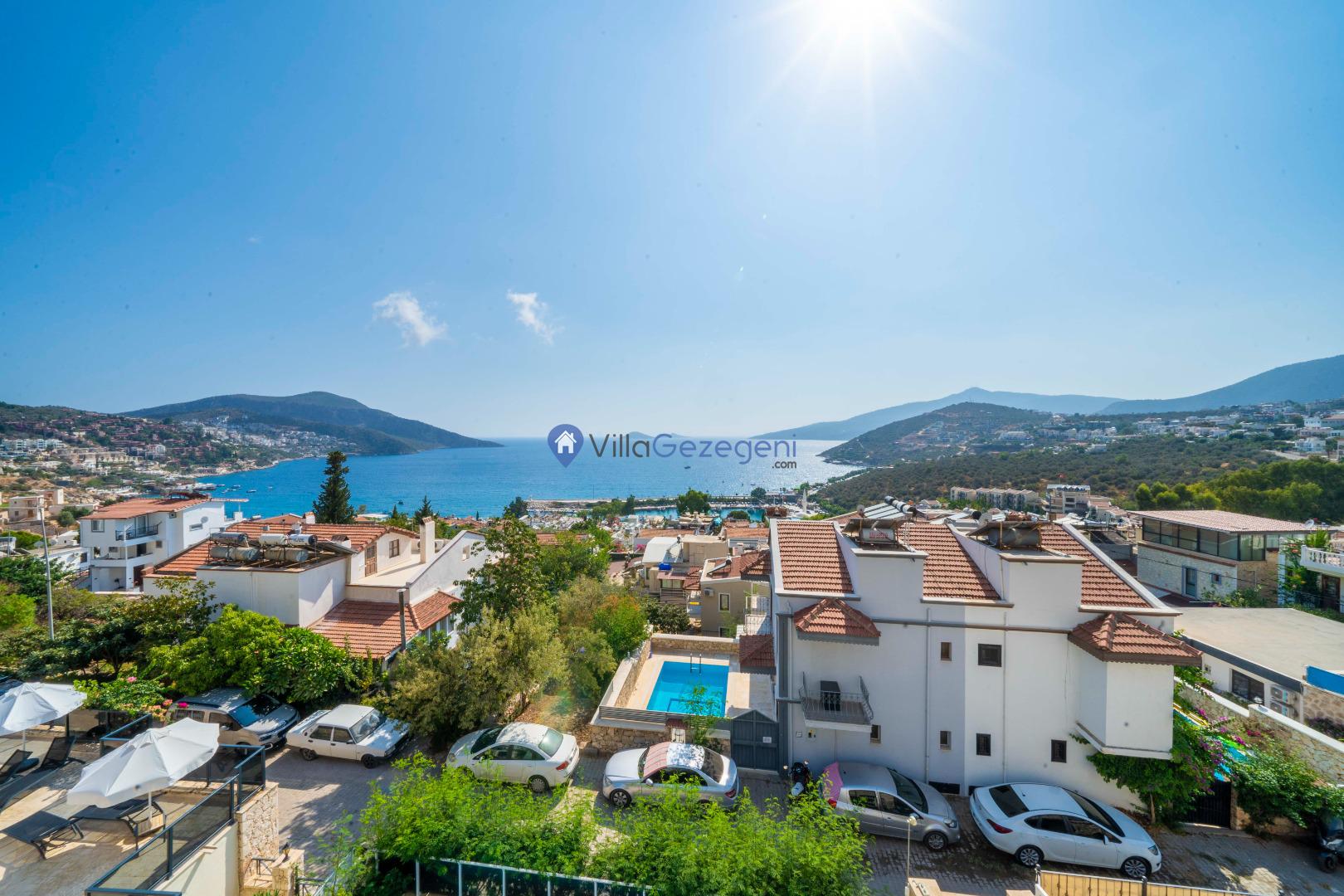 Kalkan Merkez Mevkiinde yer alan 5 yatak odalı 10 kişi kapasiteli deniz manzaralı geniş aile ve arkadaş grupları için uygun kiralık tatil villası.