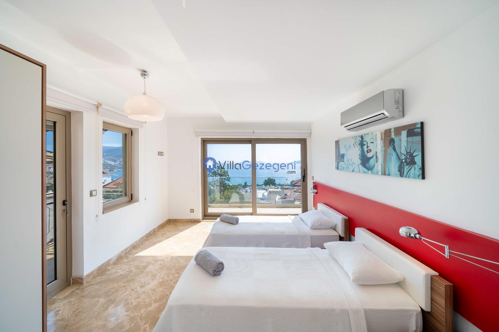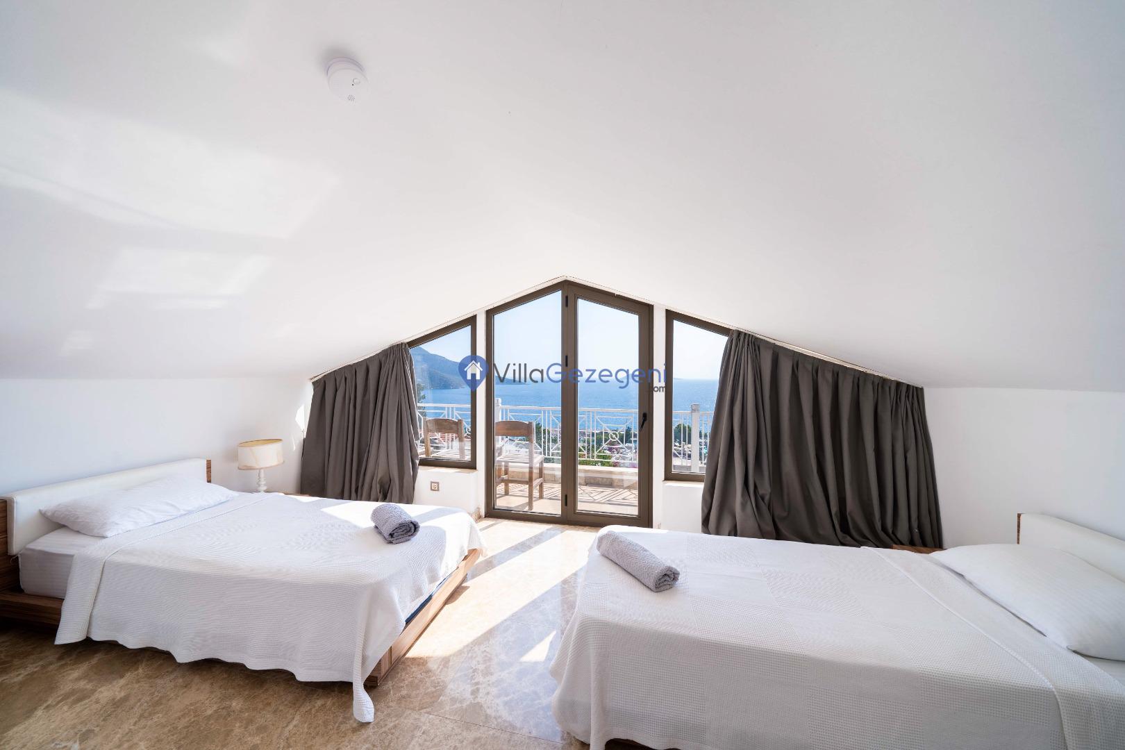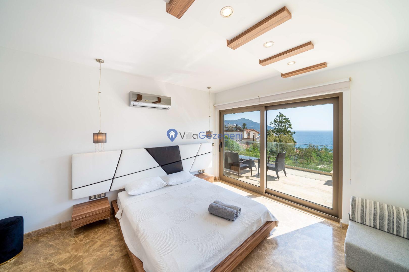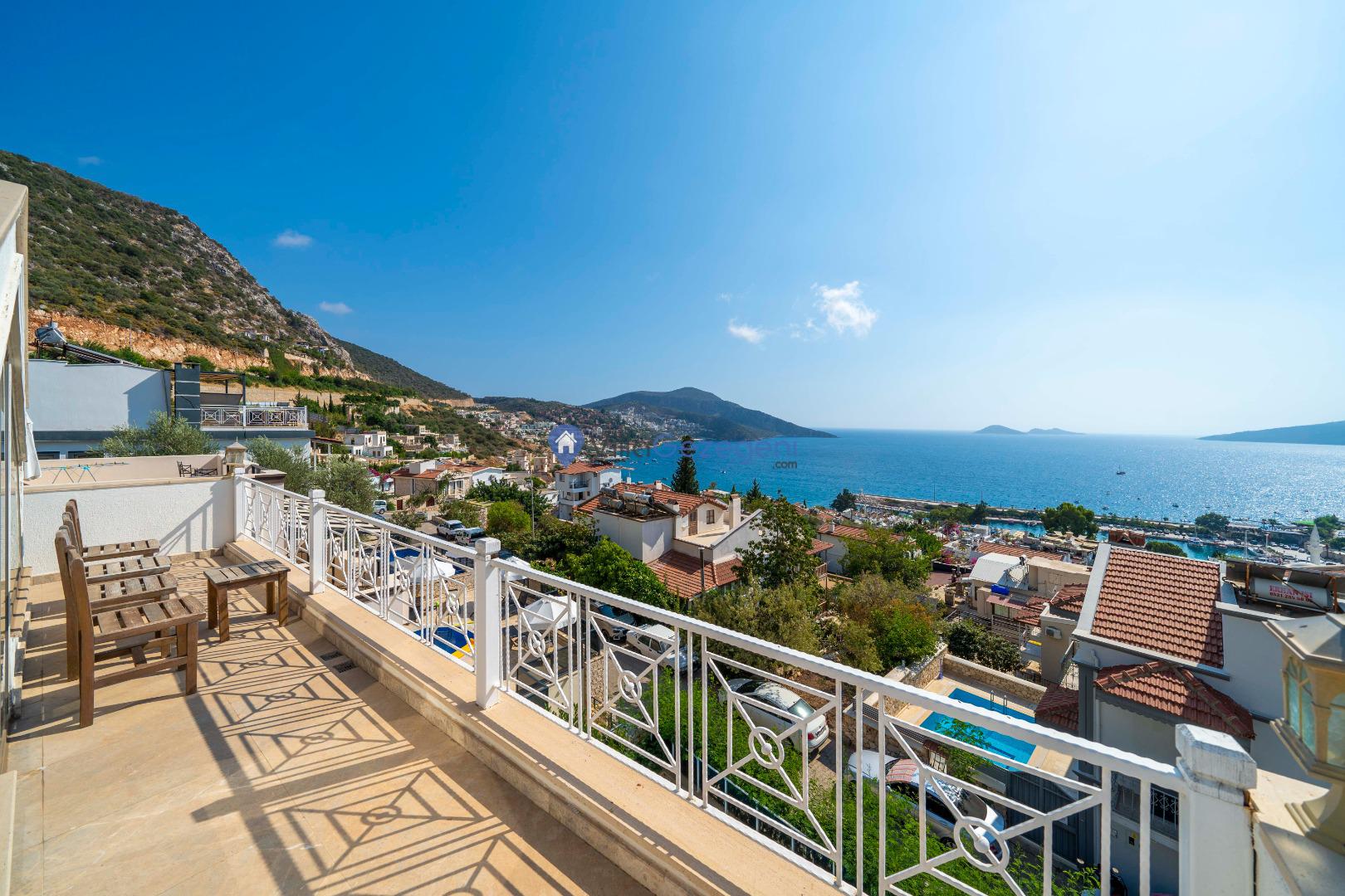Kalkan Merkez Mevkiinde yer alan 5 yatak odalı 10 kişi kapasiteli deniz manzaralı geniş aile ve arkadaş grupları için uygun kiralık tatil villası.