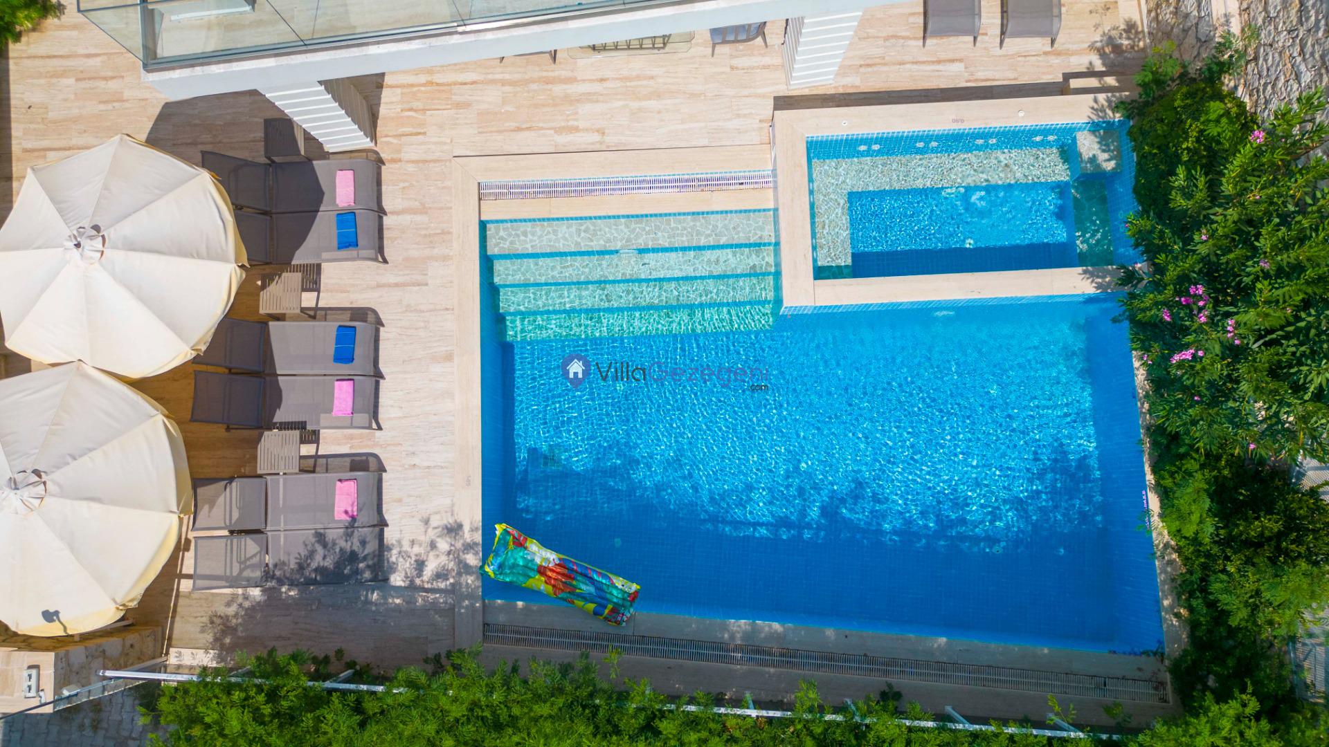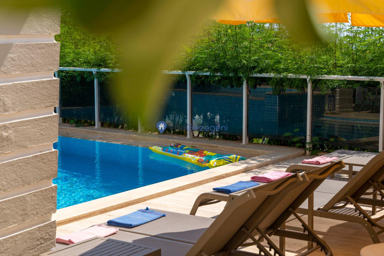 Villamızın bahçe ve havuz terası alanı, misafirlerimizin konforu ve keyifli bir tatil geçirmesi için özenle tasarlanmıştır. Geniş havuz terasında yer alan şezlonglar, gün boyunca güneşlenmek isteyen misafirler için ideal bir alan sunar. Güneşin yoğun olduğu saatlerde ise, havuz başında bulunan güneş şemsiyeleri sayesinde serin ve gölgeli bir dinlenme imkânı sağlanır.