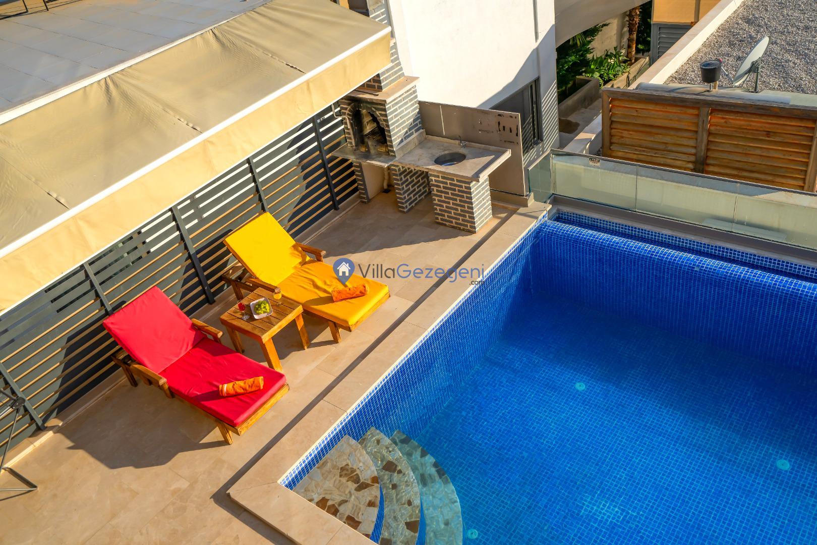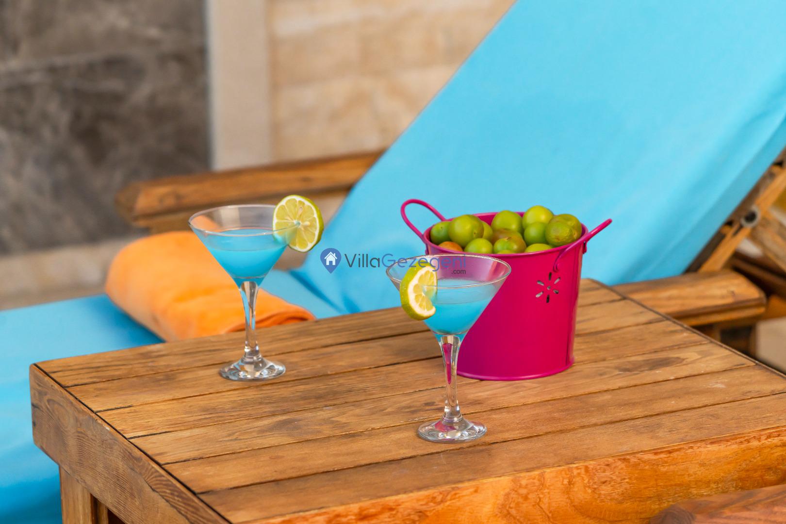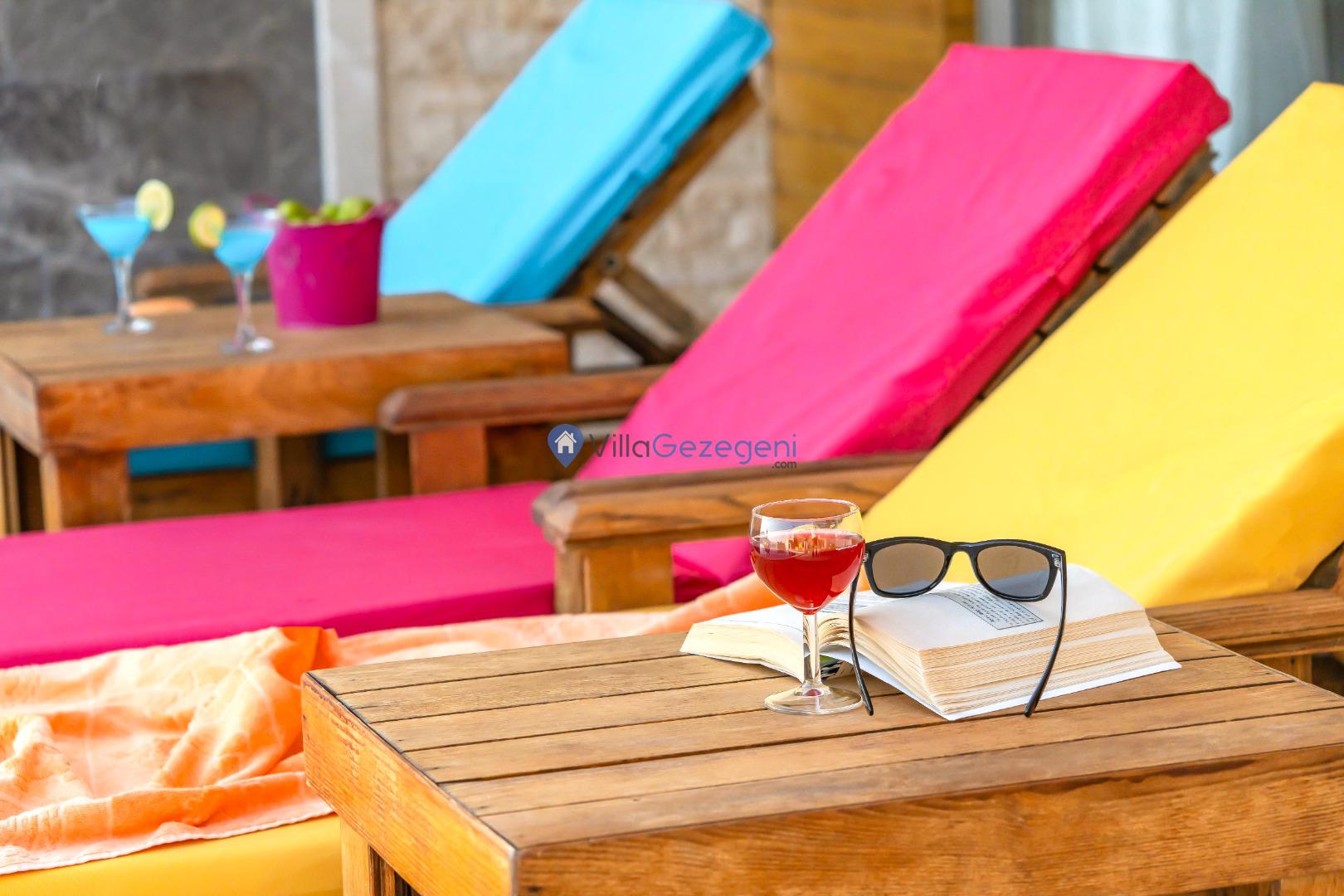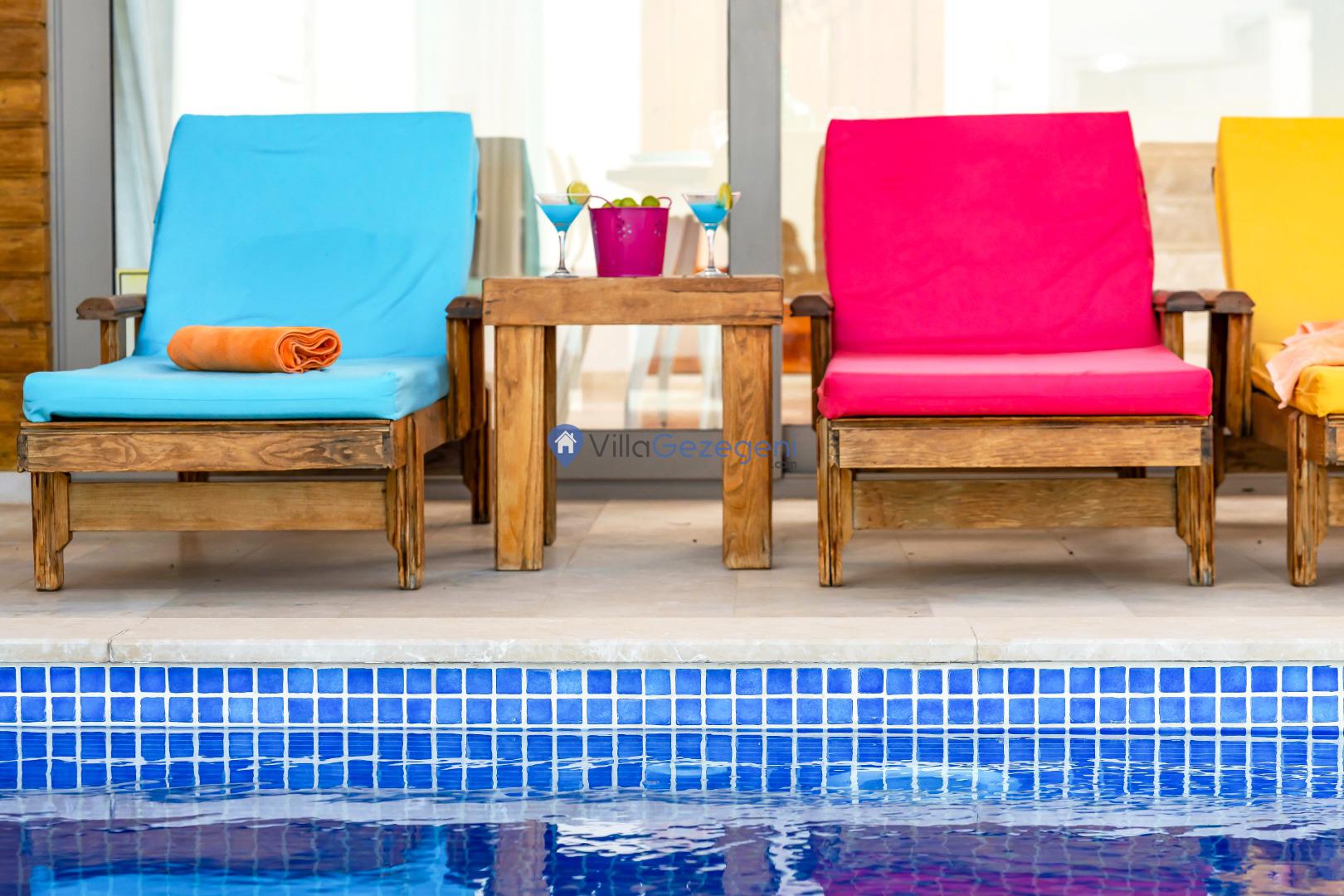 Villanın bahçesinde keyifli bir açık hava deneyimi sunan bir dizi özellik bulunmaktadır. Geniş balkon, rahatlatıcı havuz terası, şezlonglar, yemek masası, şık bahçe mobilyaları, güneş şemsiyesi ve mangal gibi donanımlar, misafirlere açık havada unutulmaz anlar yaşama fırsatı sunar. Villanın bahçesi, konuklara hem dinlendirici bir atmosfer hem de sosyal etkileşim için ideal bir ortam sağlar.