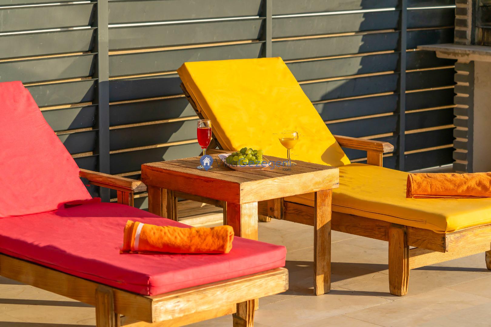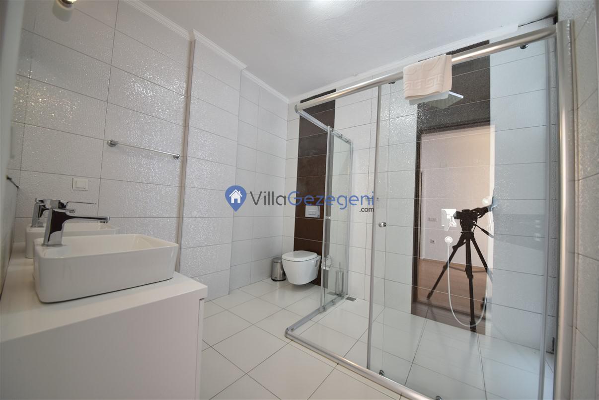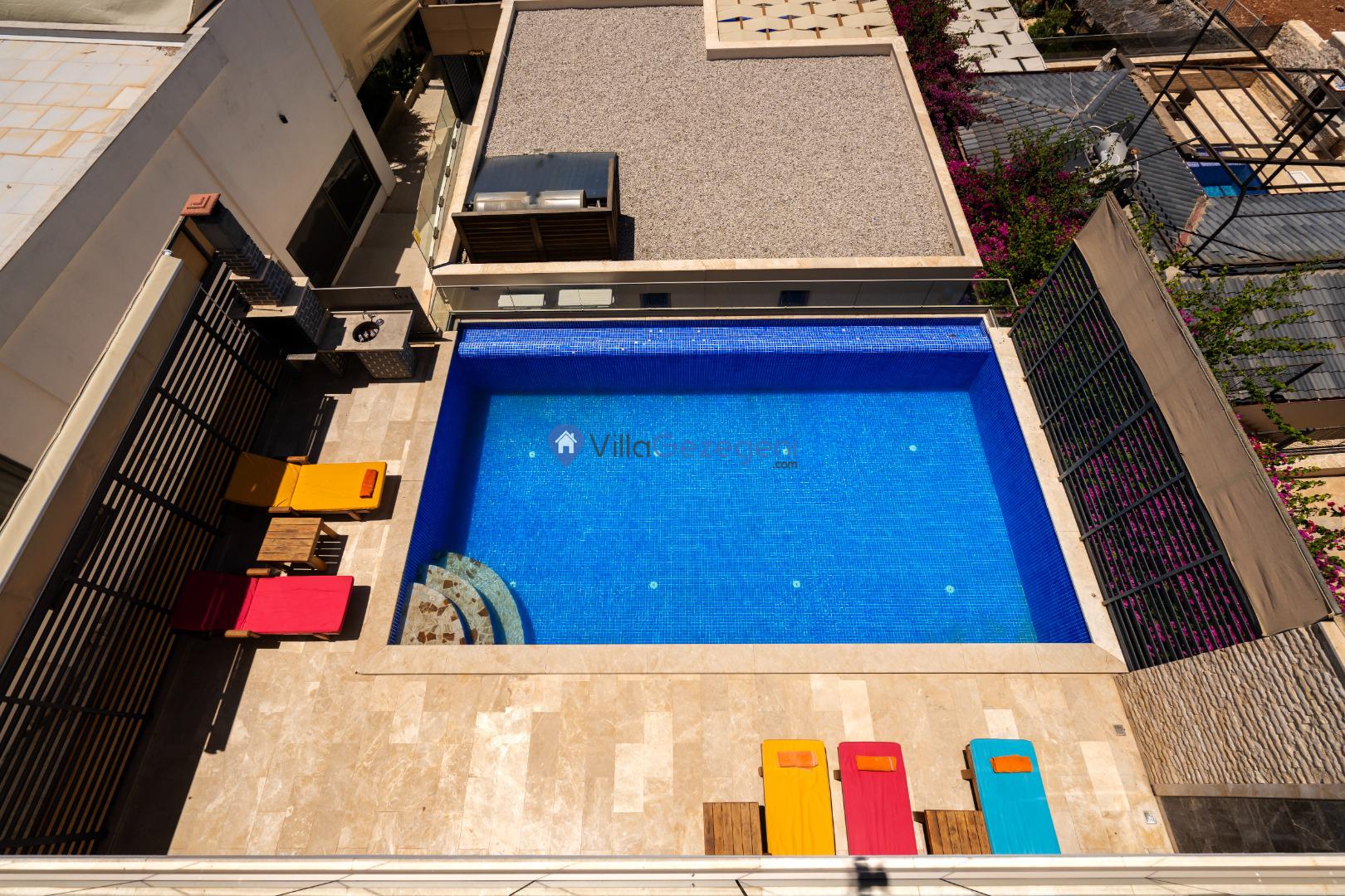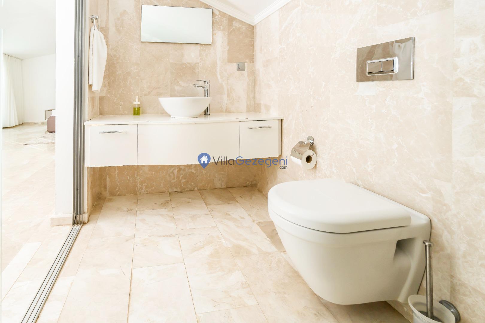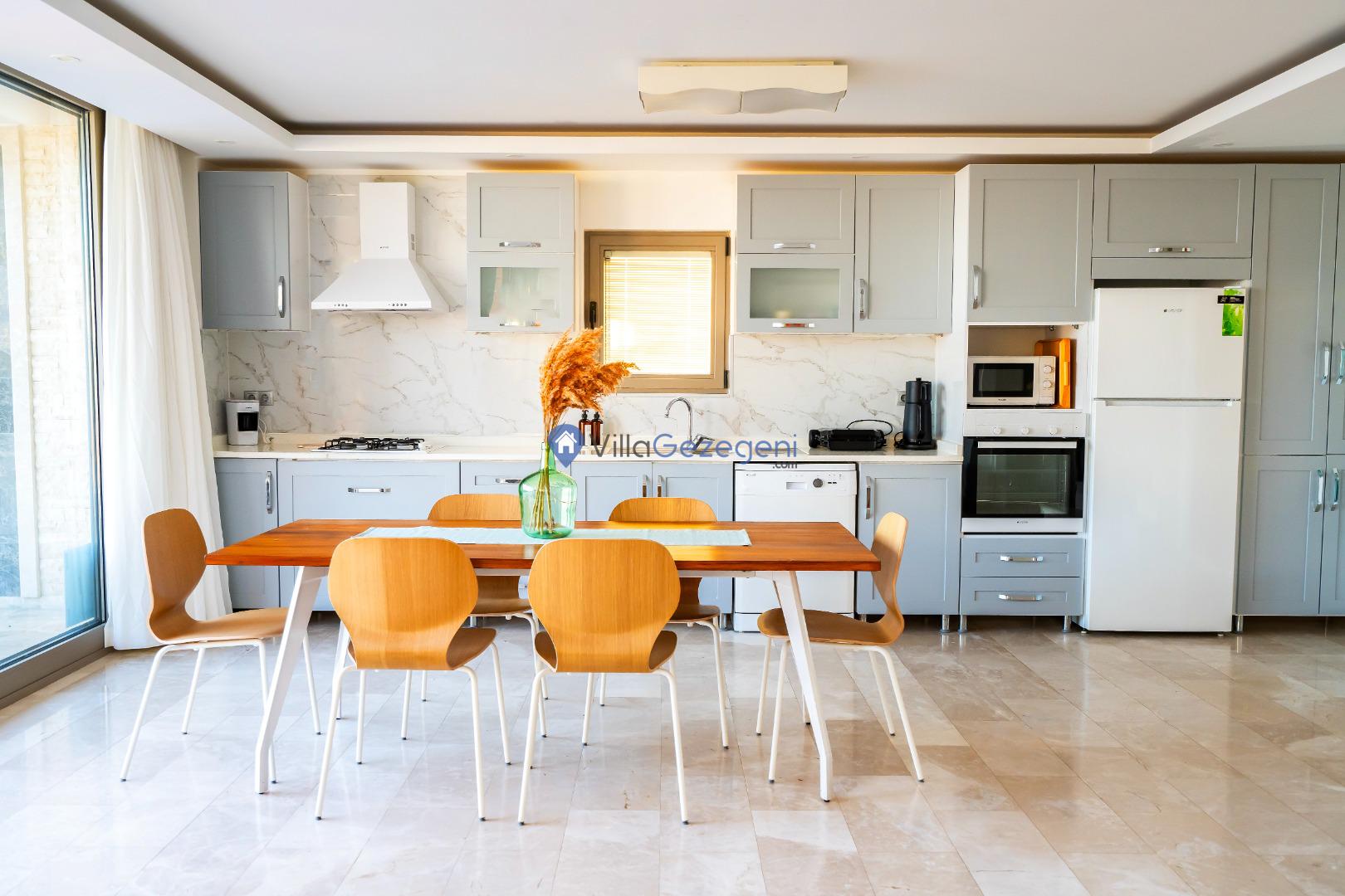 Villanın bahçesinde keyifli bir açık hava deneyimi sunan bir dizi özellik bulunmaktadır. Geniş balkon, rahatlatıcı havuz terası, şezlonglar, yemek masası, şık bahçe mobilyaları, güneş şemsiyesi ve mangal gibi donanımlar, misafirlere açık havada unutulmaz anlar yaşama fırsatı sunar. Villanın bahçesi, konuklara hem dinlendirici bir atmosfer hem de sosyal etkileşim için ideal bir ortam sağlar.