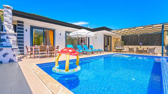 Villamızın genel konsept ve özelliklerinden tekrar bahsedecek olursak; villamızın 1 adet müstakil özel havuzu bulunmaktadır. Ortalama bir bahçeye sahip olan villamız rahatlığı ön planda tutan 2 adet yatak odası, 3 yatak,2 banyo, hareket alanı geniş bir mutfak ve 4 kişinin geniş aralıklarla rahatlıkla oturabileceği koltuklara sahip salonu bulunmaktadır.