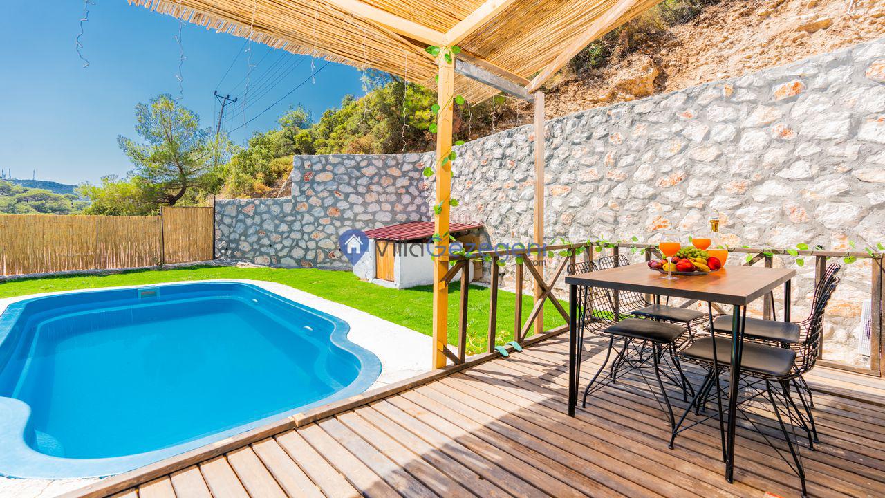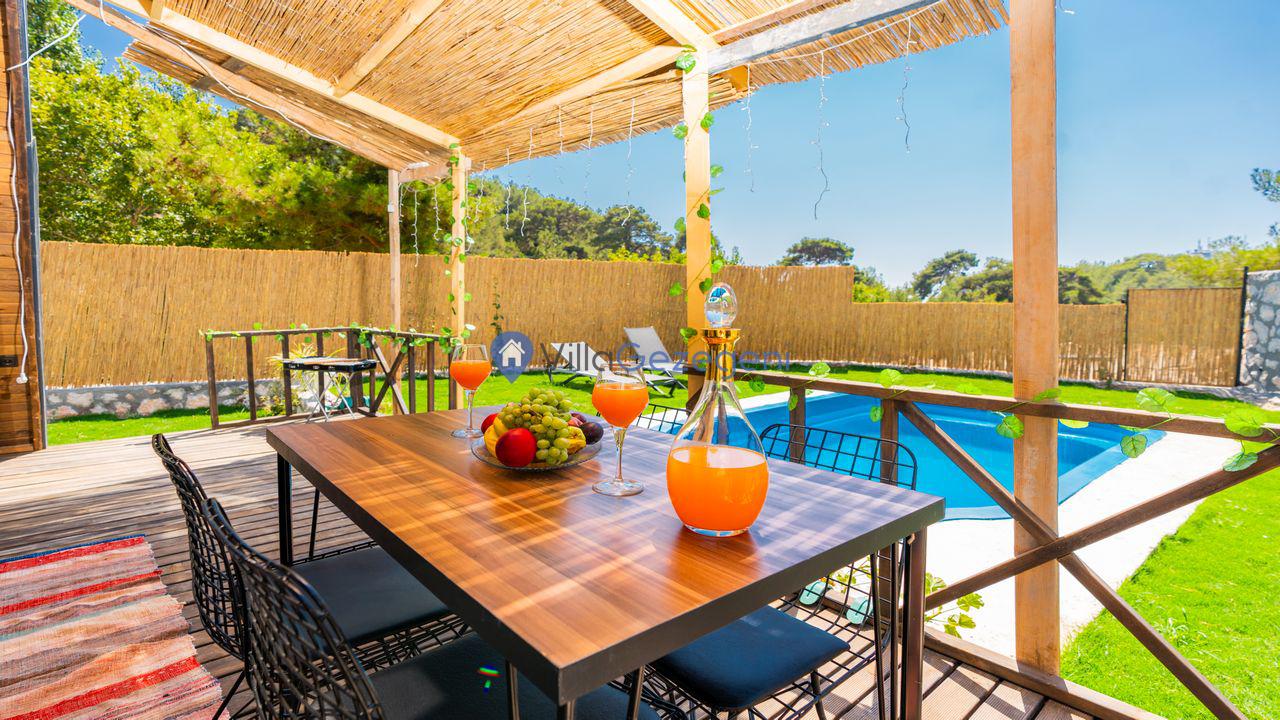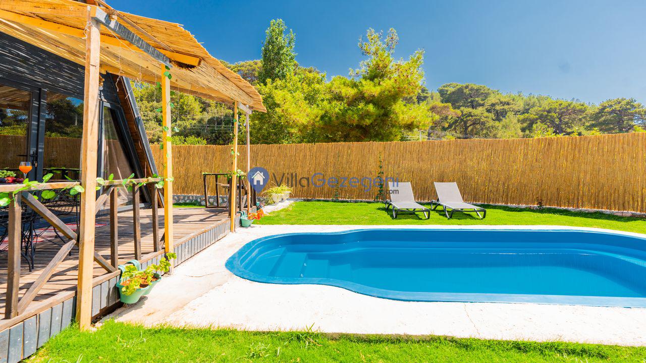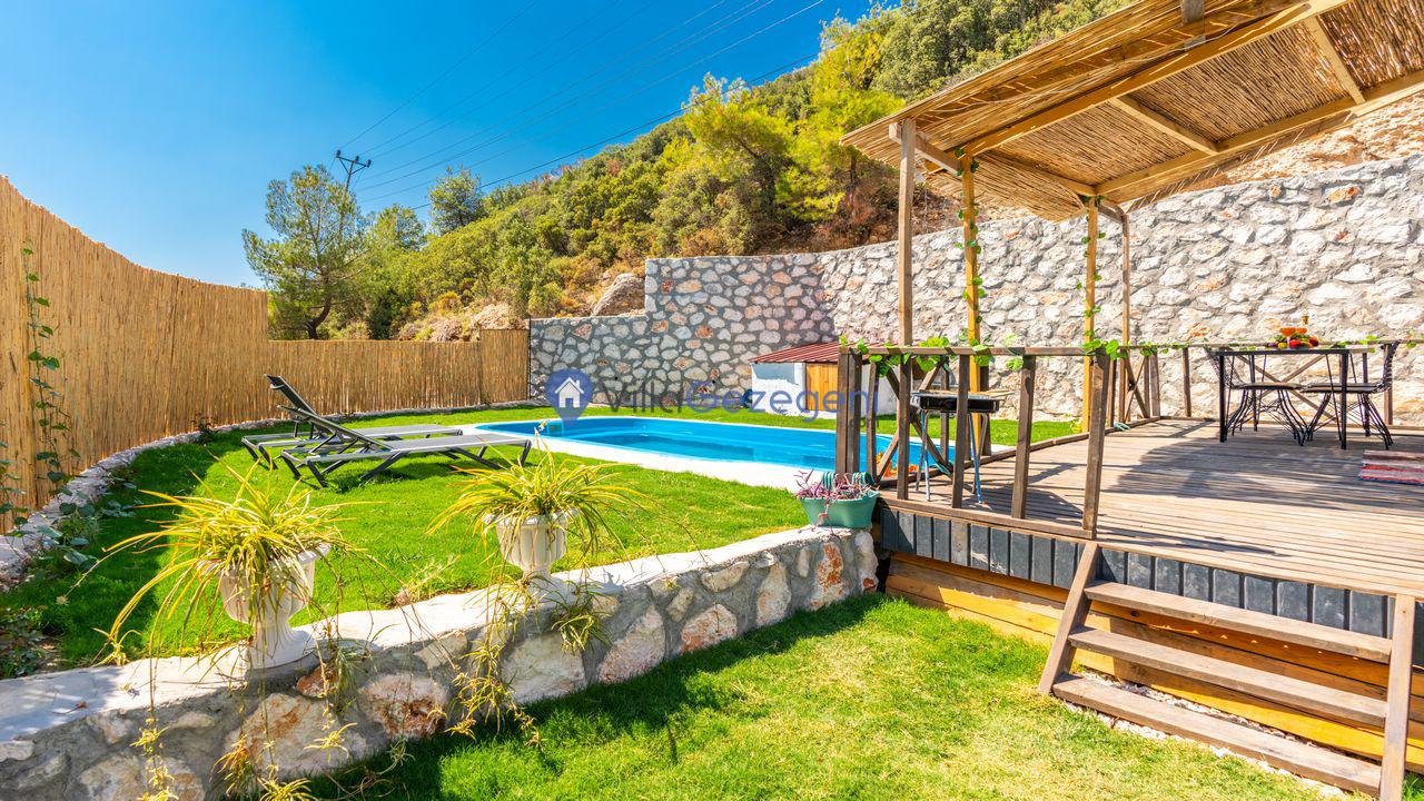Kalkan Sarıbelen bölgesinde yer alan 2 yatak odalı 4 kişilik havuzu korunaklı,doğa içerisinde kiralık aile ve balayı villası.
