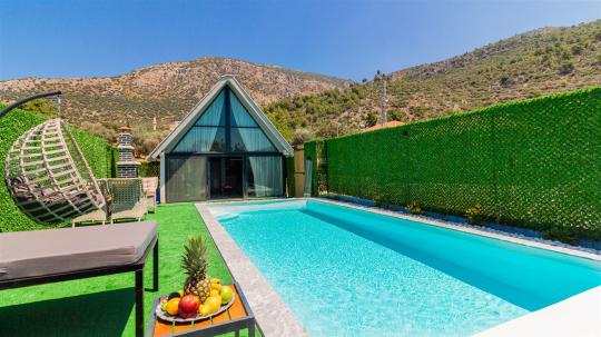Kalkan Çayköy bölgesinde yer alan 2 yatak odalı 4 kişilik havuzu korunaklı, jakuzili, doğa içerisinde muhafazakar kiralık aile ve balayı villası.