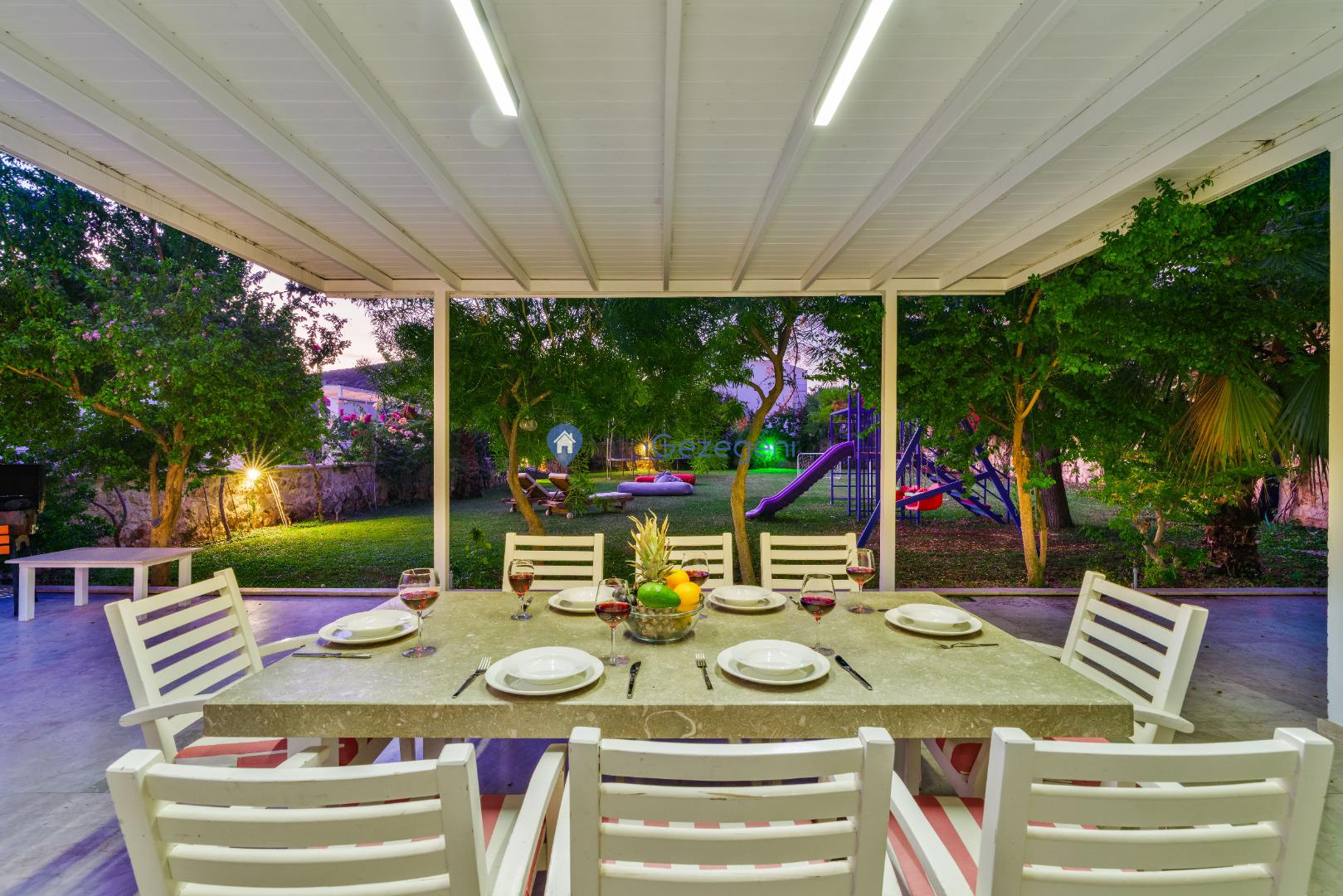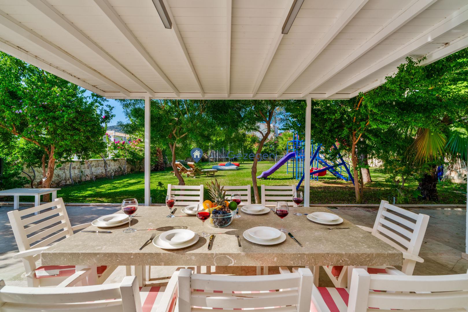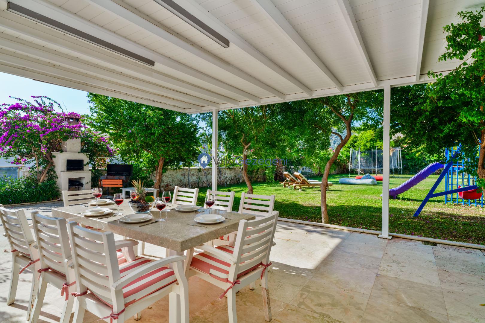 Yemek Masası ve bahçe mobilyaları kullanımınız için hazır bulunmaktadır sevdikleriniz ile beraber yemekler yiyip sohbetin dibine vurabilirsiniz. Villanın bahçesindeki salıncak ile keyifli vakitler geçirebilirsiniz.