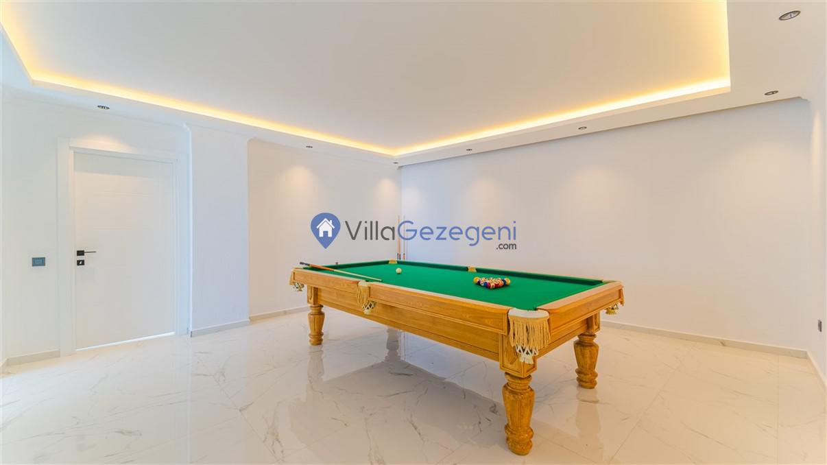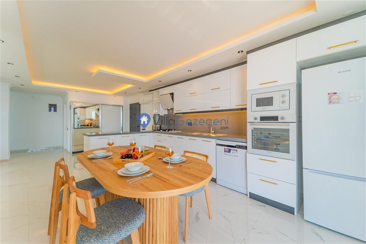 Villanın geniş ve ferah salonu, şık mobilyalar ve rahat oturma düzenlemeleriyle dikkat çekerken, tam donanımlı mutfak, yemek pişirme sürecini hem kolay hem de keyifli hale getirir. Mutfakta bulunan modern aletler ve geniş tezgah alanları, her türlü yemek hazırlığı için idealdir.