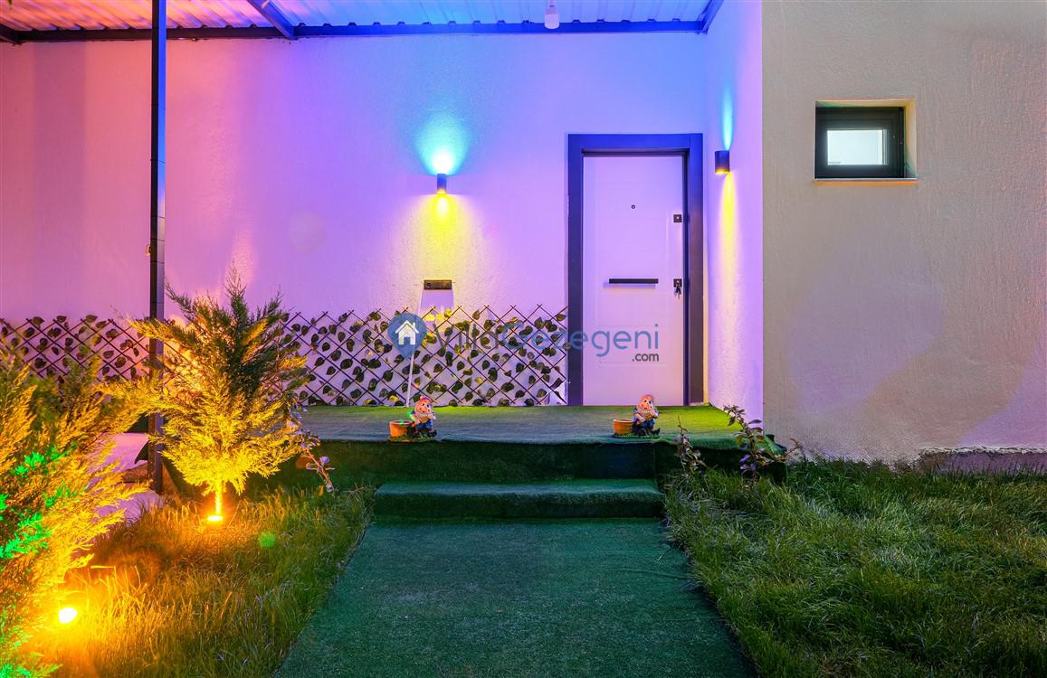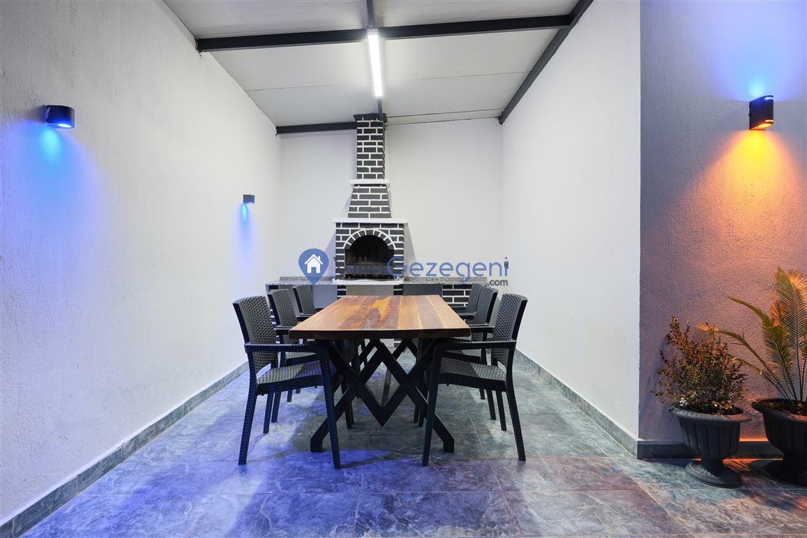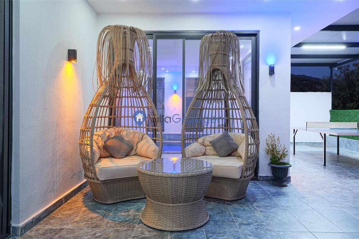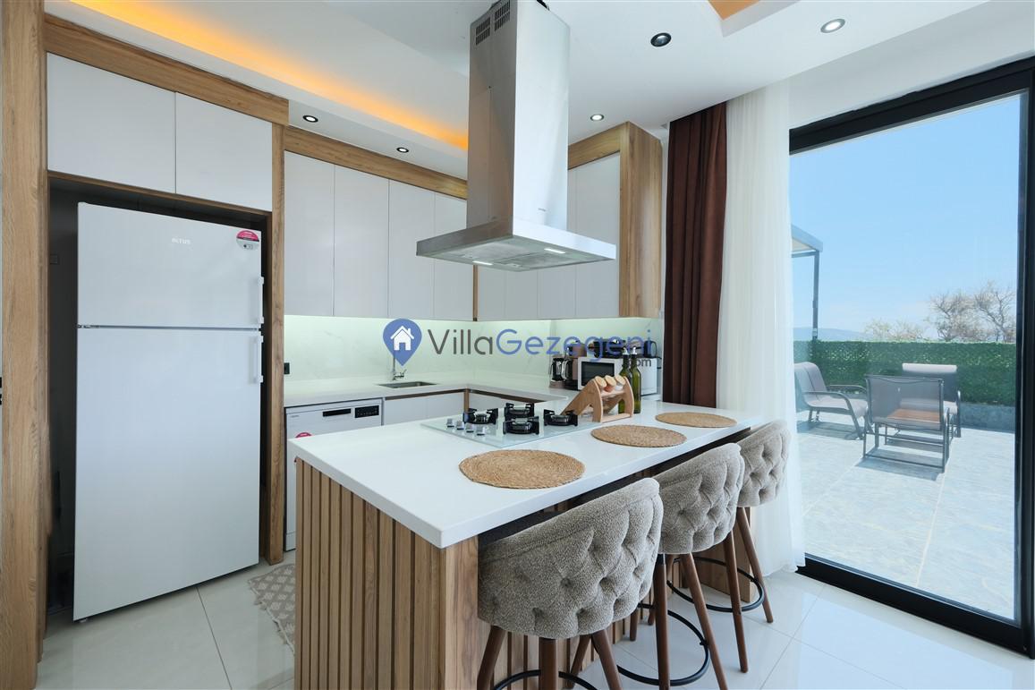 Villanın geniş ve ferah salonu, şık mobilyalar ve rahat oturma düzenlemeleriyle dikkat çekerken, tam donanımlı mutfak, yemek pişirme sürecini hem kolay hem de keyifli hale getirir. Mutfakta bulunan modern aletler ve geniş tezgah alanları, her türlü yemek hazırlığı için idealdir.