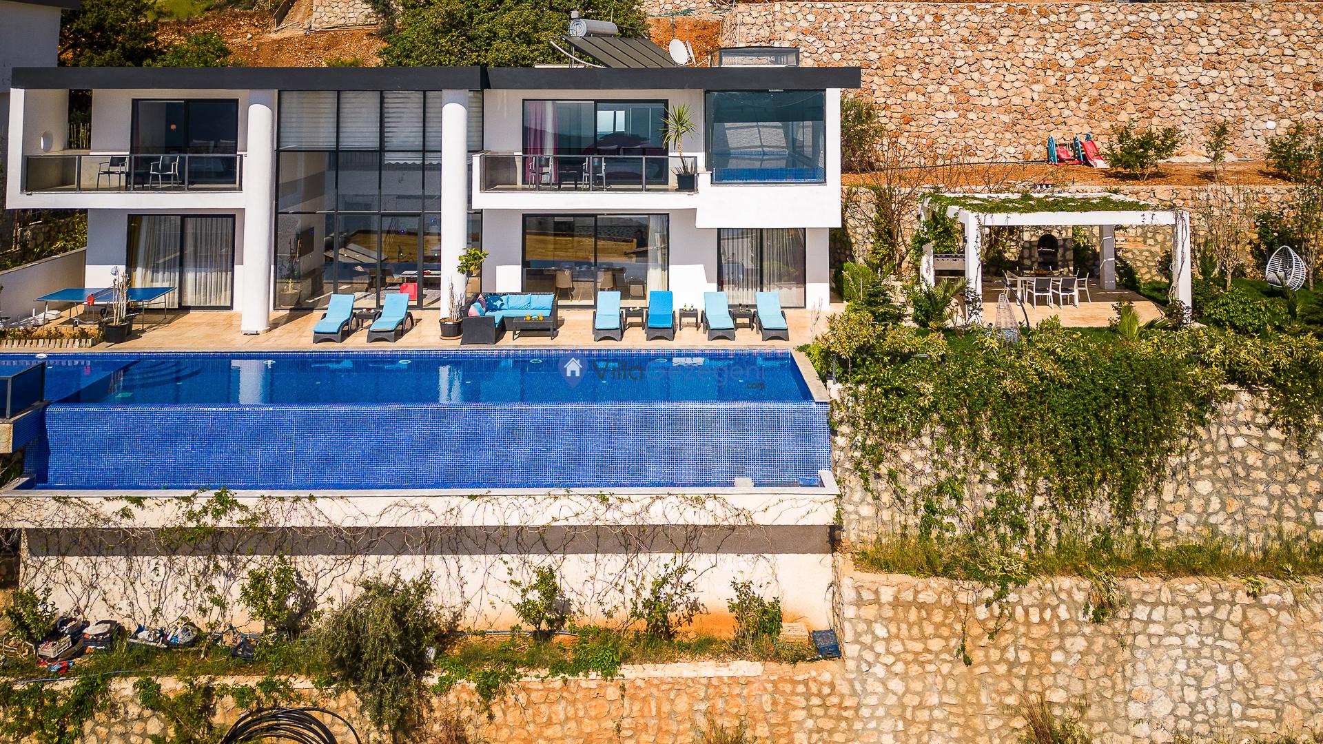 Kalkan Kördere mevkiisinde merkeze yakın konumlanmış olan 4 yatak odalı 8 kişilik korunaklı havuzlu villa