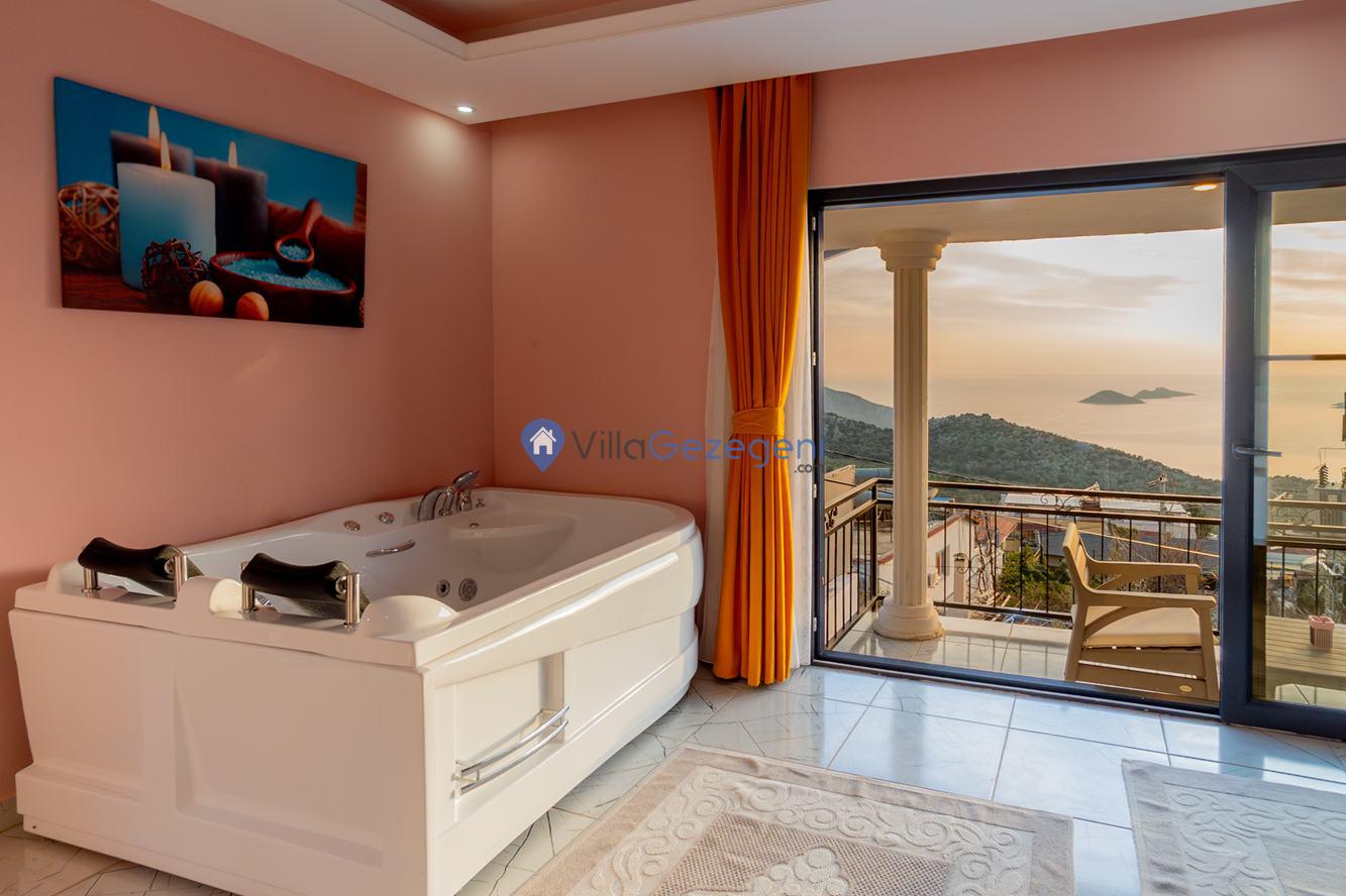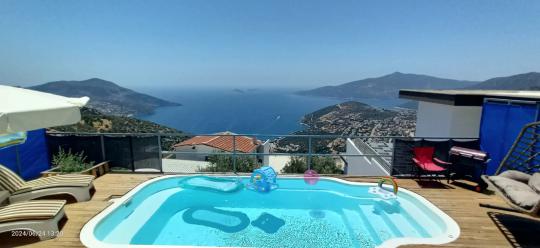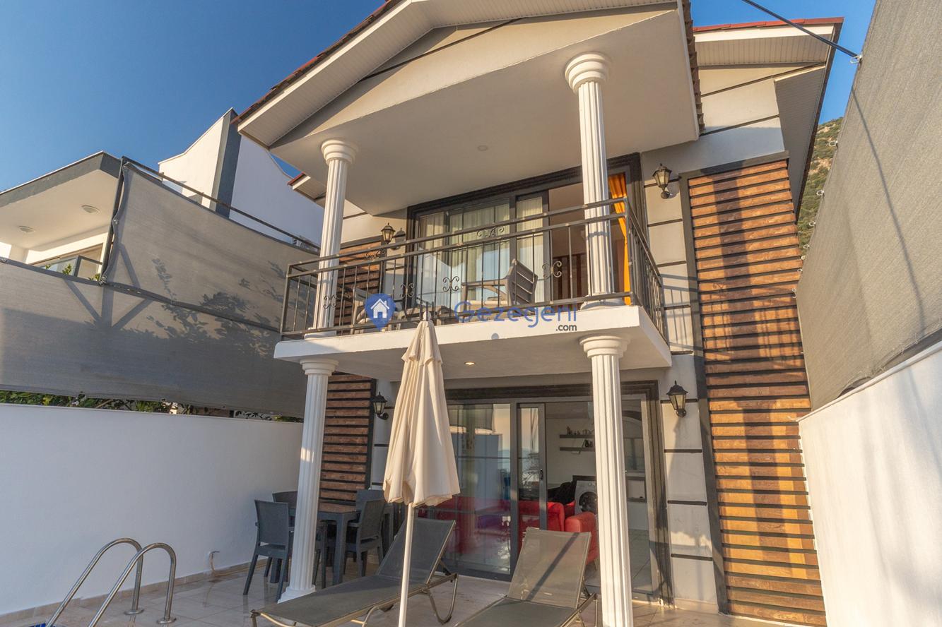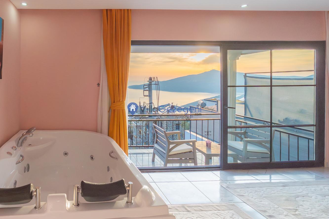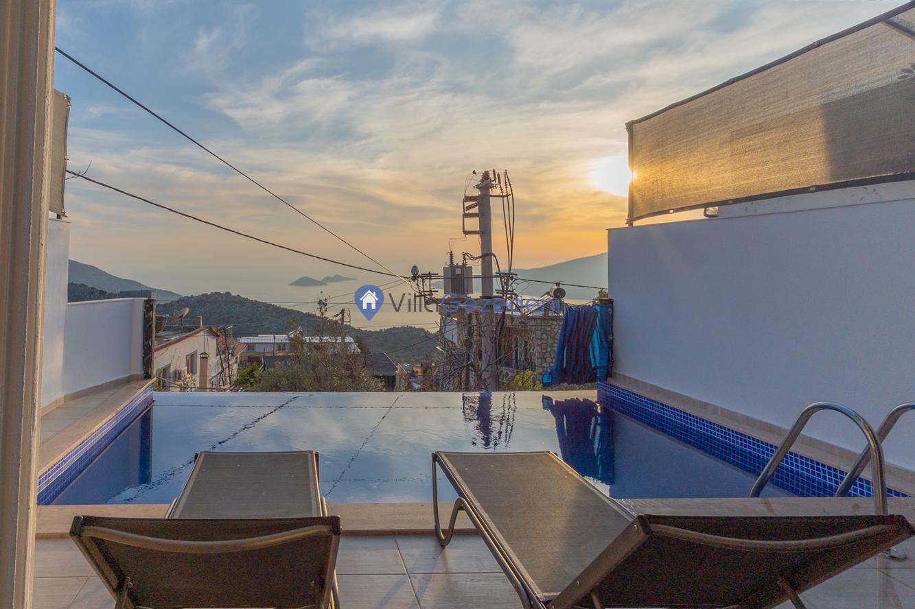 Kaş/Kalkan/Kördere Bölgesinde yer alan tek yatak odalı 2 kişi kapasiteli havuzu korunaklı deniz manzaralı balayı balayı villası.