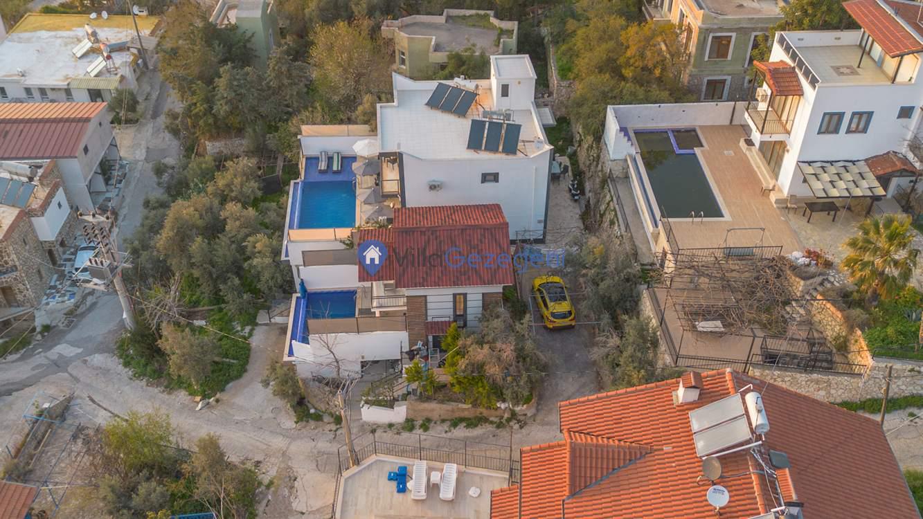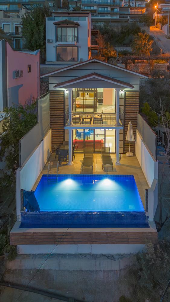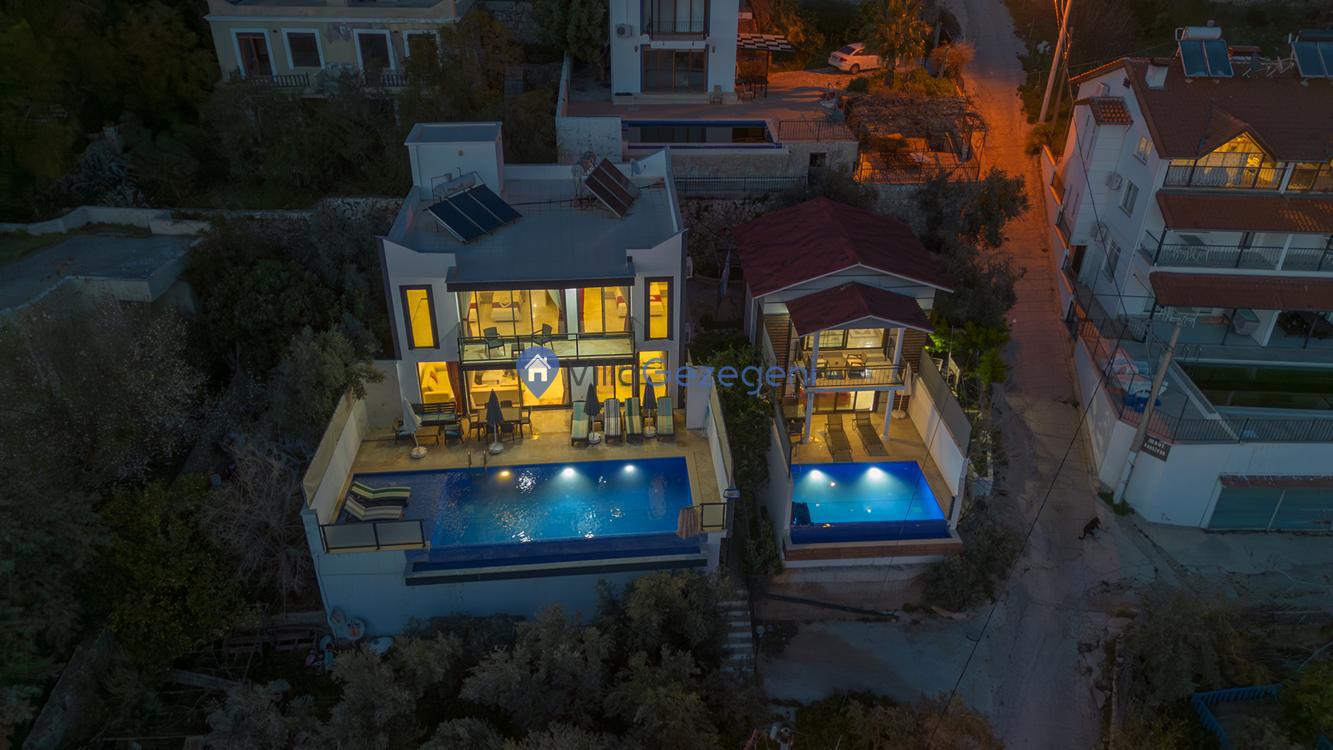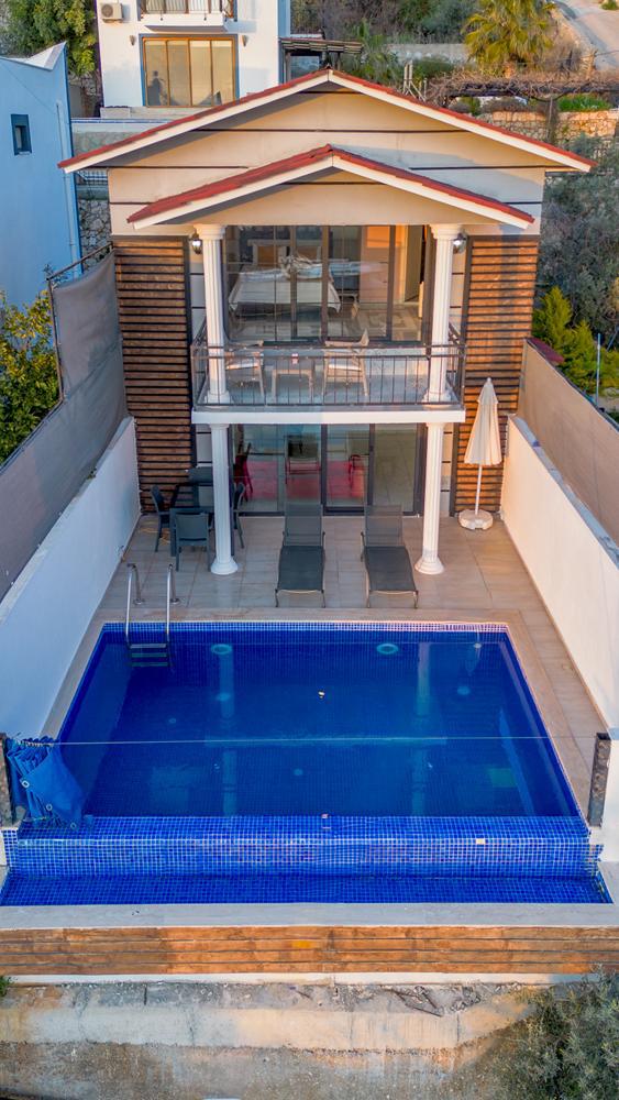 Kaş Kalkan Kördere bölgesinde yer alan 3 yatak odalı 6 kişi kapasiteli ısıtmalı kapalı havuzlu,saunalı lüks kiralık tatil villası.