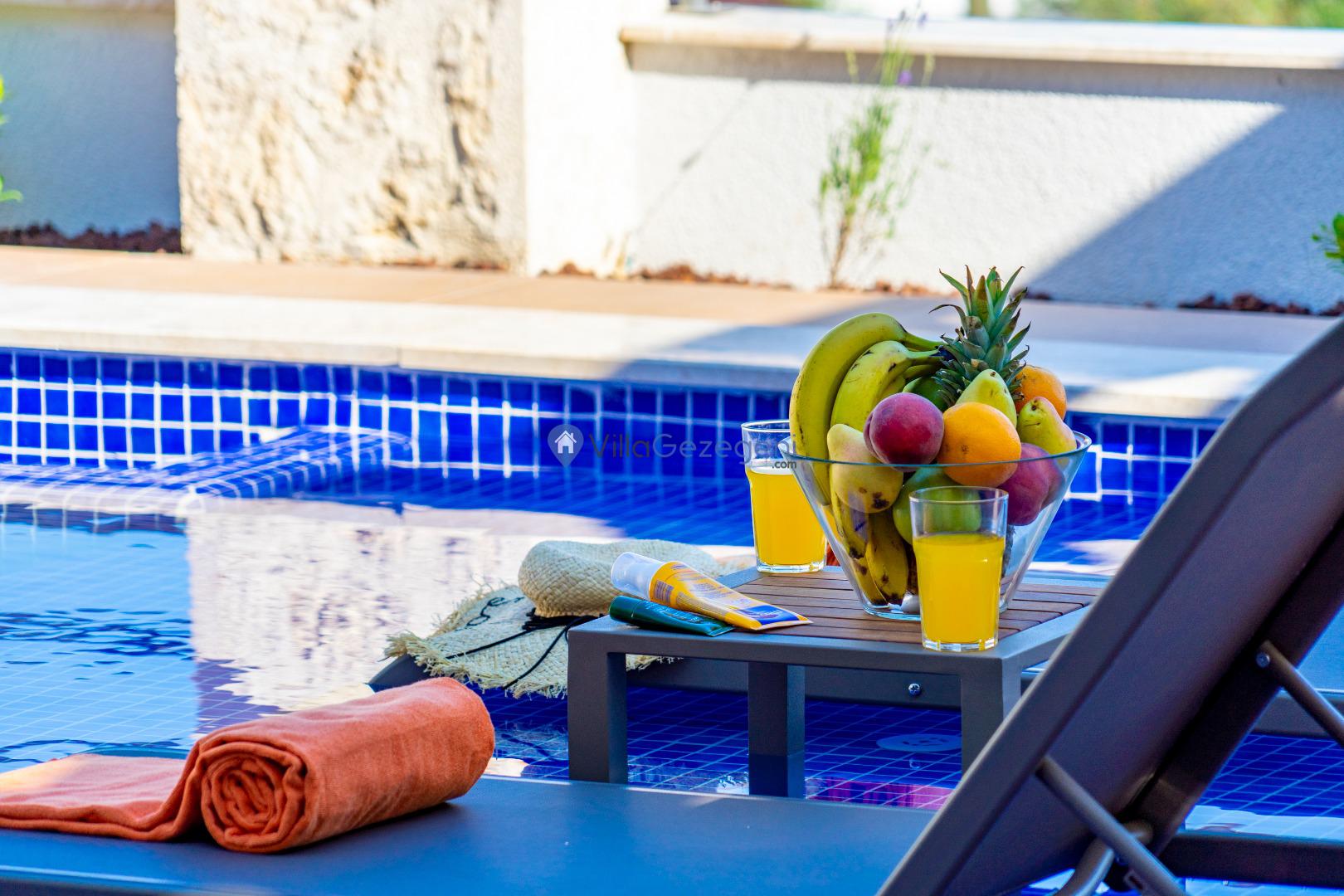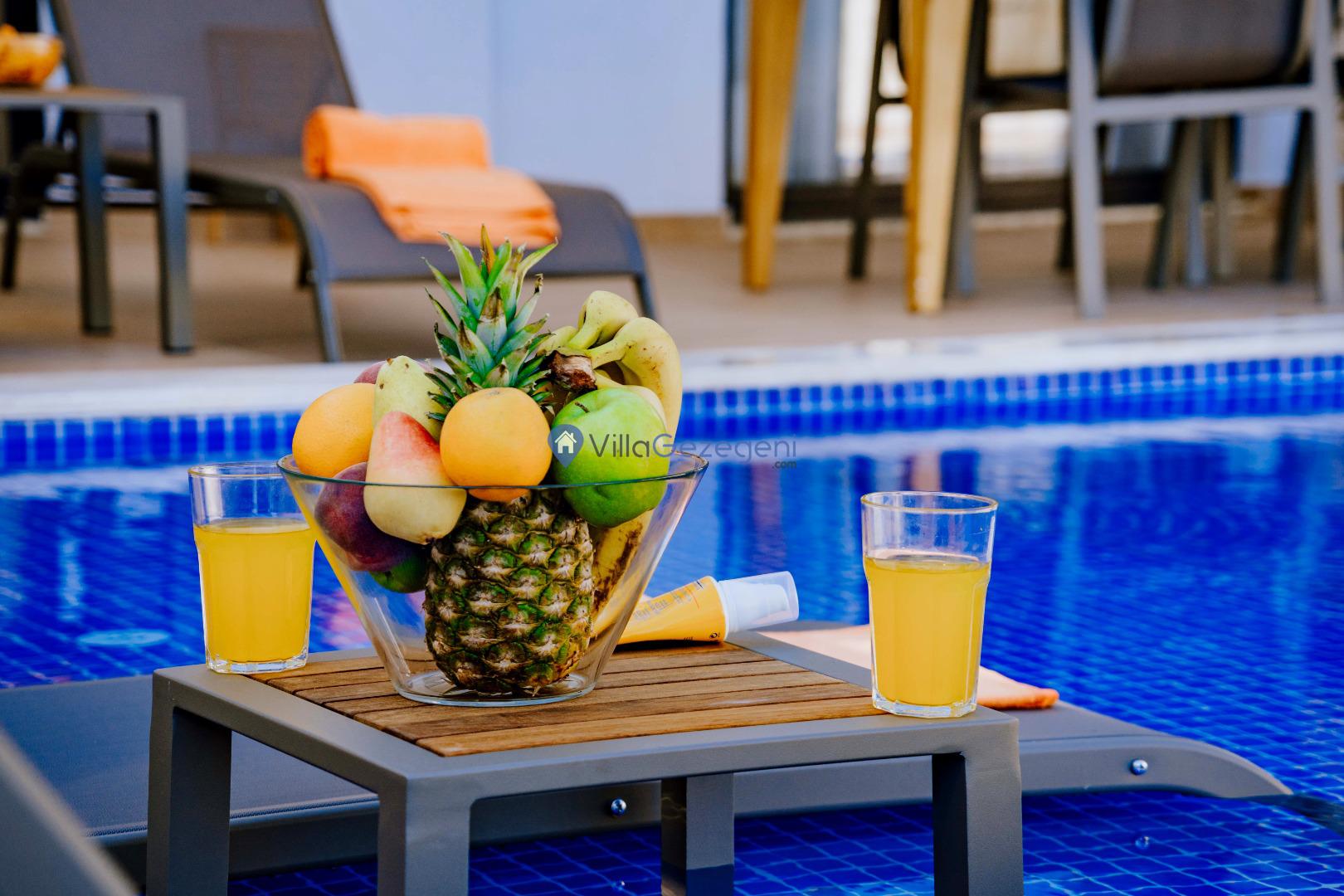 Villamızın genel konsept ve özelliklerinden tekrar bahsedecek olursak; villamızın 1 adet müstakil özel havuzu bulunmaktadır. Ortalama bir bahçeye sahip olan villamız rahatlığı ön planda tutan 3 adet yatak odası,3 yatak 3 banyo, hareket alanı geniş bir mutfak ve 6 kişinin geniş aralıklarla rahatlıkla oturabileceği koltuklara sahip salonu bulunmaktadır.
