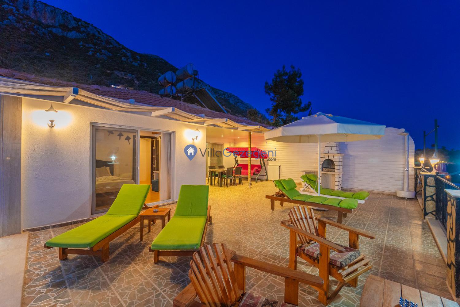Kalkan Kördere Sarnıçbaşı mevkiinde yer alan 2 yatak odalı 4 kişi kapasiteli deniz manzaralı kiralık tatil villası.