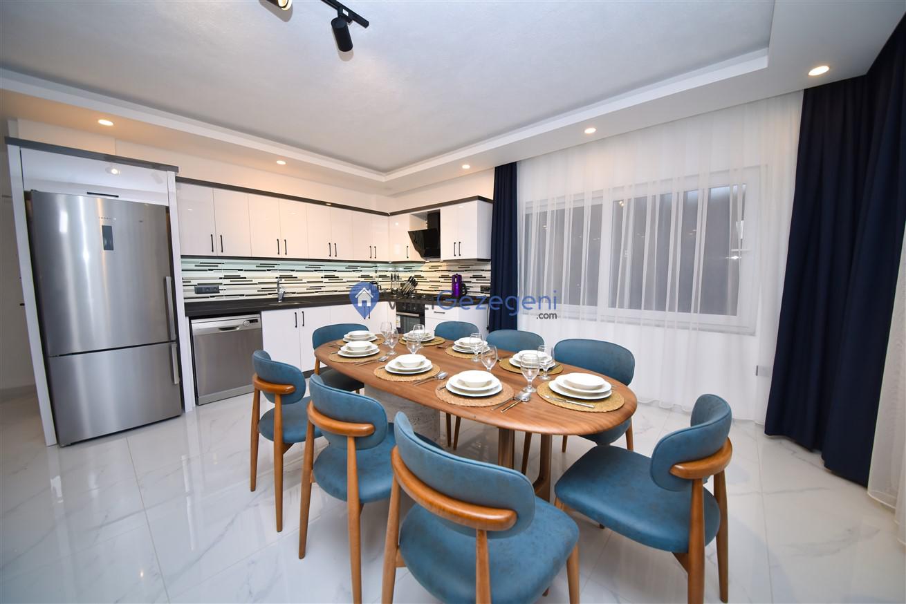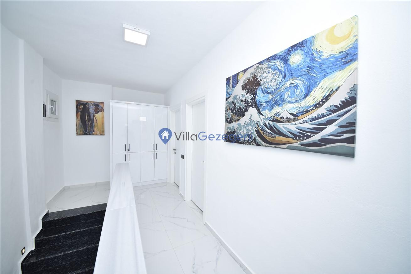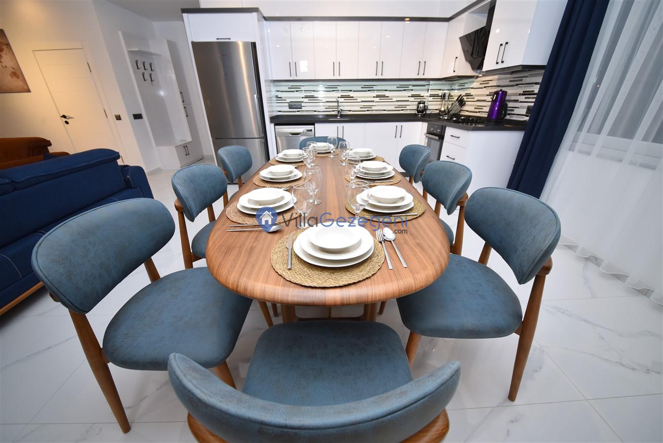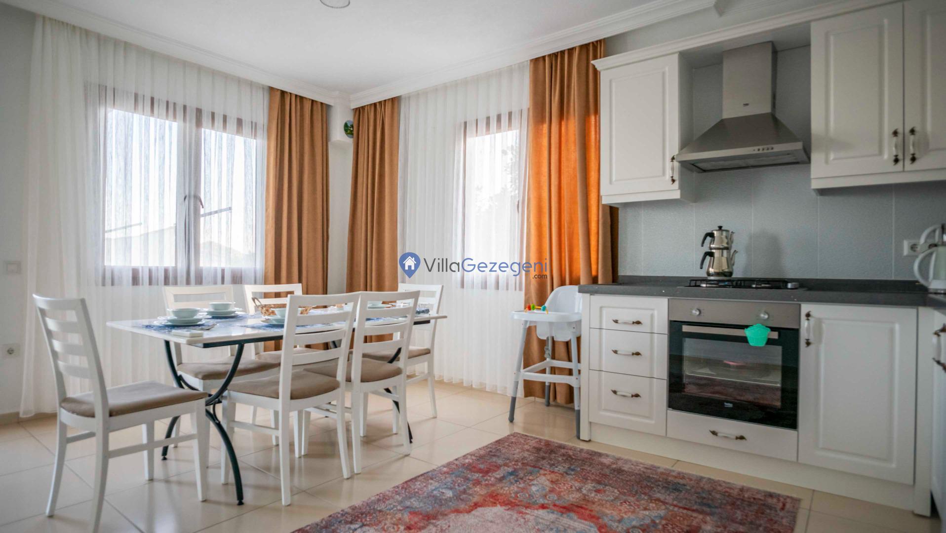 Villanın geniş ve ferah salonu, şık mobilyalar ve rahat oturma düzenlemeleriyle dikkat çekerken, tam donanımlı mutfak, yemek pişirme sürecini hem kolay hem de keyifli hale getirir. Mutfakta bulunan modern aletler ve geniş tezgah alanları, her türlü yemek hazırlığı için idealdir.