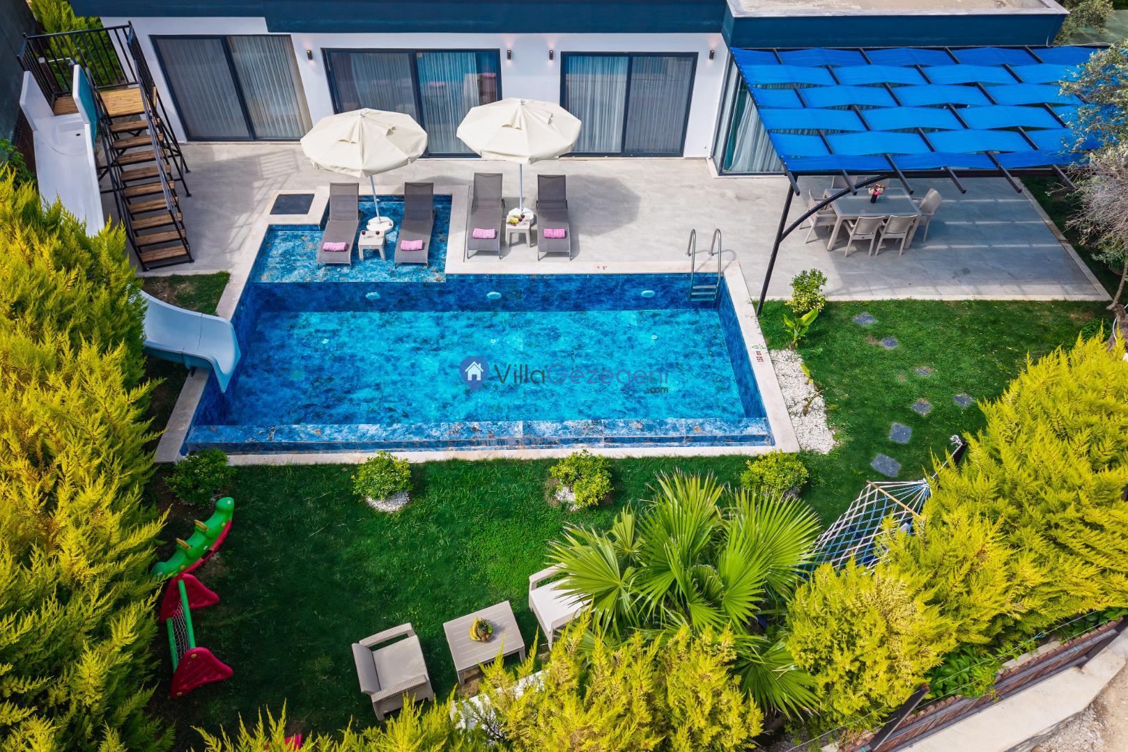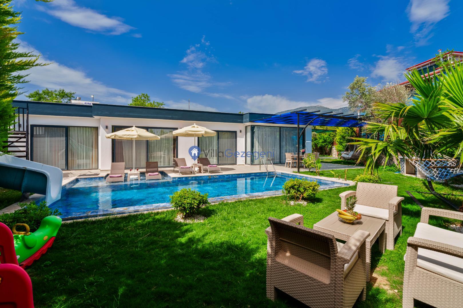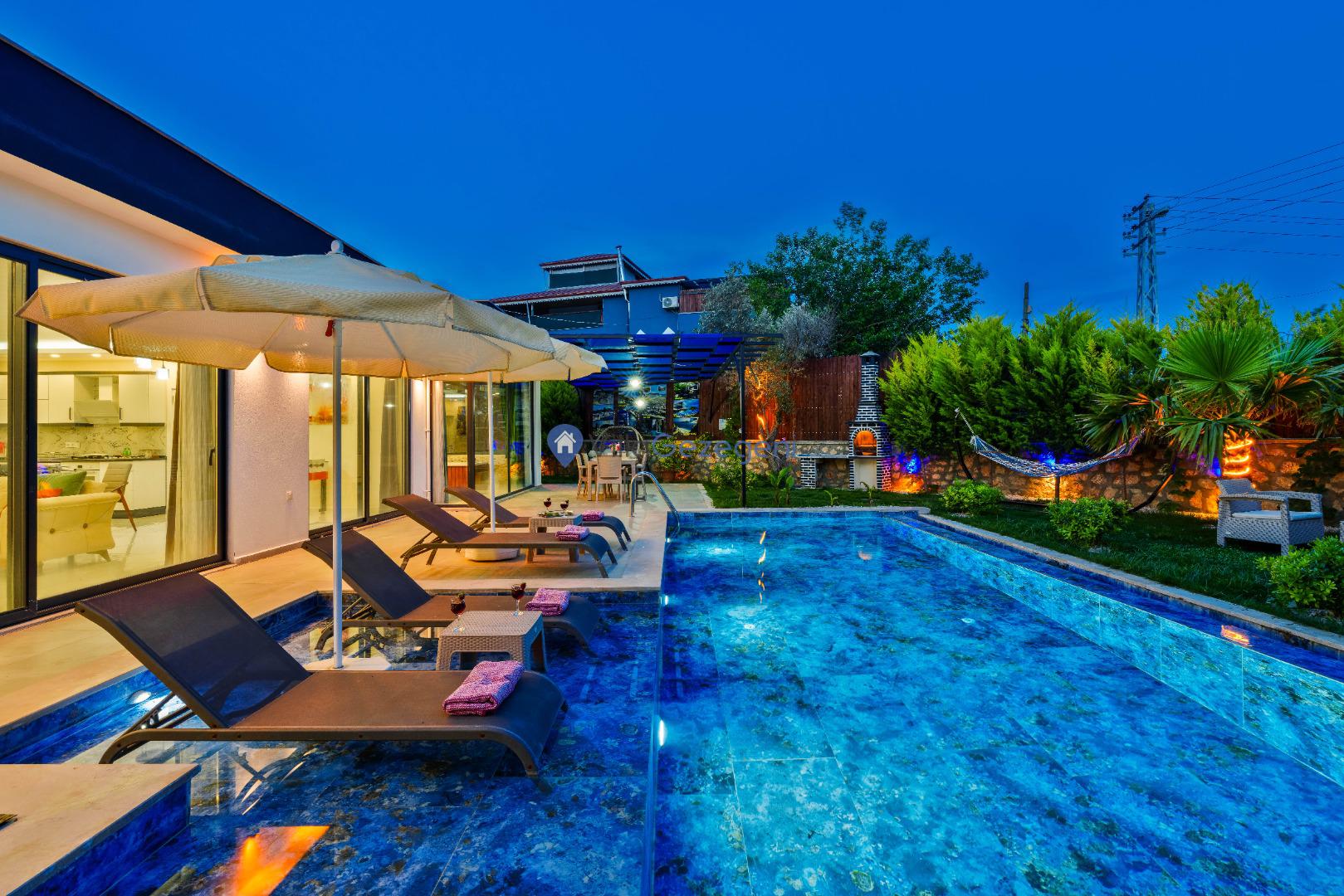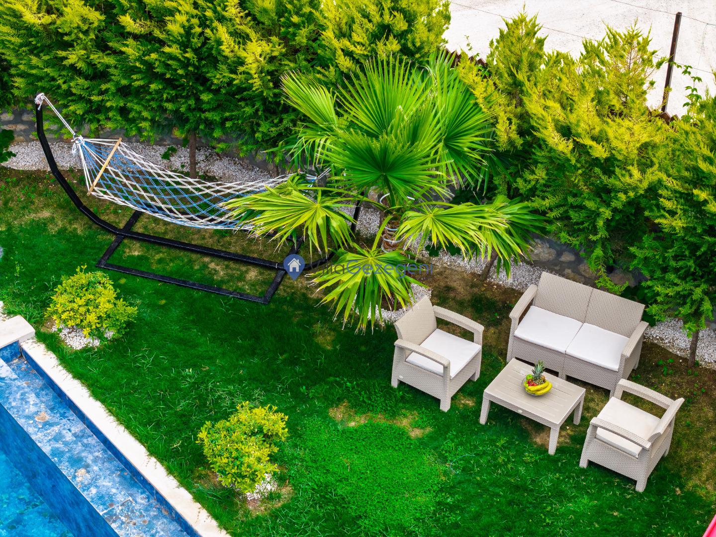 Villanın bahçesi ve havuz alanı, tatil boyunca hem eğlenmek hem de dinlenmek için mükemmel bir ortam sağlar. Geniş havuz terasında güneşlenebilir, şık bahçe mobilyalarında rahatlayabilirsiniz. Bahçedeki barbekü alanı, açık havada keyifli yemekler hazırlamanız için harika bir imkan sunar.