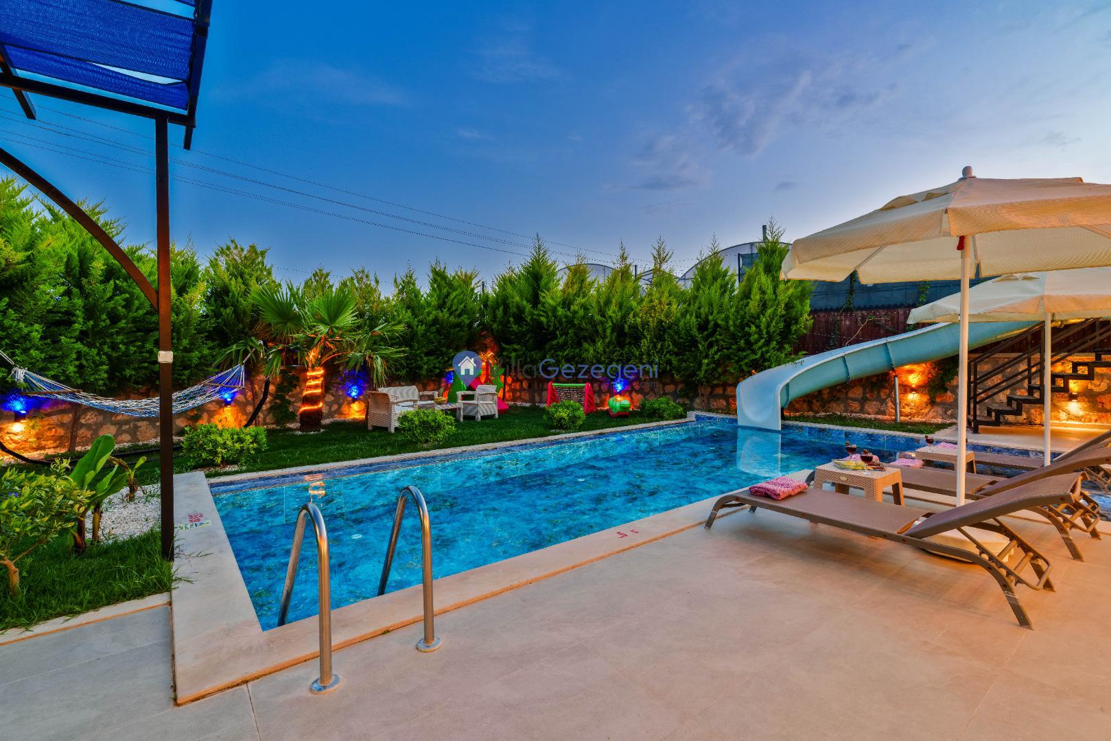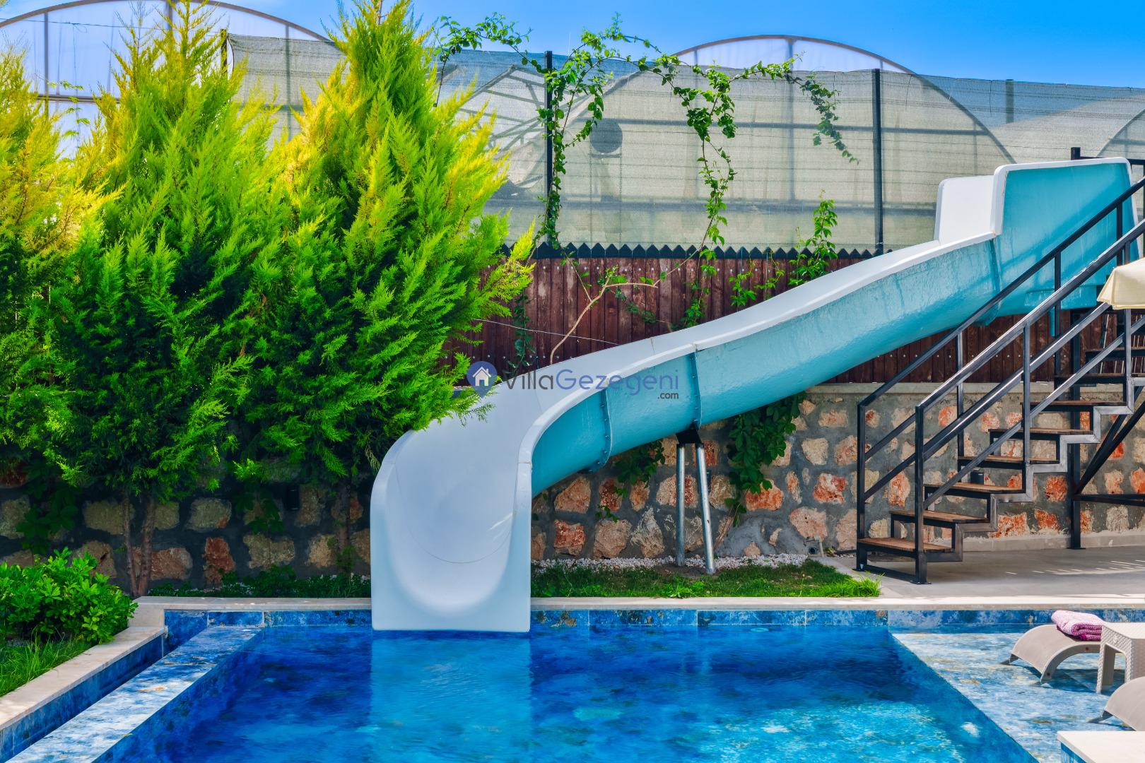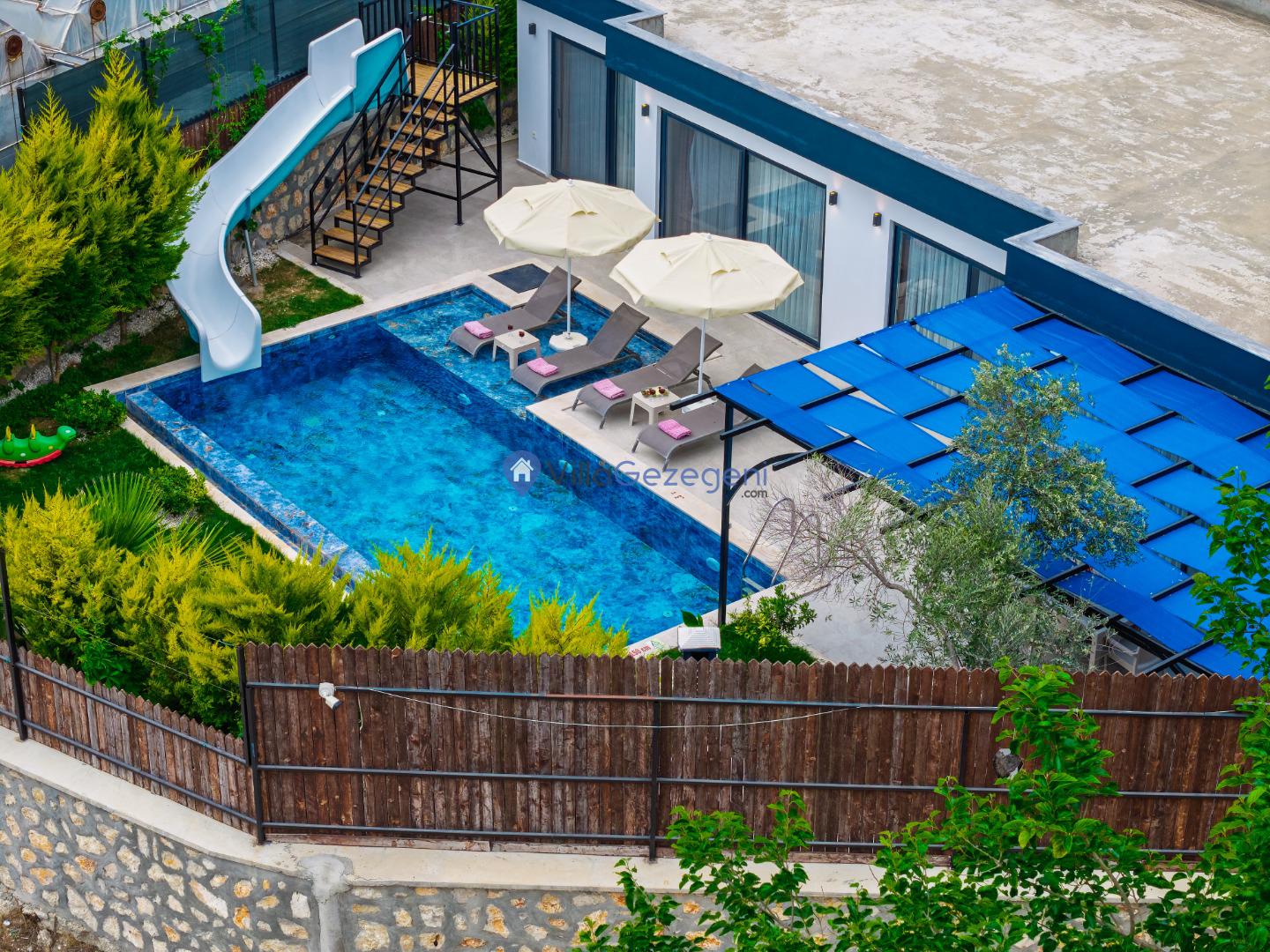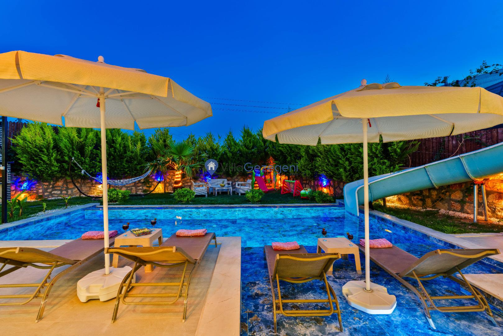Havuz çevresindeki şezlonglar ve çocuk havuzu, hem yetişkinler hem de çocuklar için keyifli vakit geçirme imkanı sağlar.