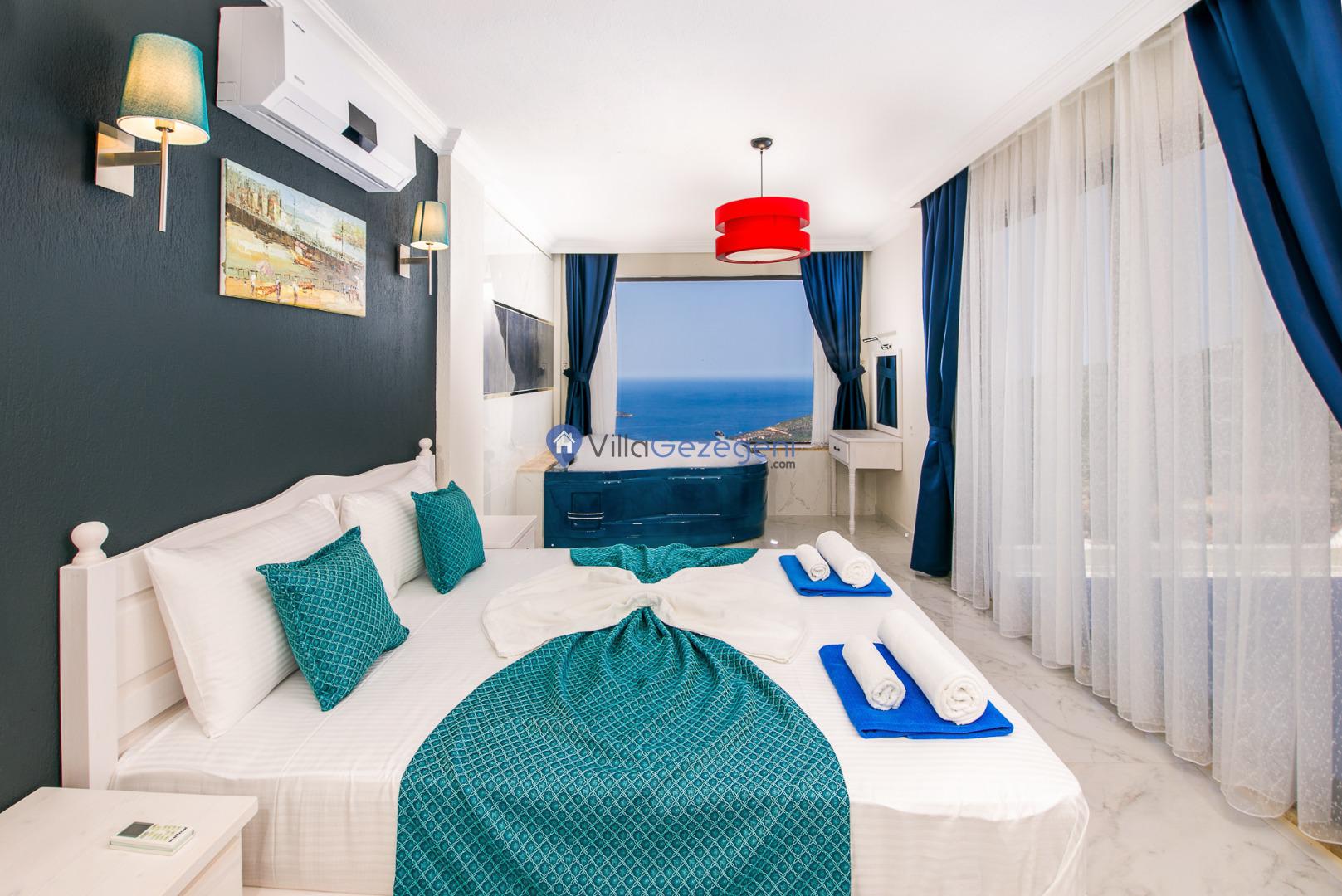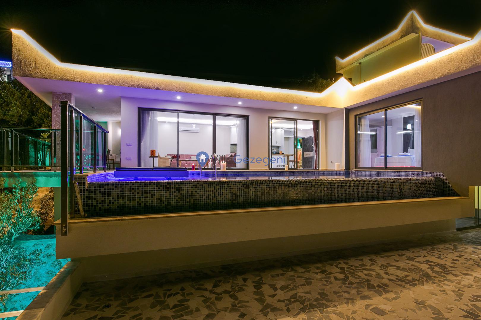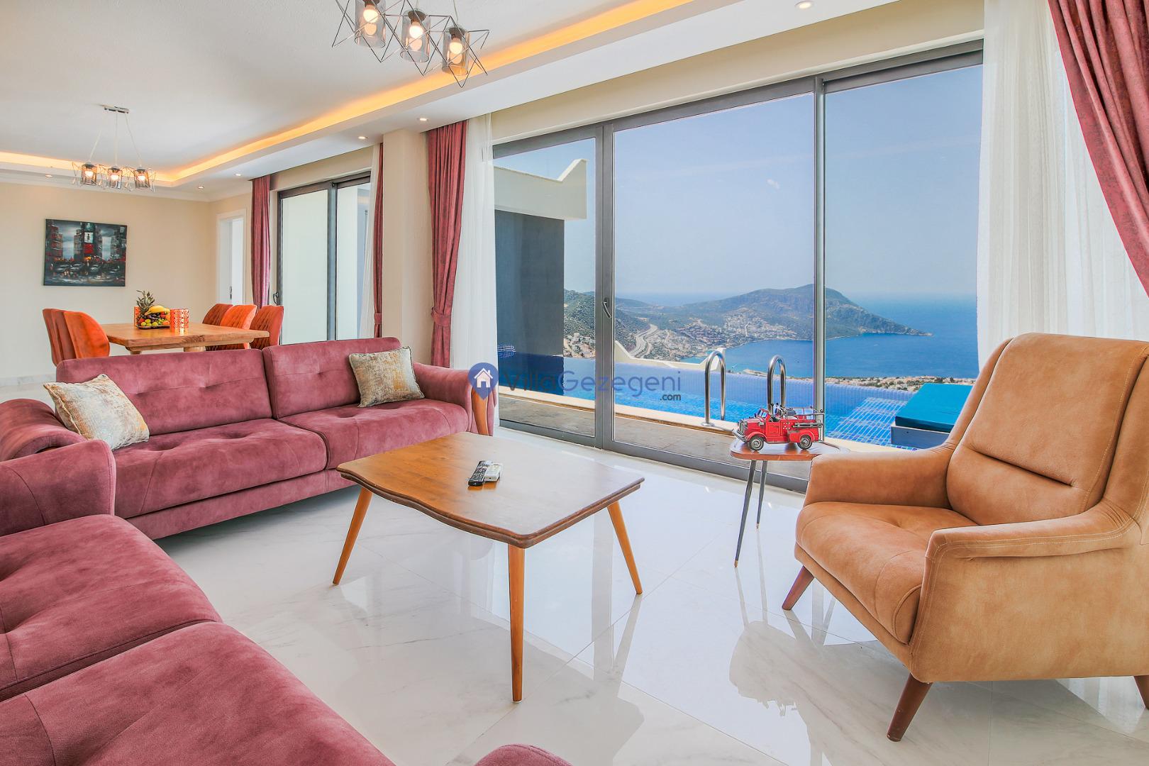 Kalkan merkeze yakın konumda bulunan lüks tasarıma sahip 3 yatak odalı ve deniz manzaralı kiralık tatil villası