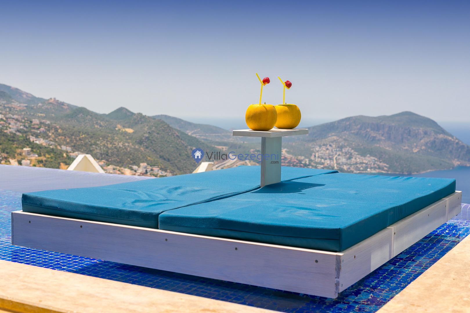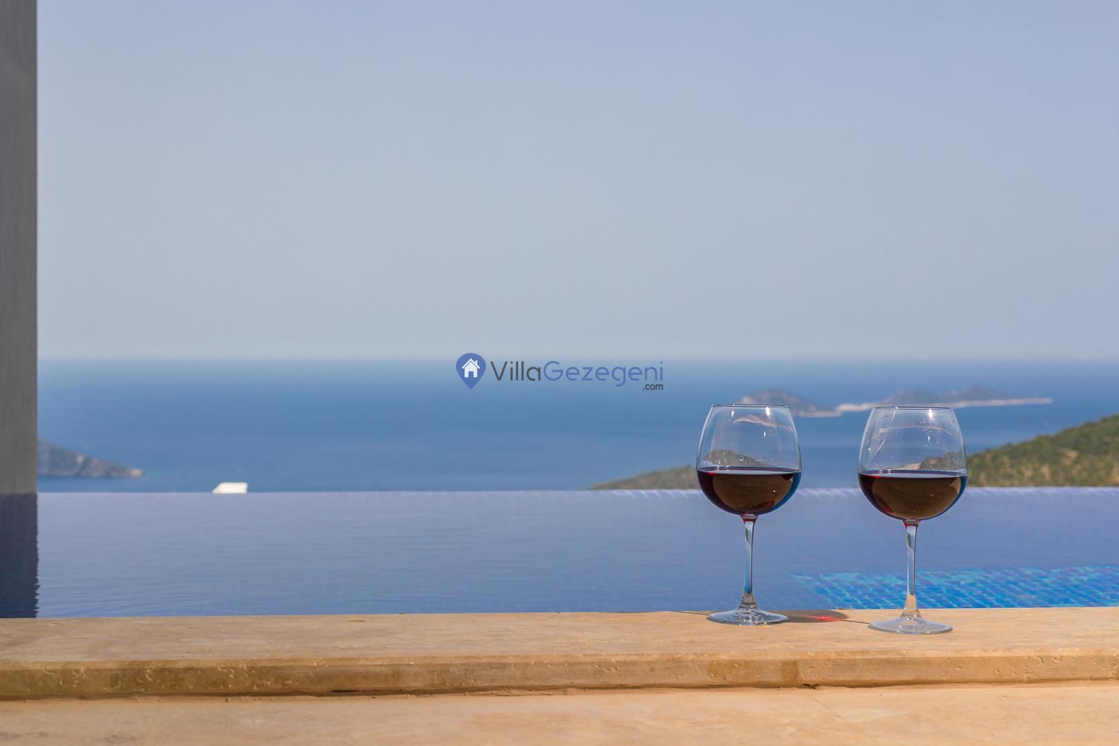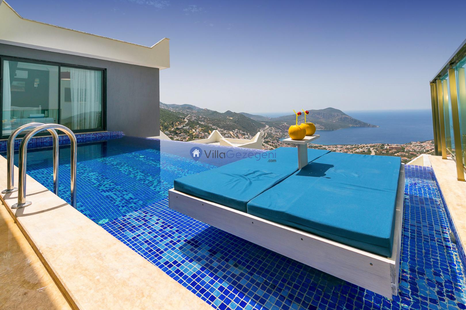 Kalkan Akbel mevkiinde bulunan deniz manzaralı ve sonsuzluk havuzlu muhafazakar balayı villası