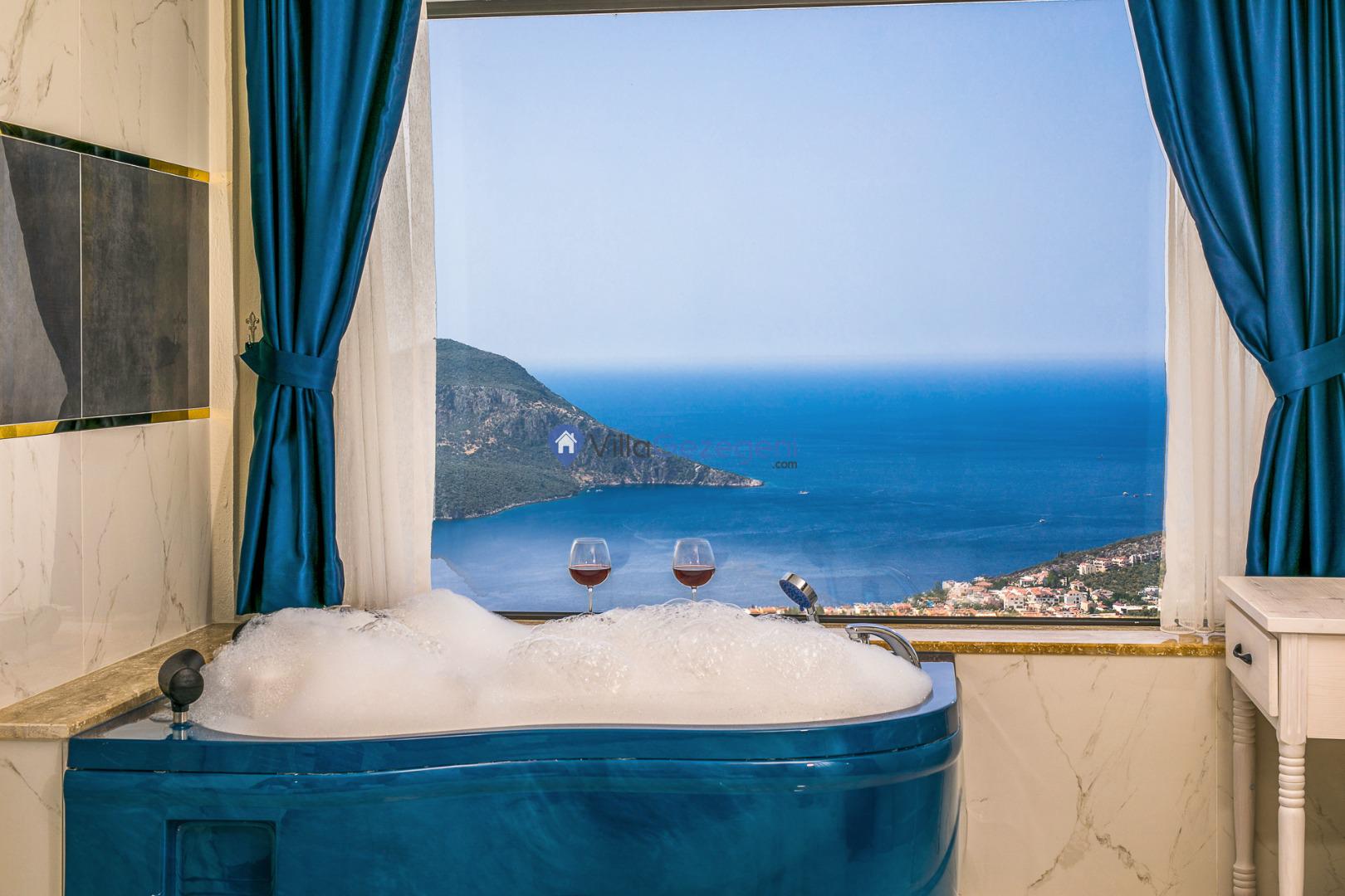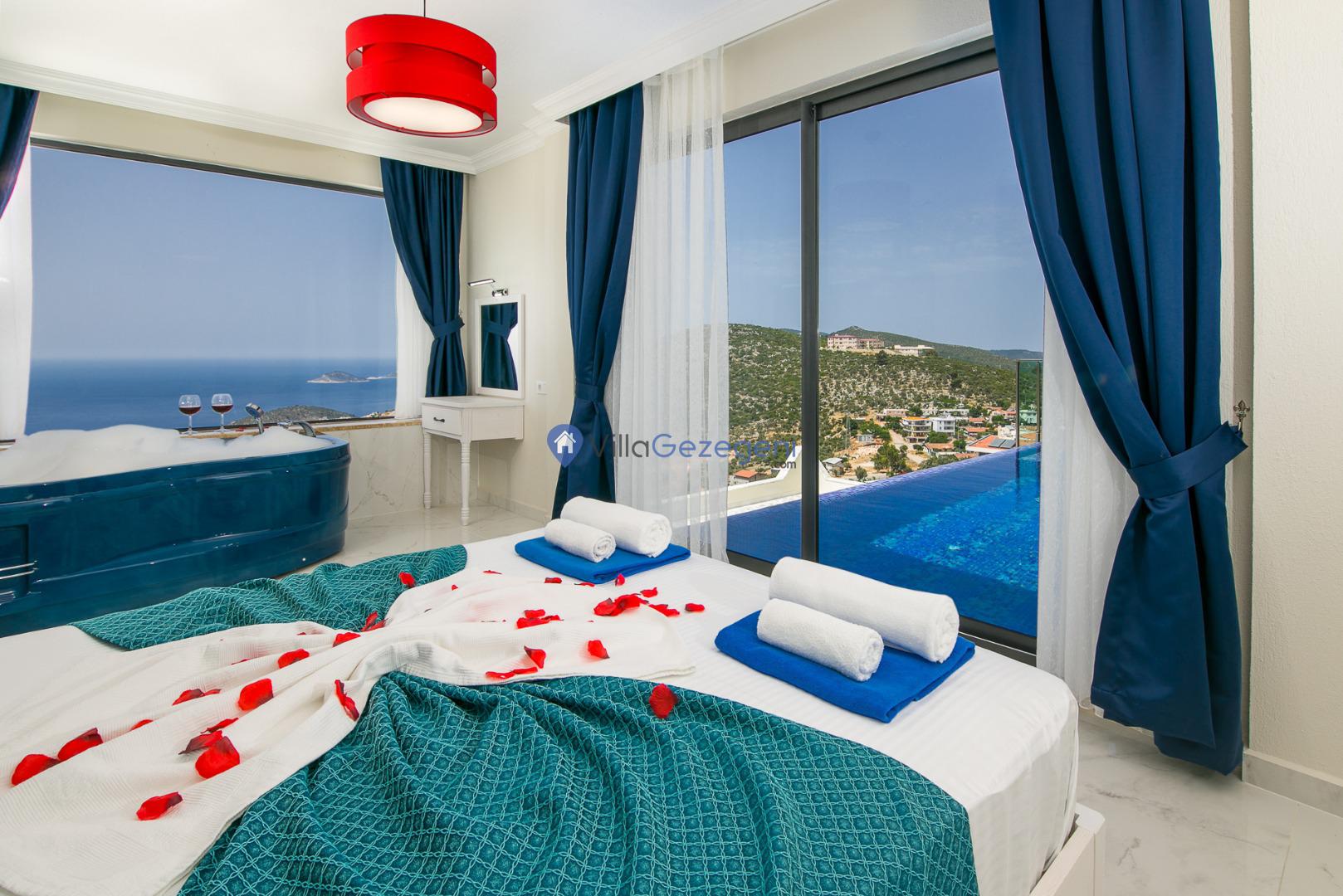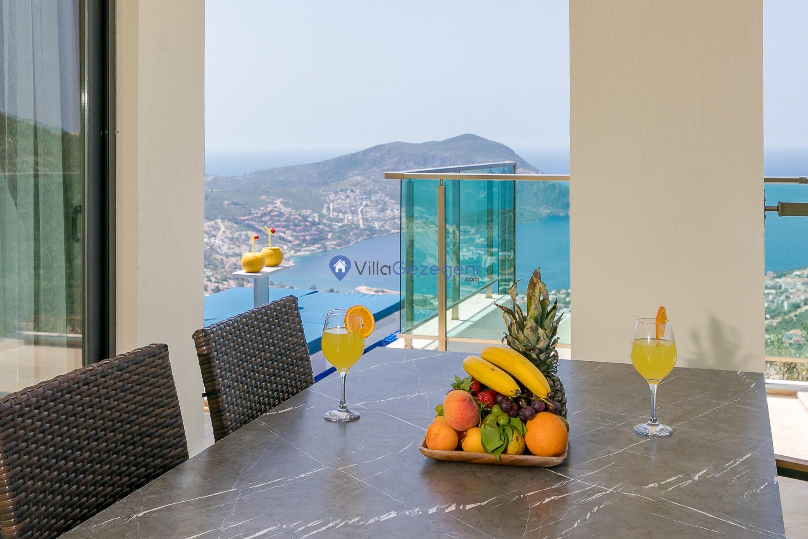 Kalkan Akbel mevkiinde bulunan deniz manzaralı ve sonsuzluk havuzlu muhafazakar balayı villası