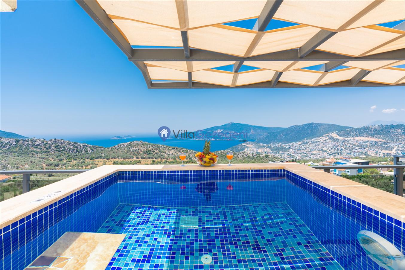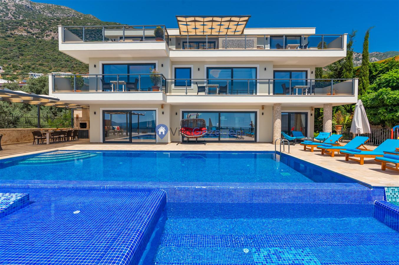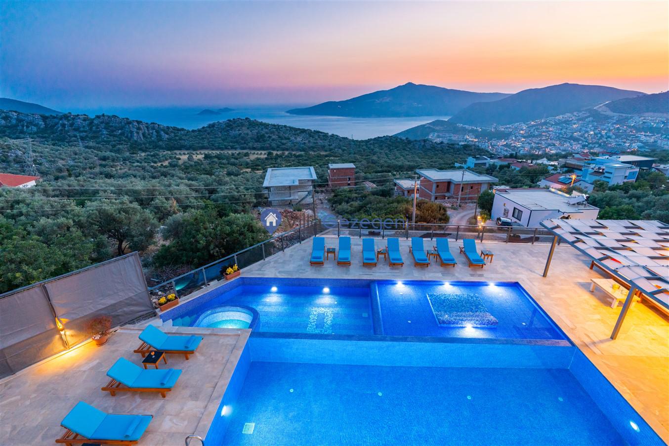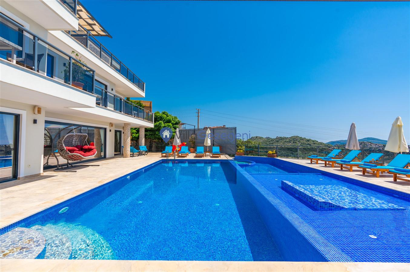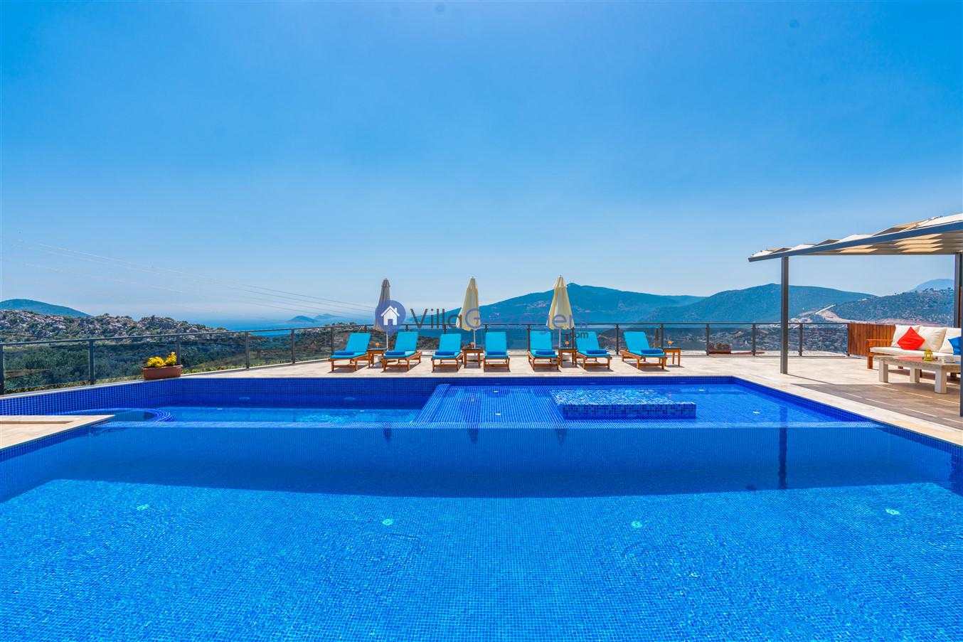 Villa Ela, Kalkan Akbel'de 12 kişilik, lüks, deniz manzaralı, jakuzili, ısıtmalı havuzlu, markete yakın, kiralık geniş aile ve arkadaş grubu villası.